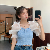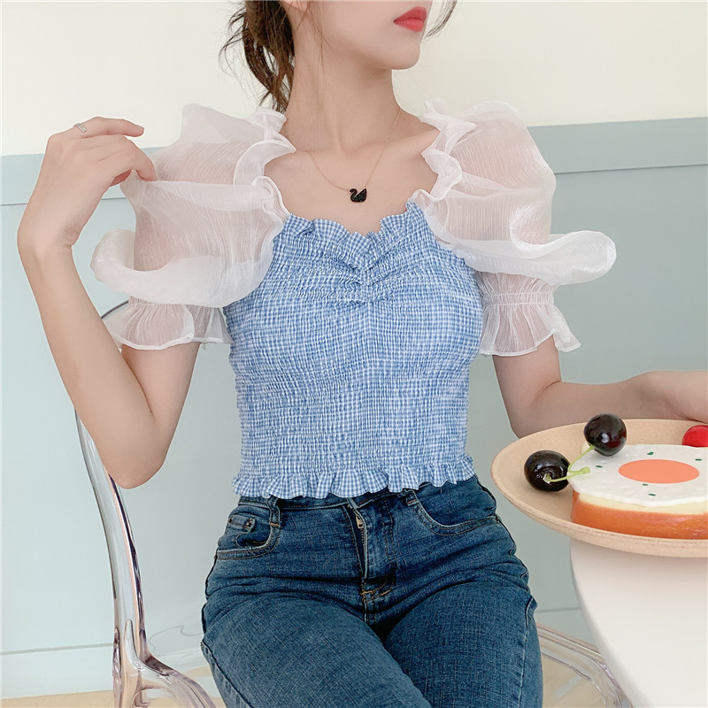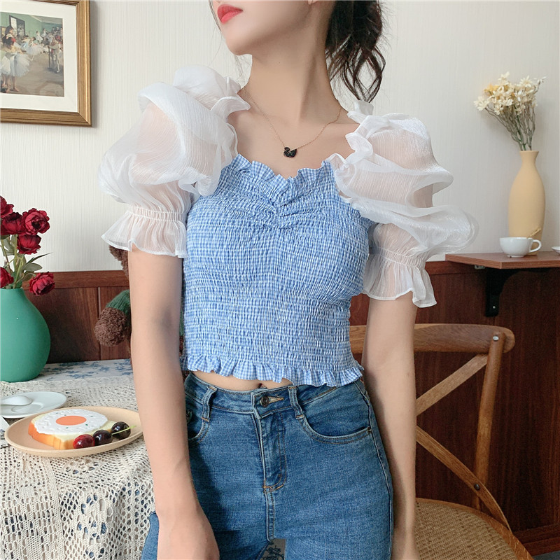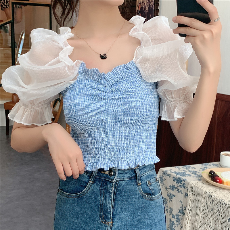 Летняя короткая дизайнерская рубашка, 2020, французский стиль, квадратный вырез, тренд сезона, рукава фонарики, большой размер