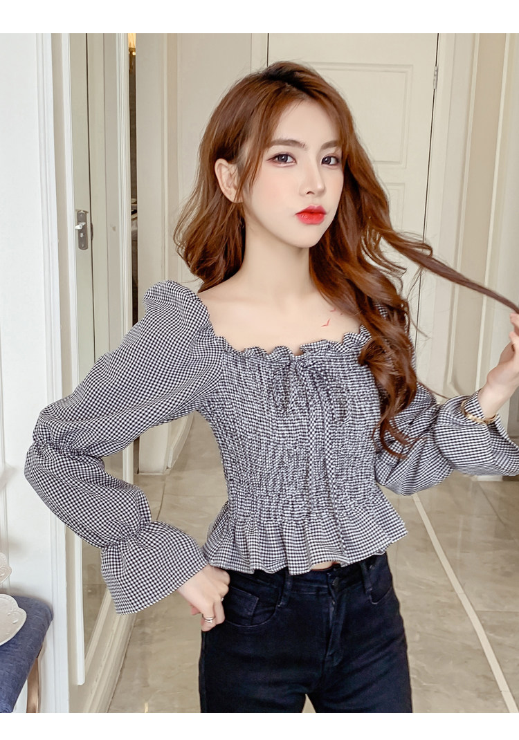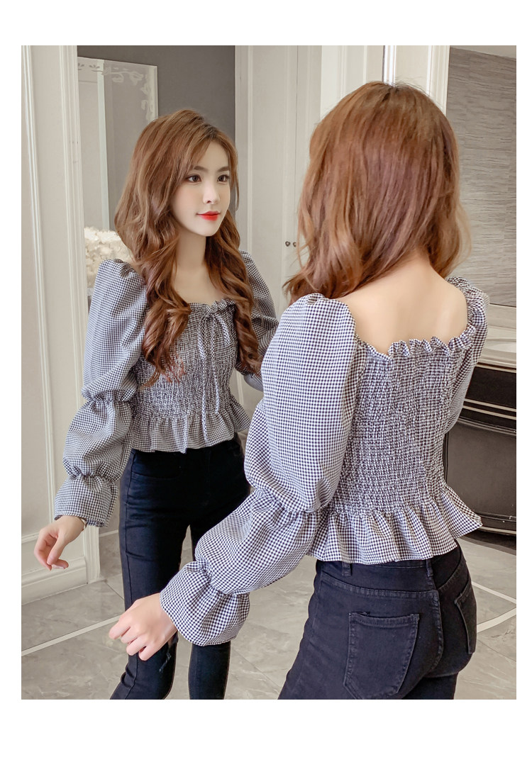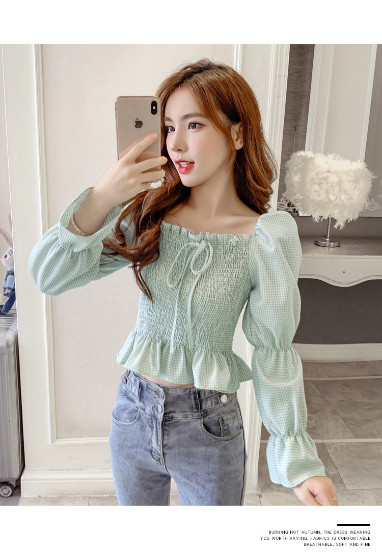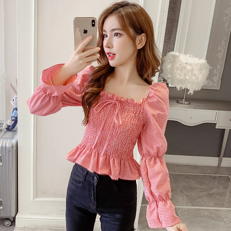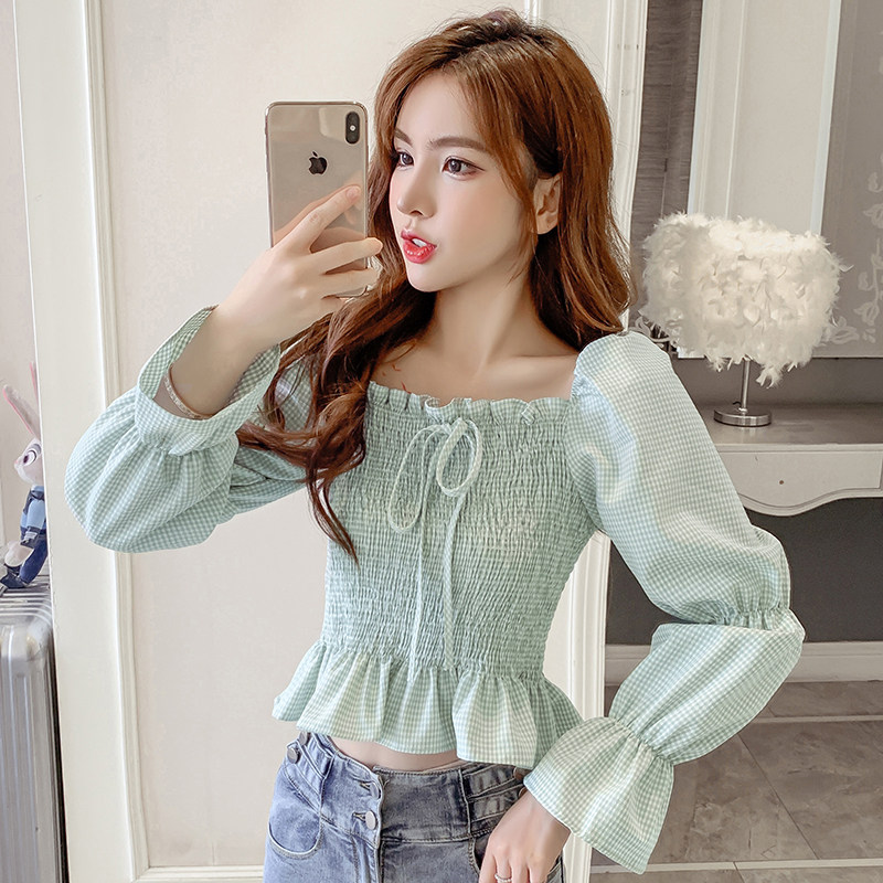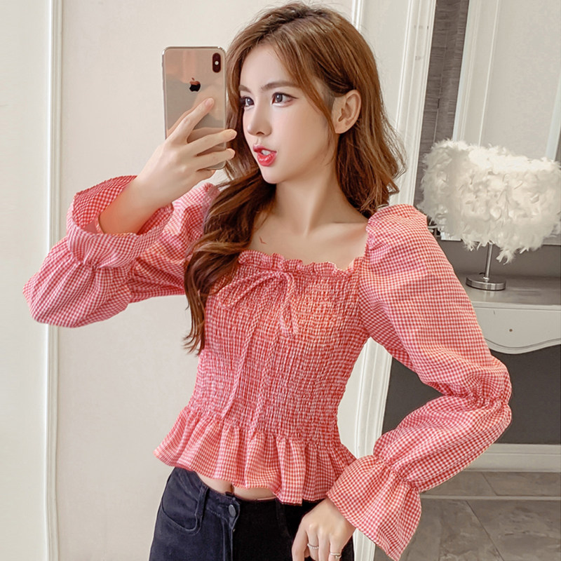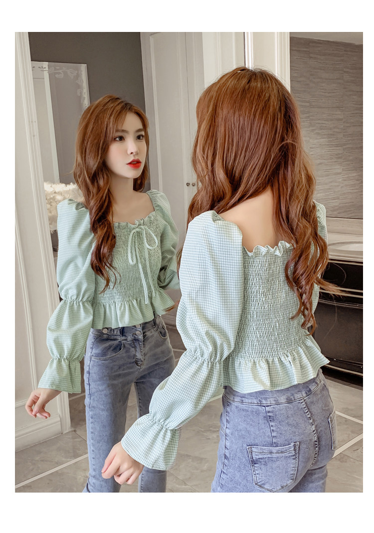 Ретро рубашка, весенний лонгслив, короткий корсет, французский стиль, квадратный вырез, рукава фонарики, облегающий крой, в западном стиле