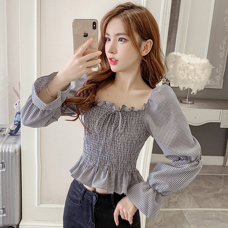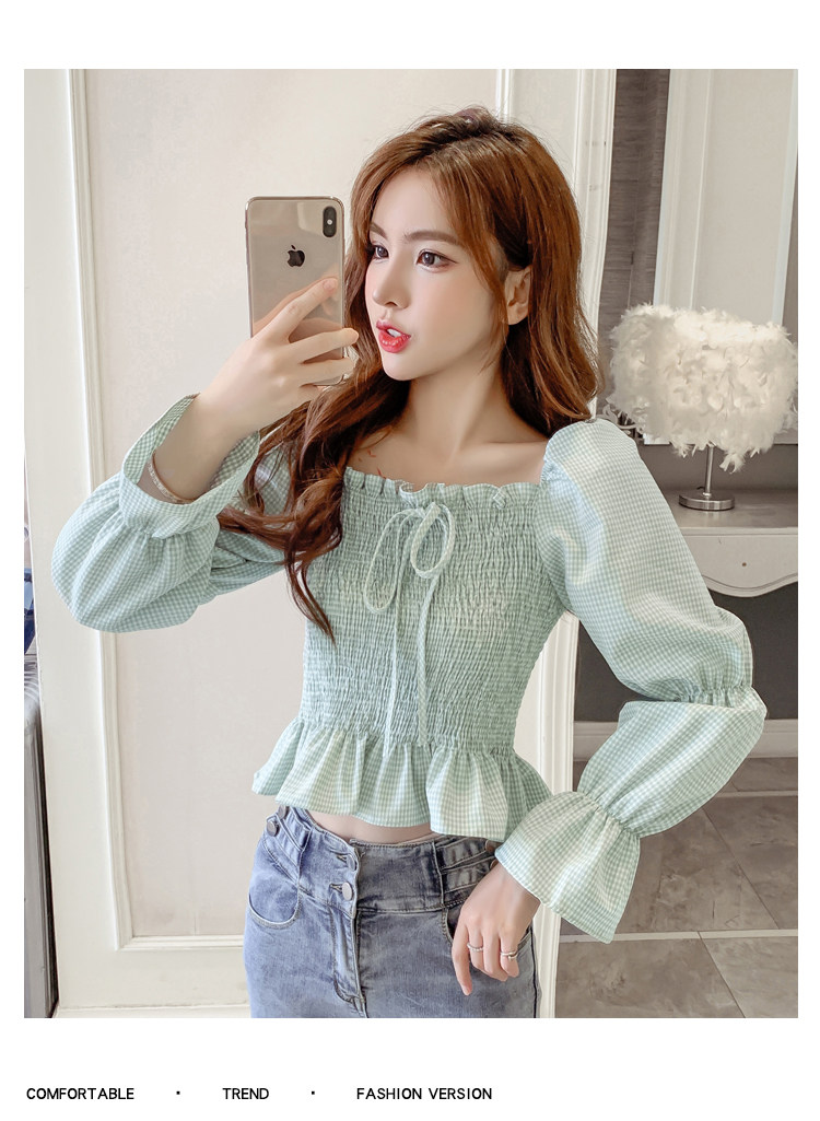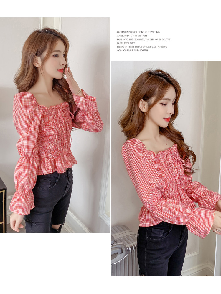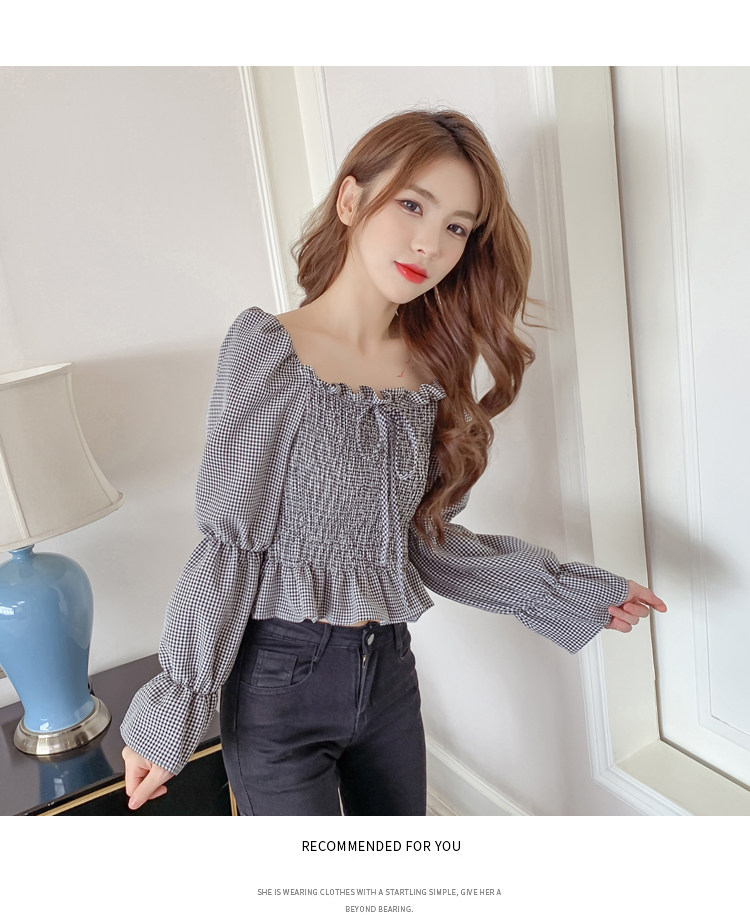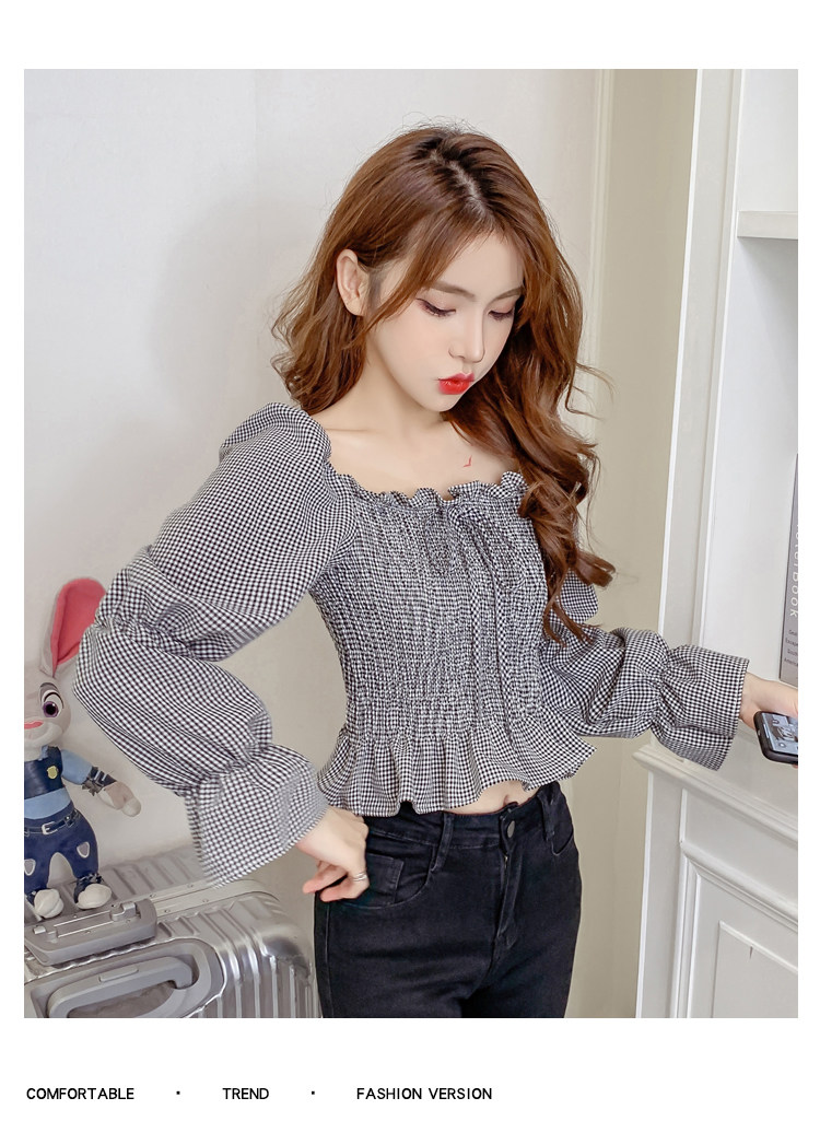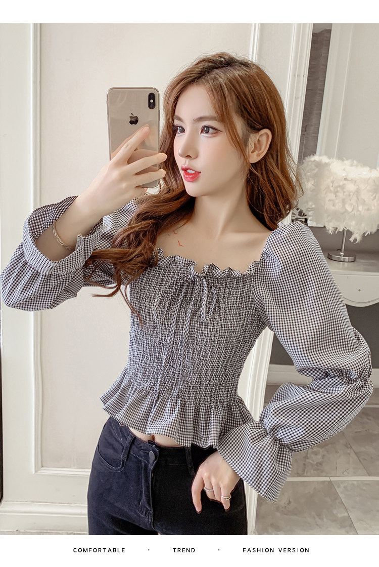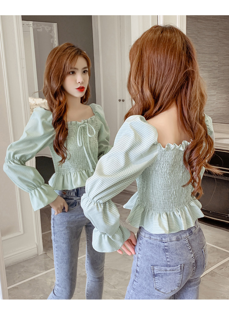 Ретро рубашка, весенний лонгслив, короткий корсет, французский стиль, квадратный вырез, рукава фонарики, облегающий крой, в западном стиле