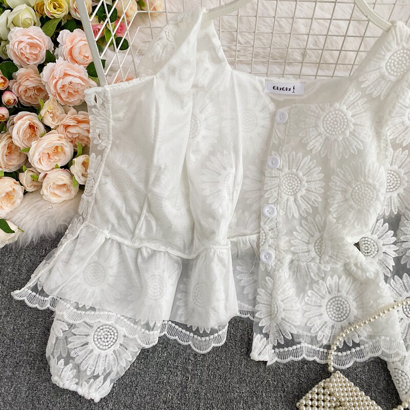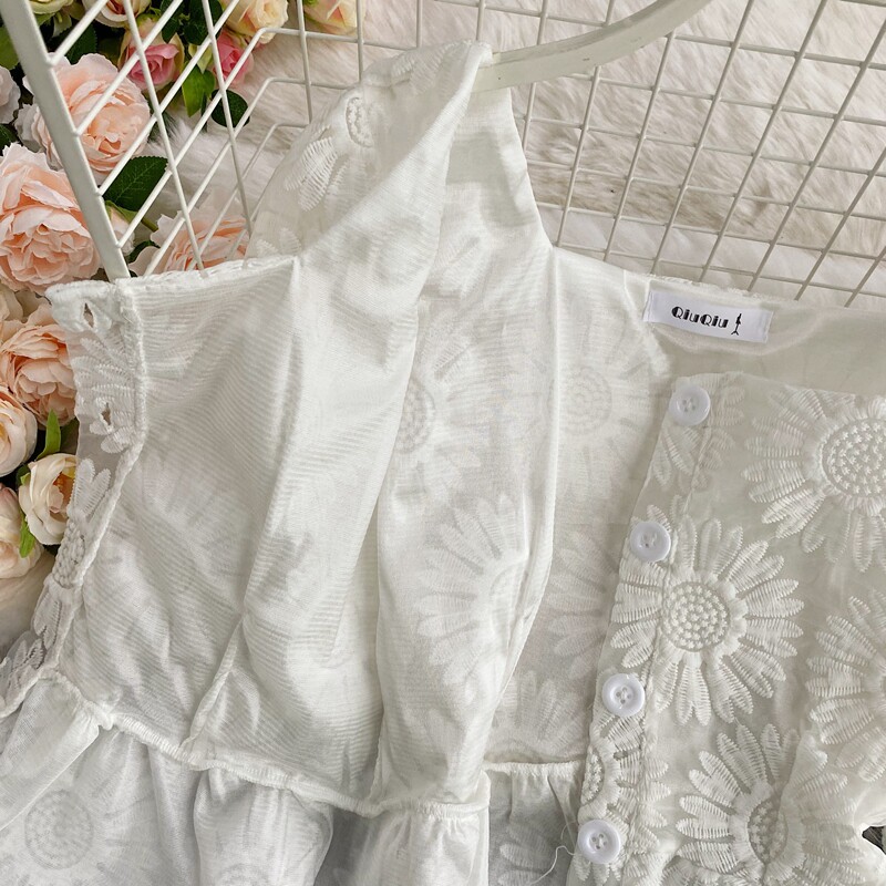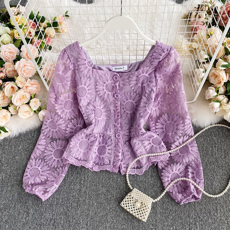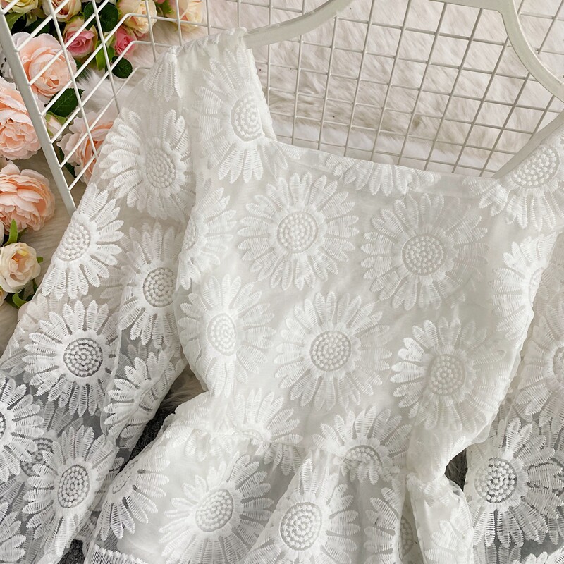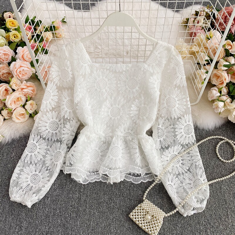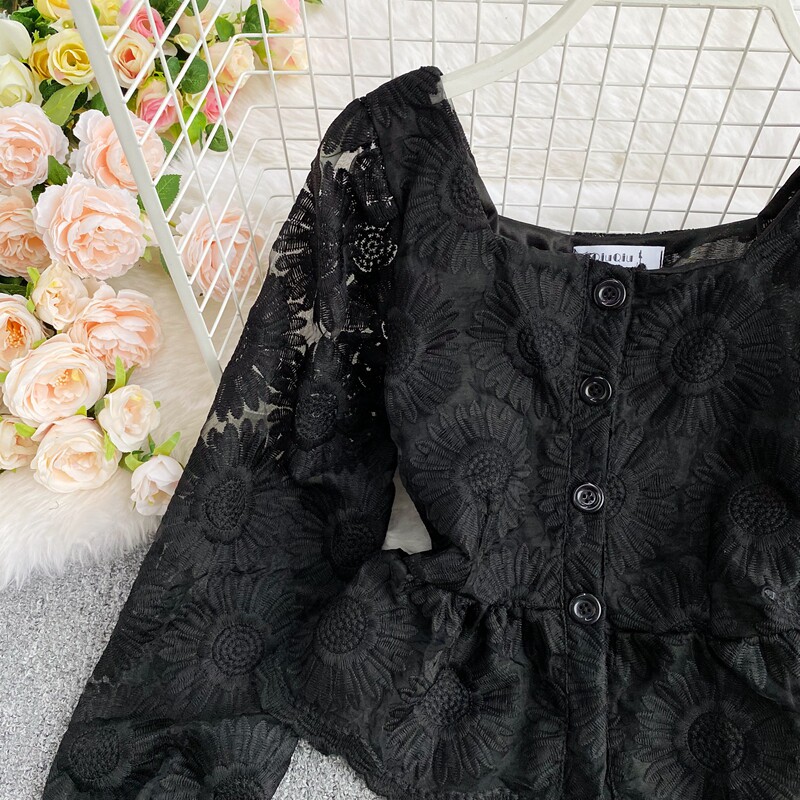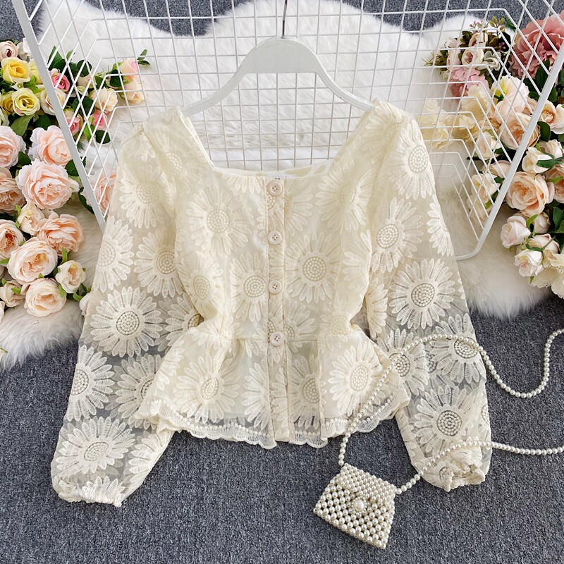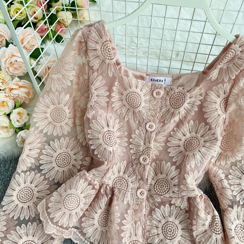 Осенняя приталенная рубашка, французский стиль, с вышивкой, в цветочек, квадратный вырез, короткий рукав, коллекция 2021, высокая талия