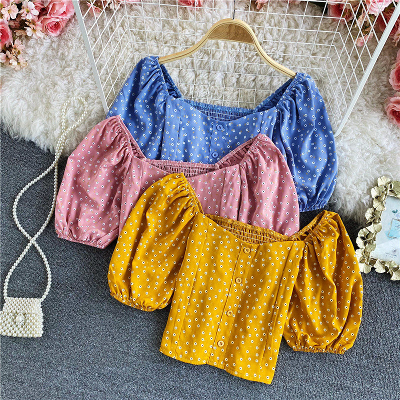 Летняя приталенная модная рубашка, ретро короткая футболка, короткий рукав, в западном стиле, французский стиль, квадратный вырез, рукава фонарики