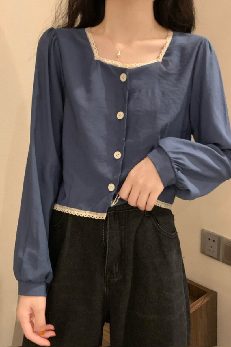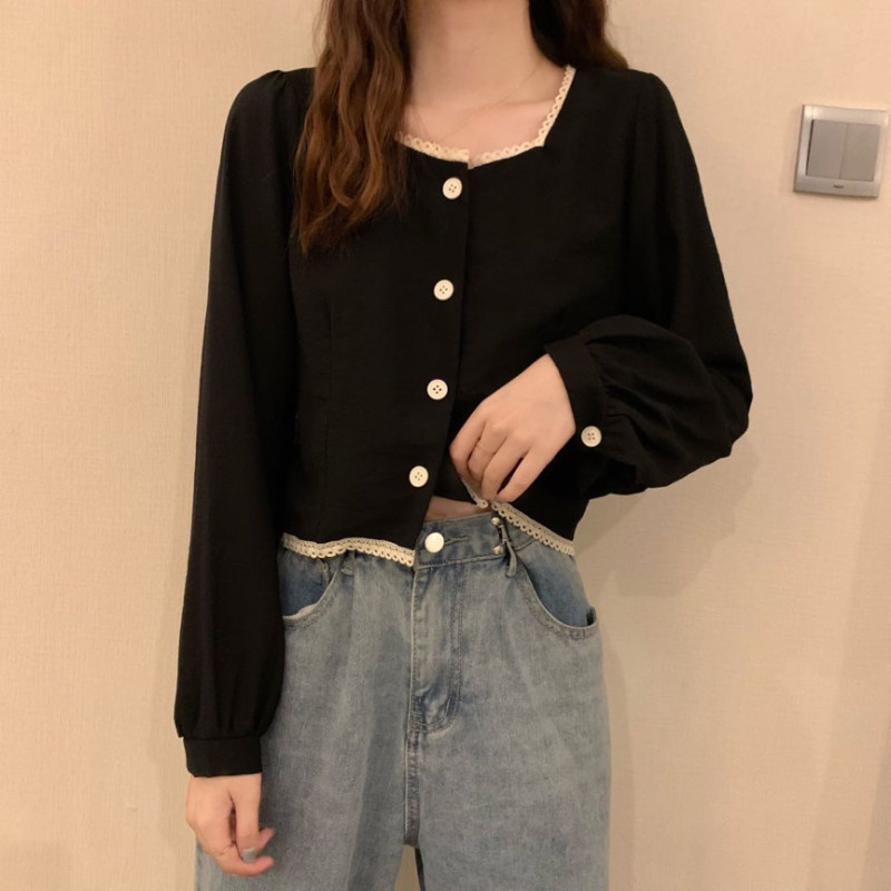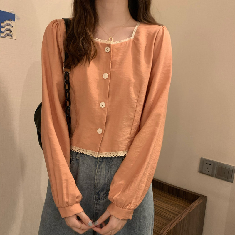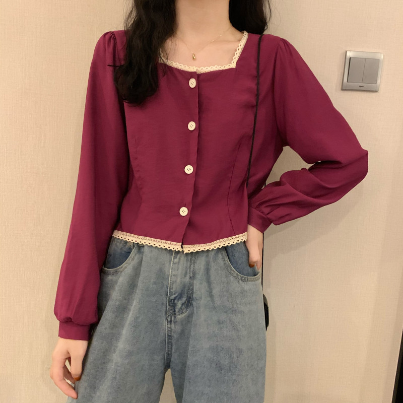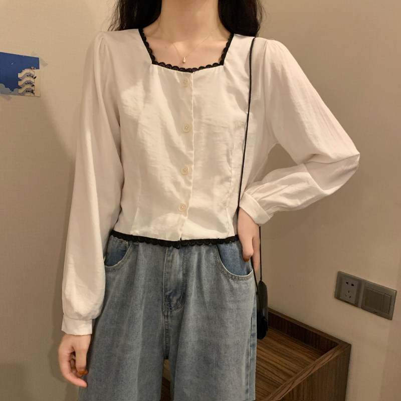 Осенняя рубашка, короткий лонгслив, коллекция 2022, французский стиль, квадратный вырез, свободный крой