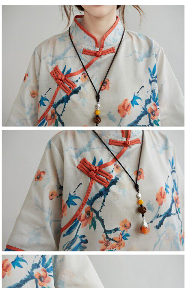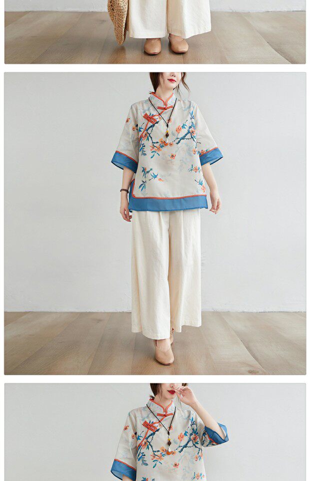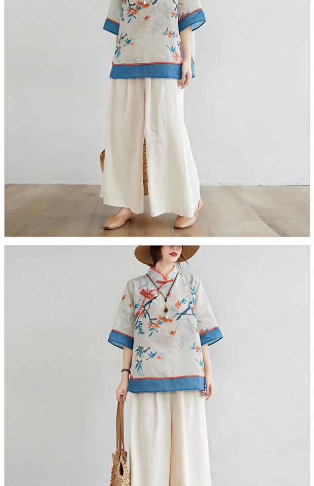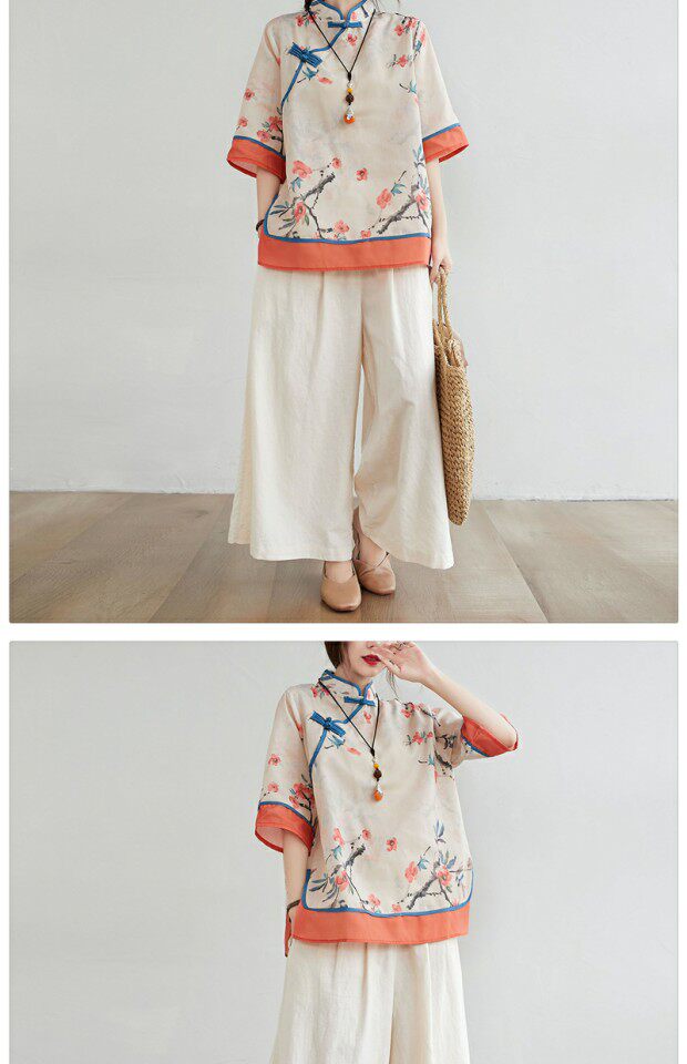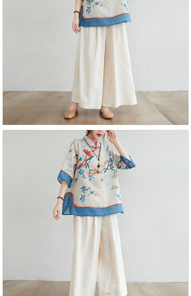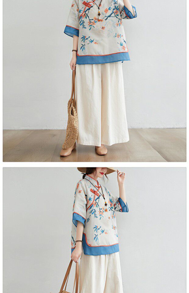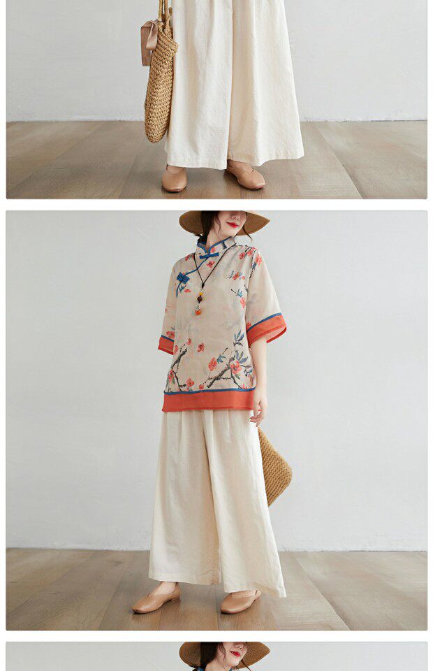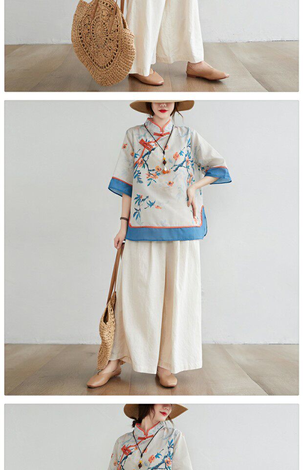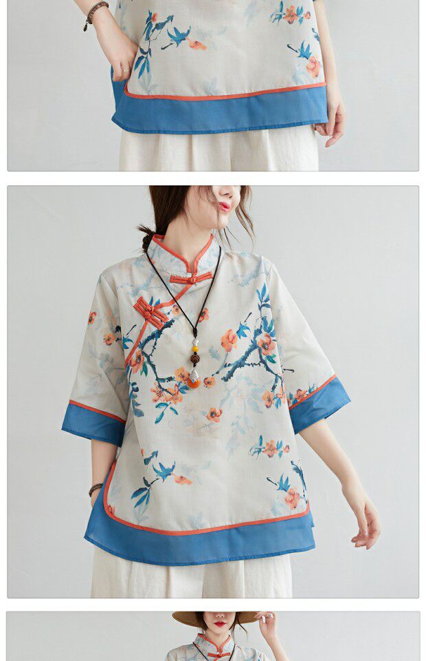 Рубашка размера плюс, толстые миллиметры, женская ретро-этническая рубашка с воротником-стойкой на пуговицах и возрастом, рубашка с принтом, новый летний топ из хлопка и льна