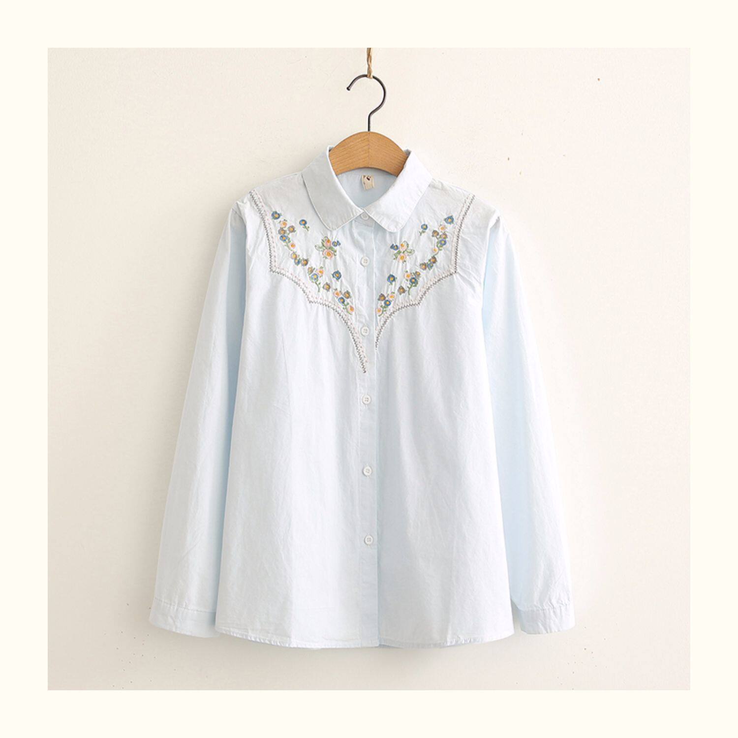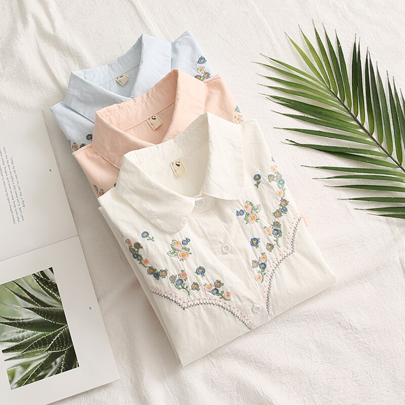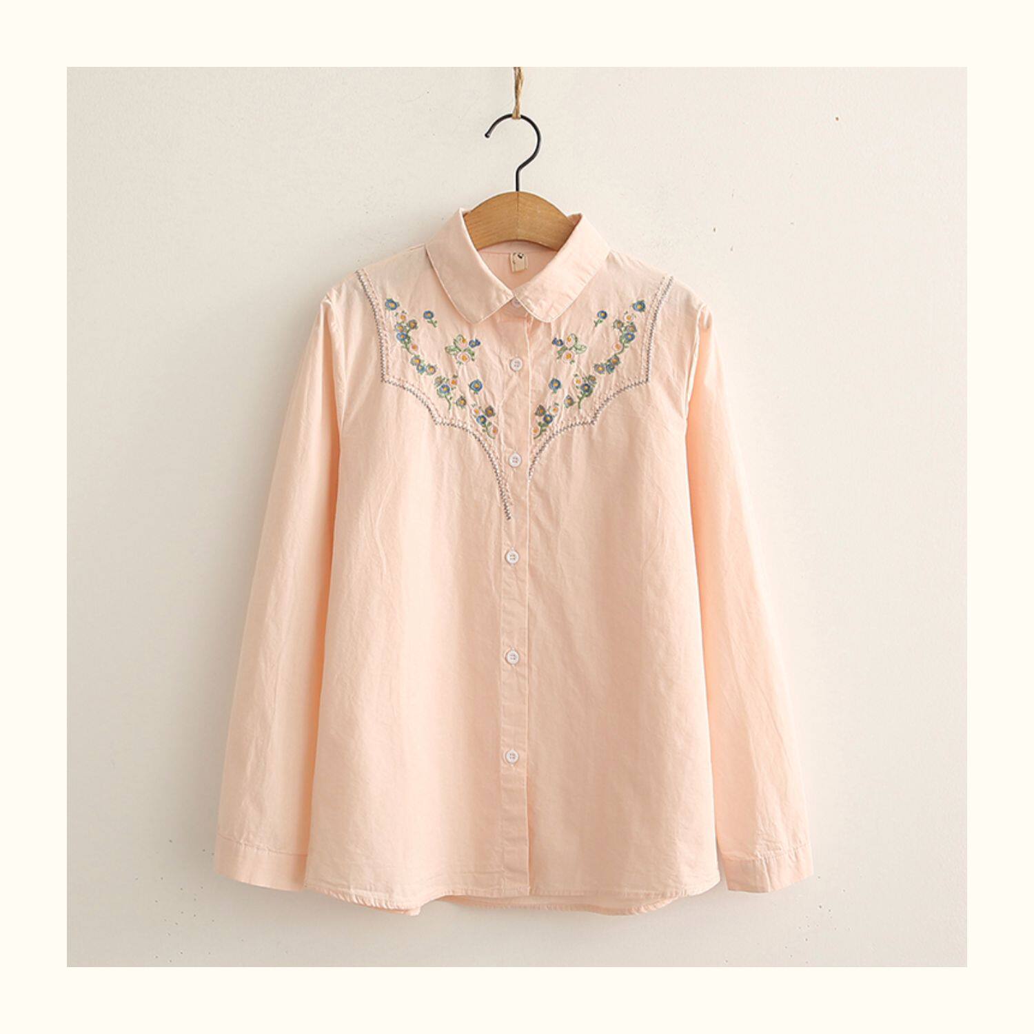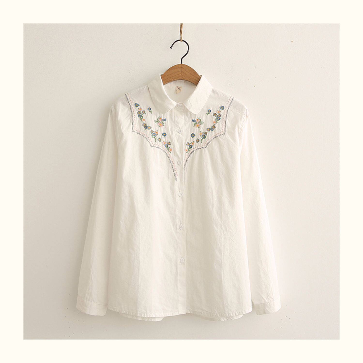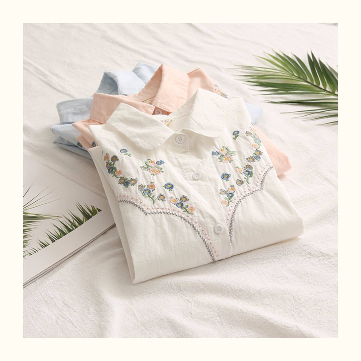 Весенняя свежая хлопковая рубашка, лонгслив, коллекция 2021, цветочный принт, с вышивкой, свободный крой
