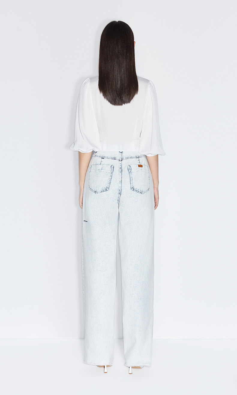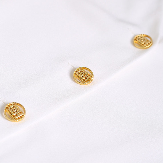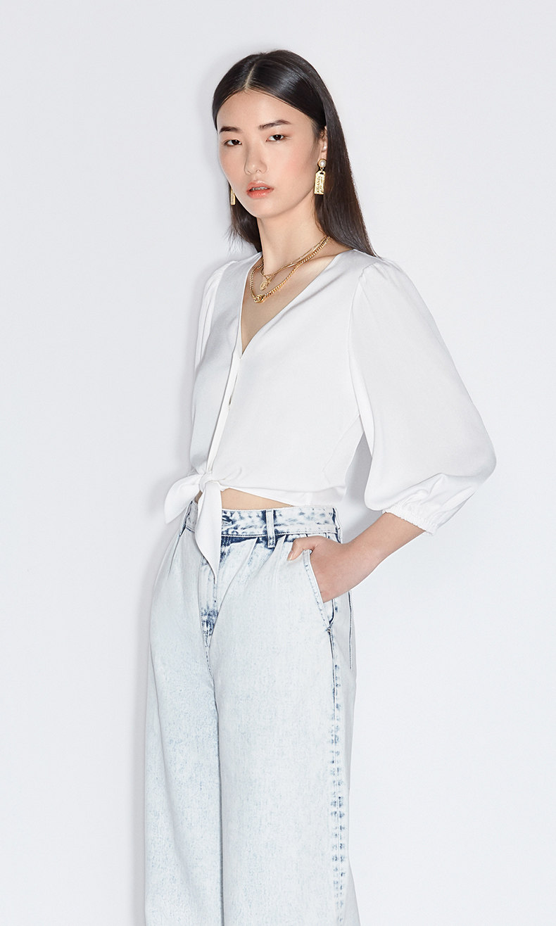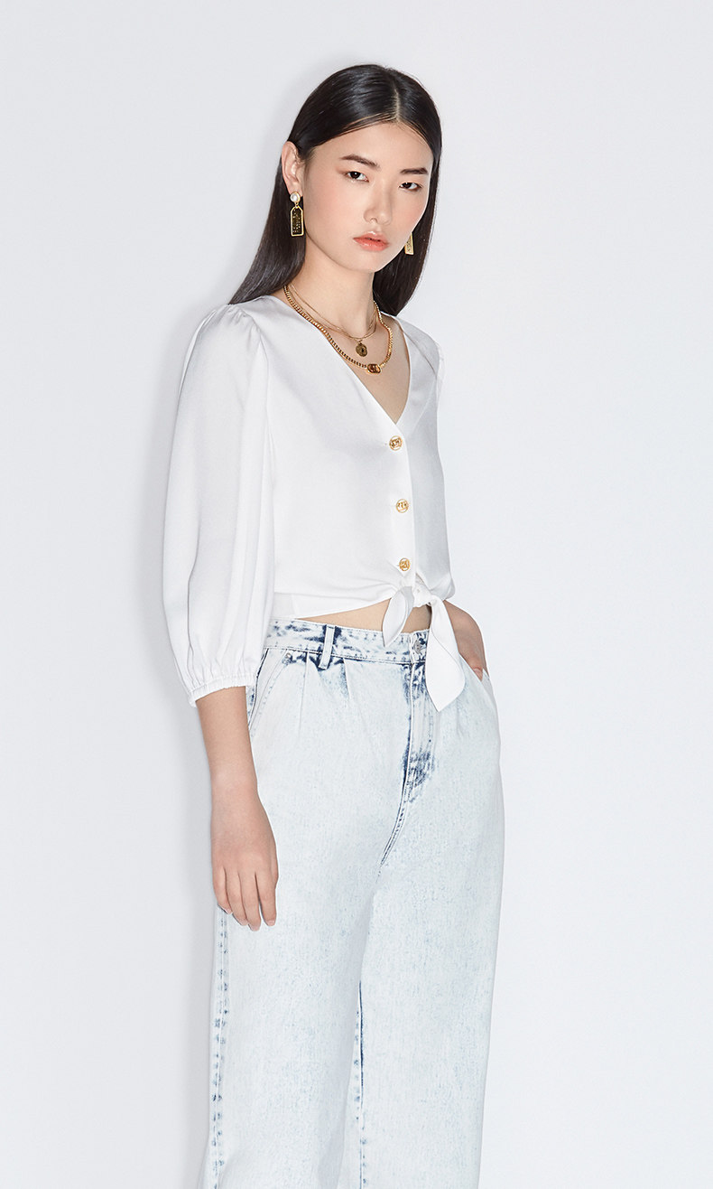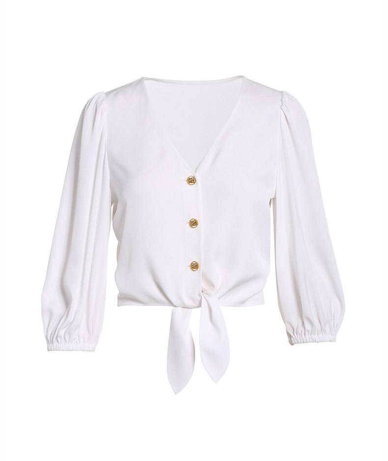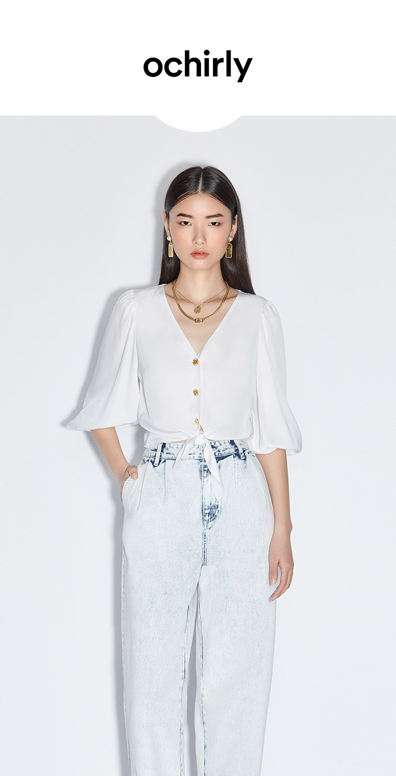 [Та же модель торгового центра] OU Shili Новые летние фонарики для фонарей манжеты V -Line -collar -стиль Short -Sleeved Satin Shirt