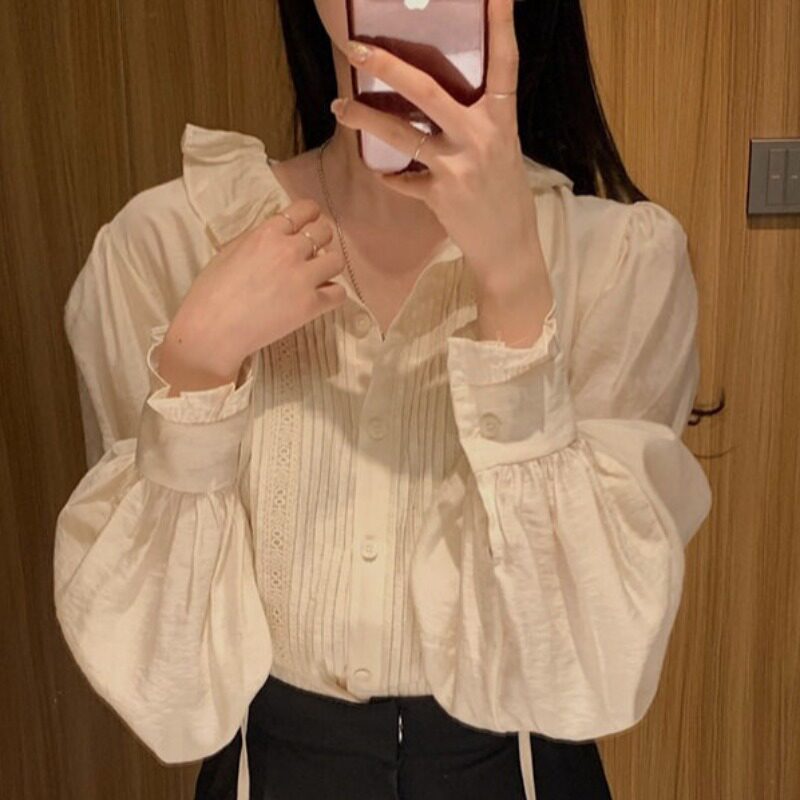 Корейский стиль шикарные французские листовые воротницы кружевную рубашку с сплайдером с длинным рукавом для женщин в летнем топе моды нежного темперамента