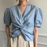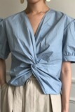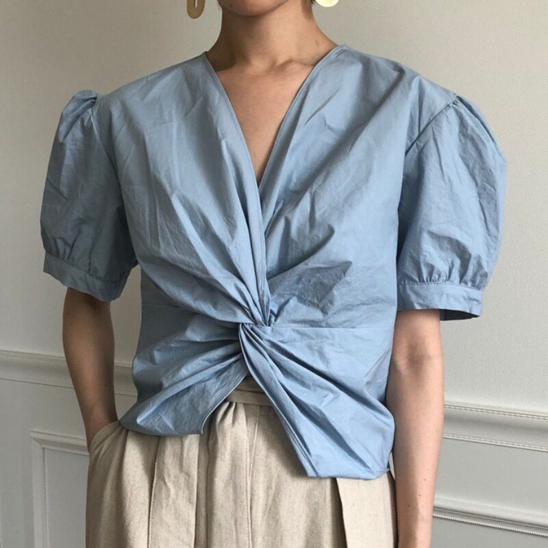 Дизайнерская летняя рубашка, тренд сезона, свободный крой, рукава фонарики, V-образный вырез