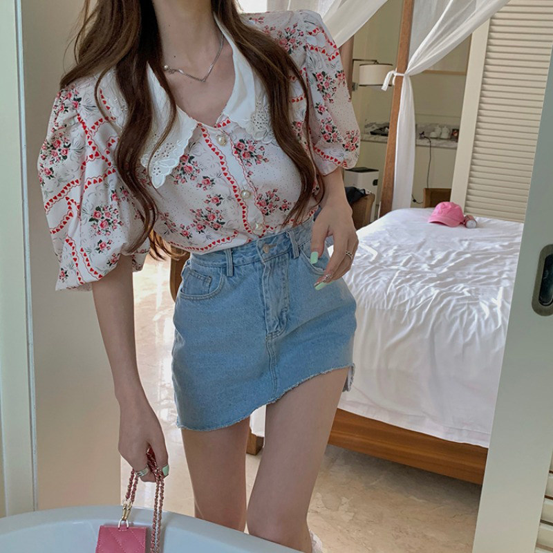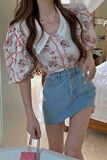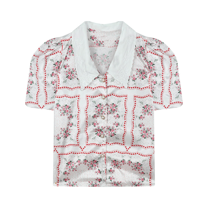 Ретро летняя рубашка, короткая кружевная футболка, французский стиль, цветочный принт, рукава фонарики, короткий рукав