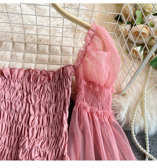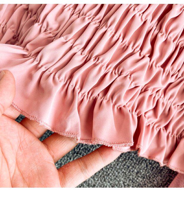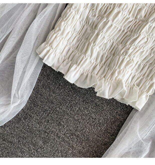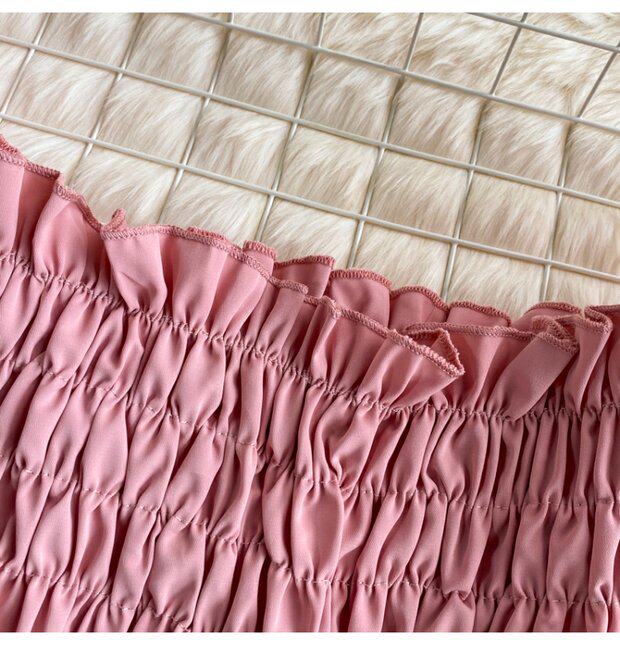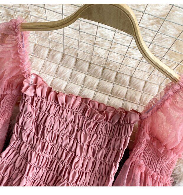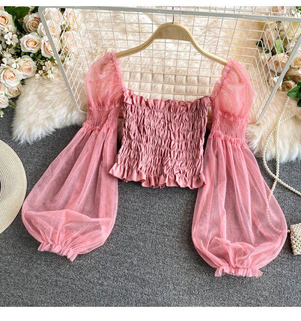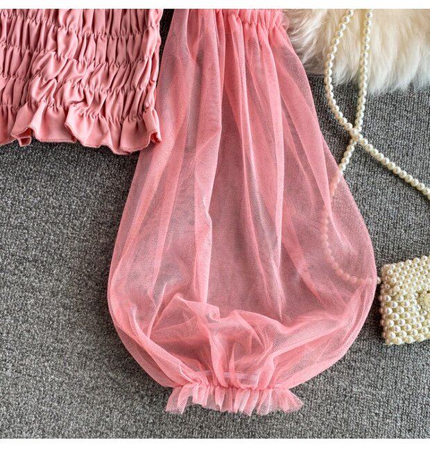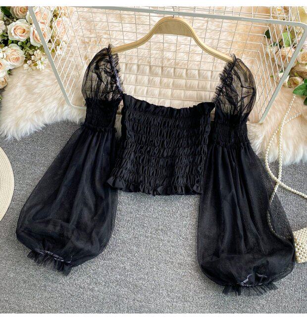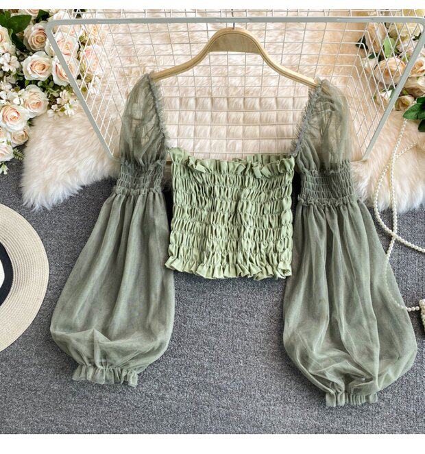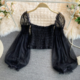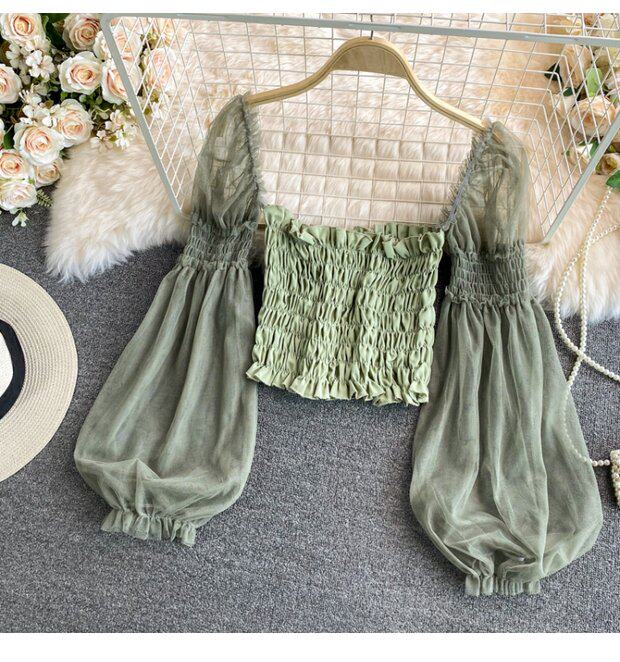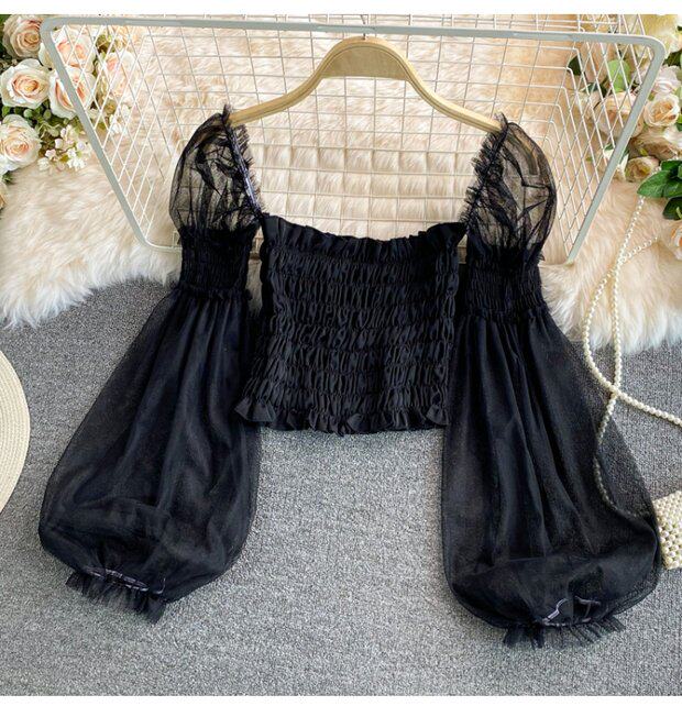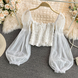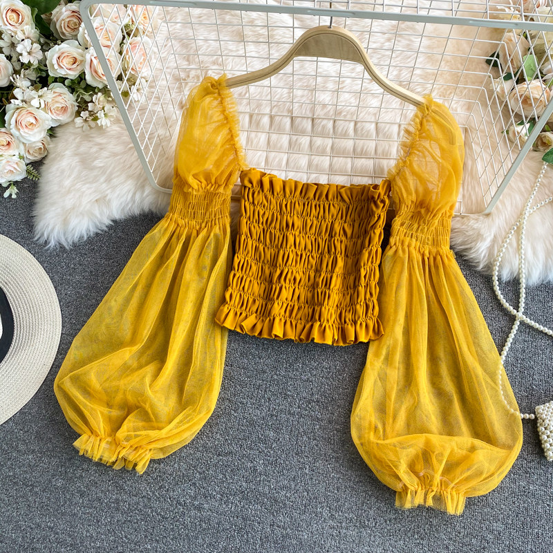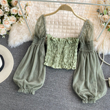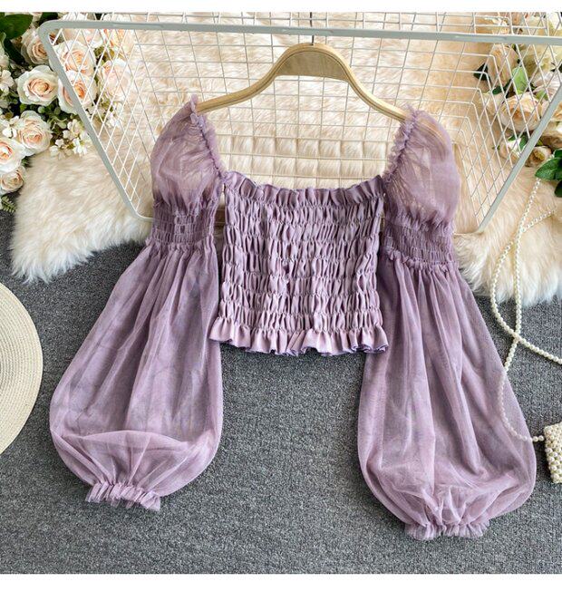 Новый летний стиль 2023, супер-волшебная и милая шифоновая рубашка с квадратным вырезом и открытыми плечами, рукавами-фонариками, высокой талией и коротким топом, обнажающим пупок.