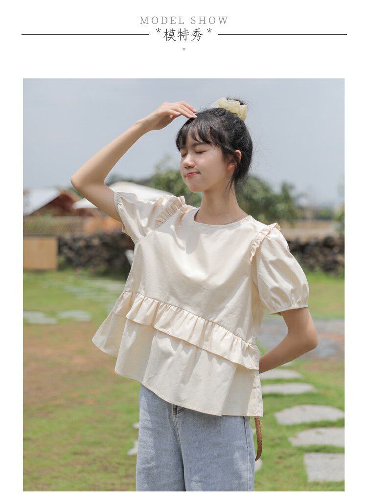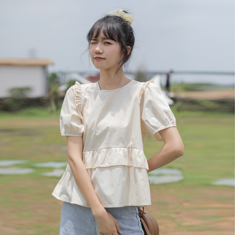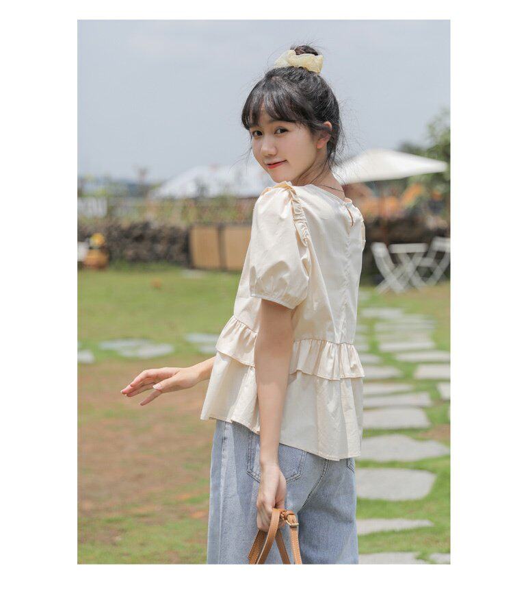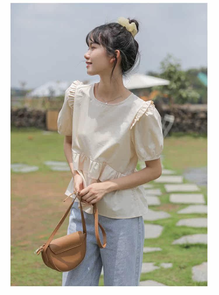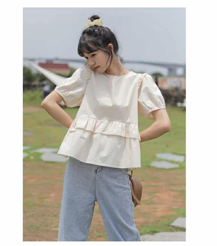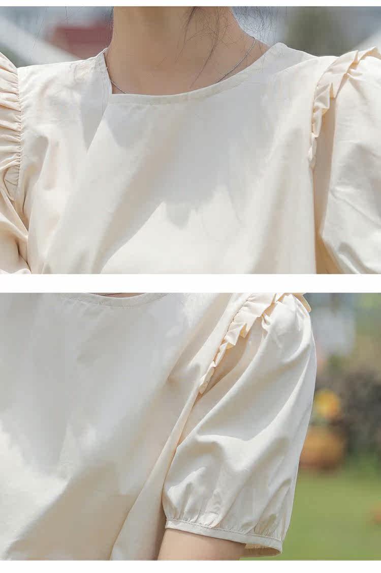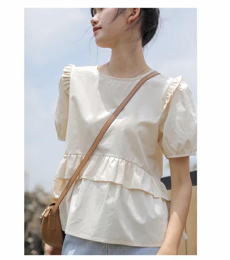 Рубашка с круглым воротником, дизайнерская летняя одежда, футболка, рукава фонарики, тренд сезона, короткий рукав, французский стиль