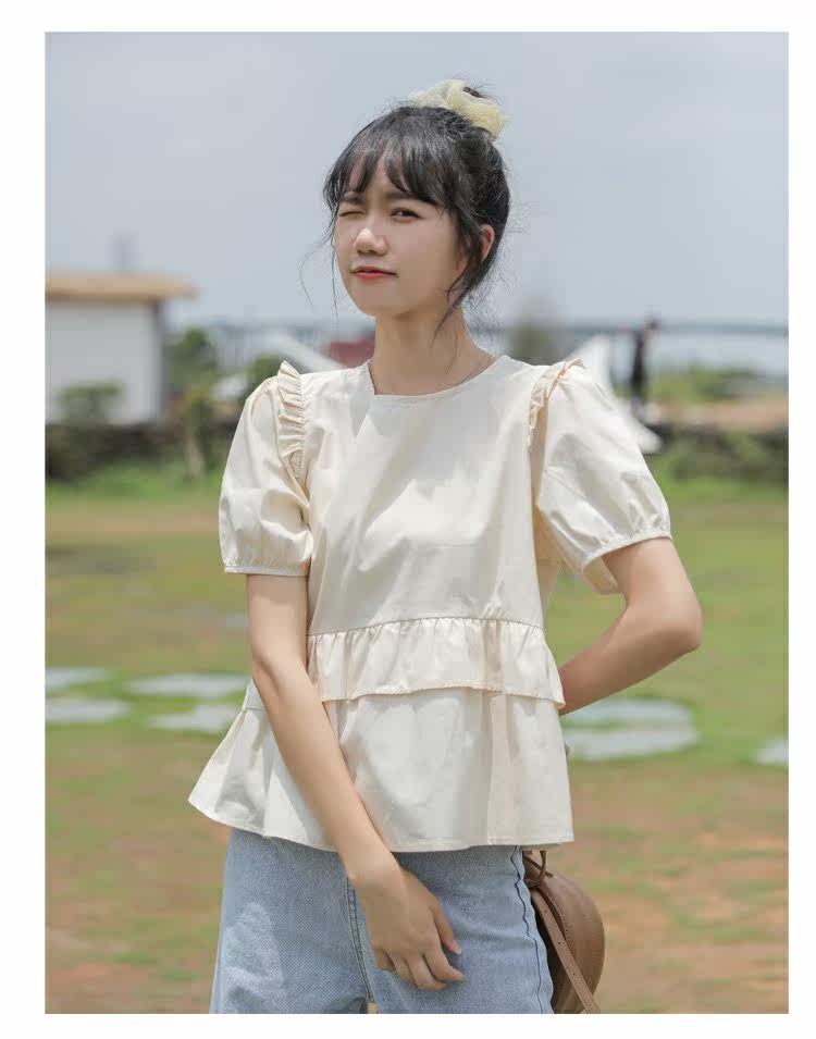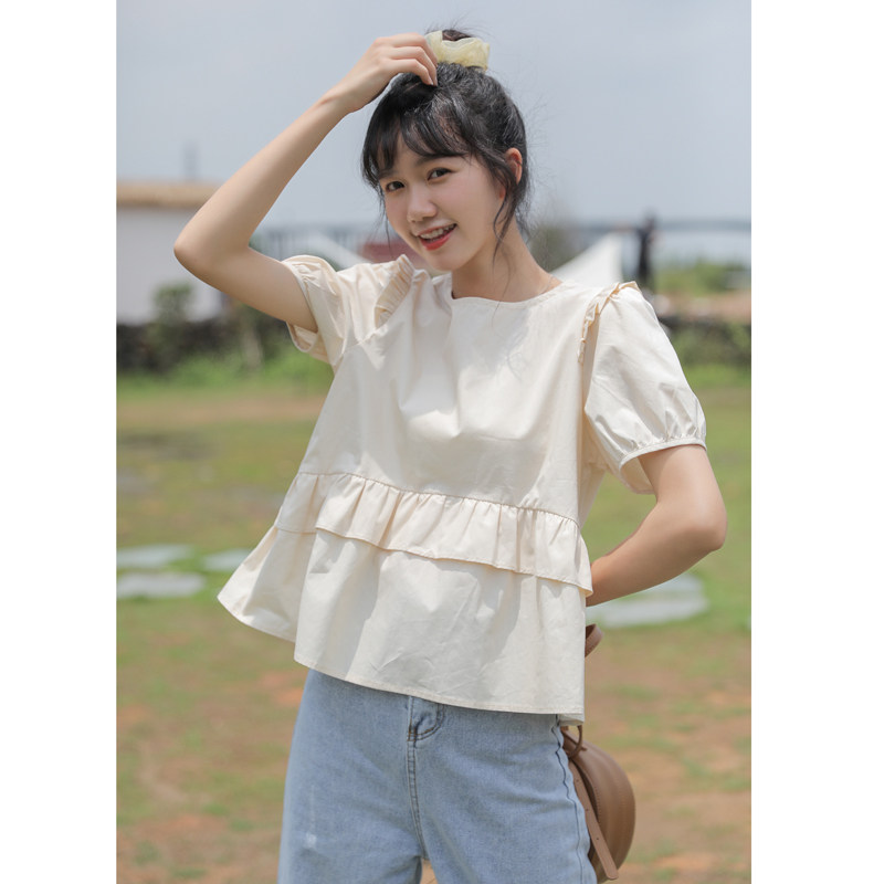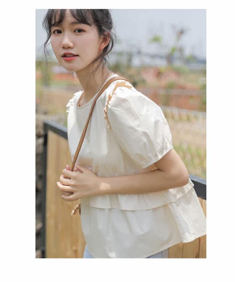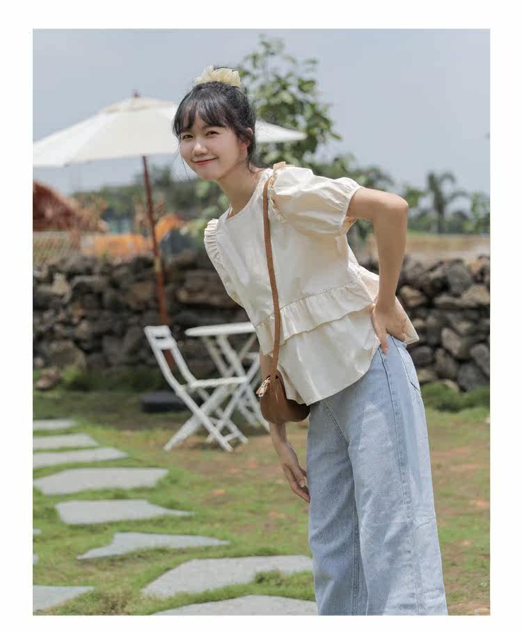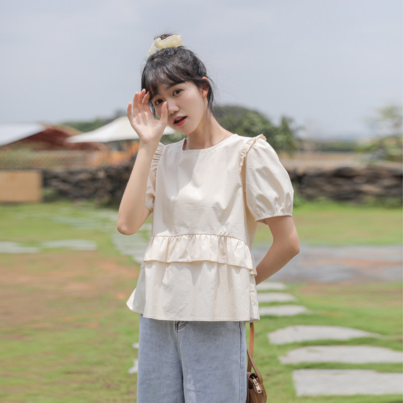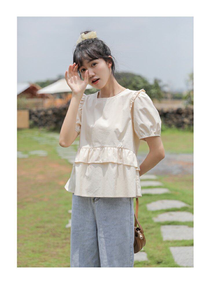 Рубашка с круглым воротником, дизайнерская летняя одежда, футболка, рукава фонарики, тренд сезона, короткий рукав, французский стиль