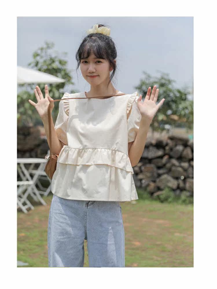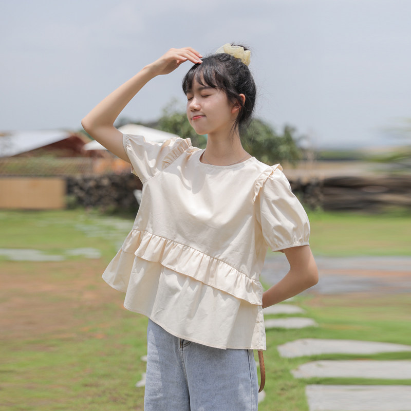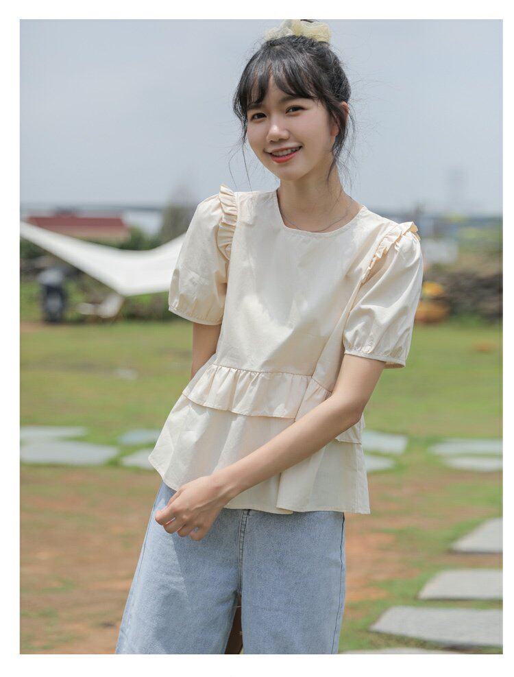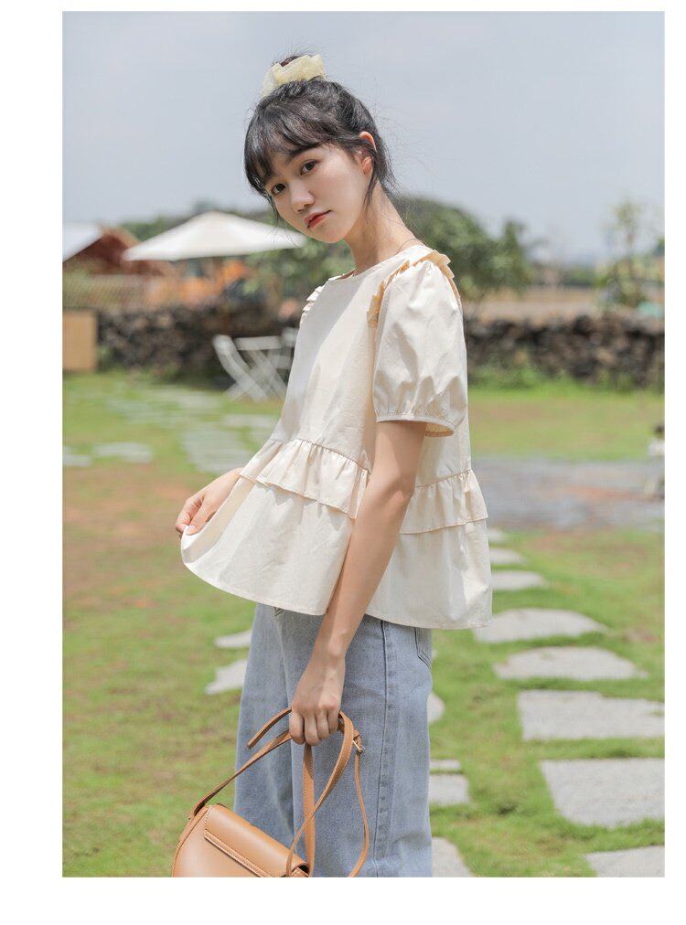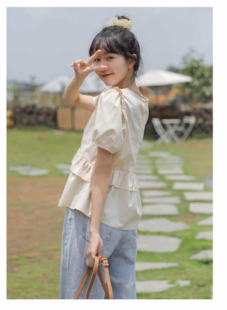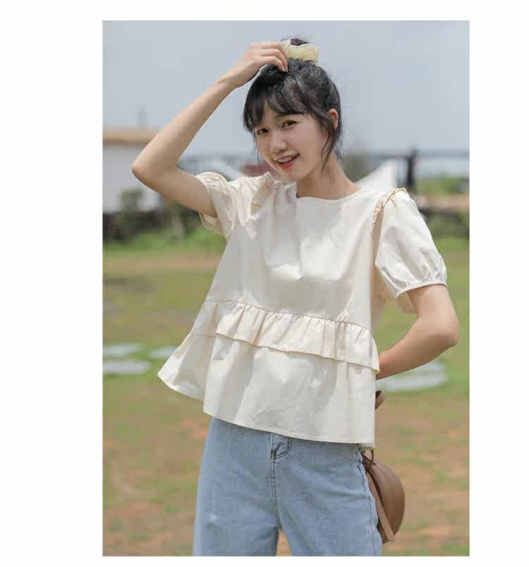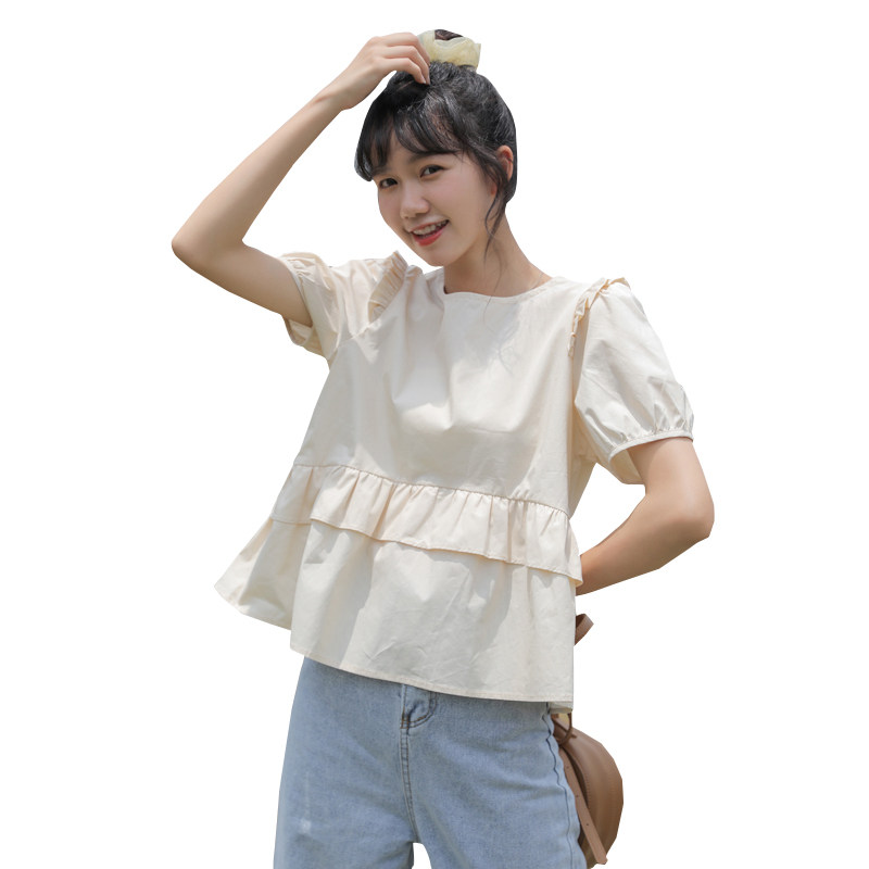 Рубашка с круглым воротником, дизайнерская летняя одежда, футболка, рукава фонарики, тренд сезона, короткий рукав, французский стиль