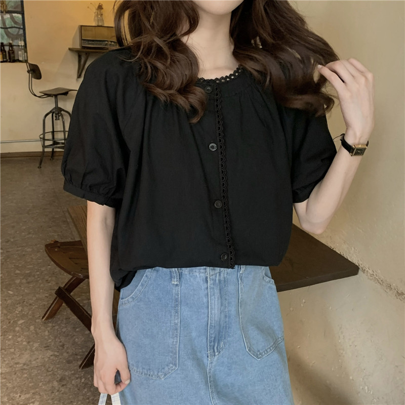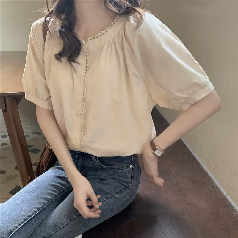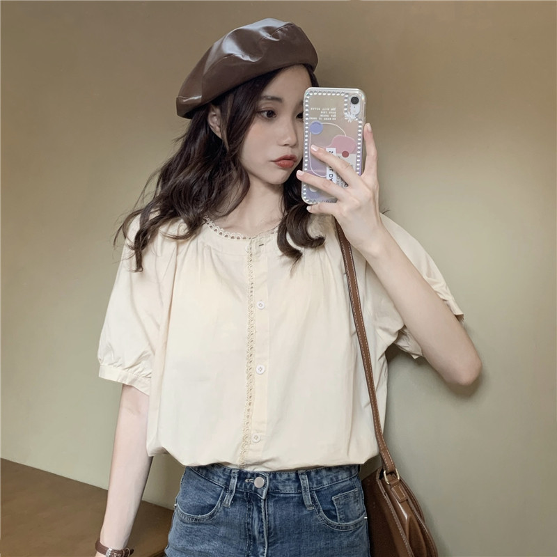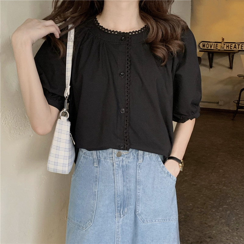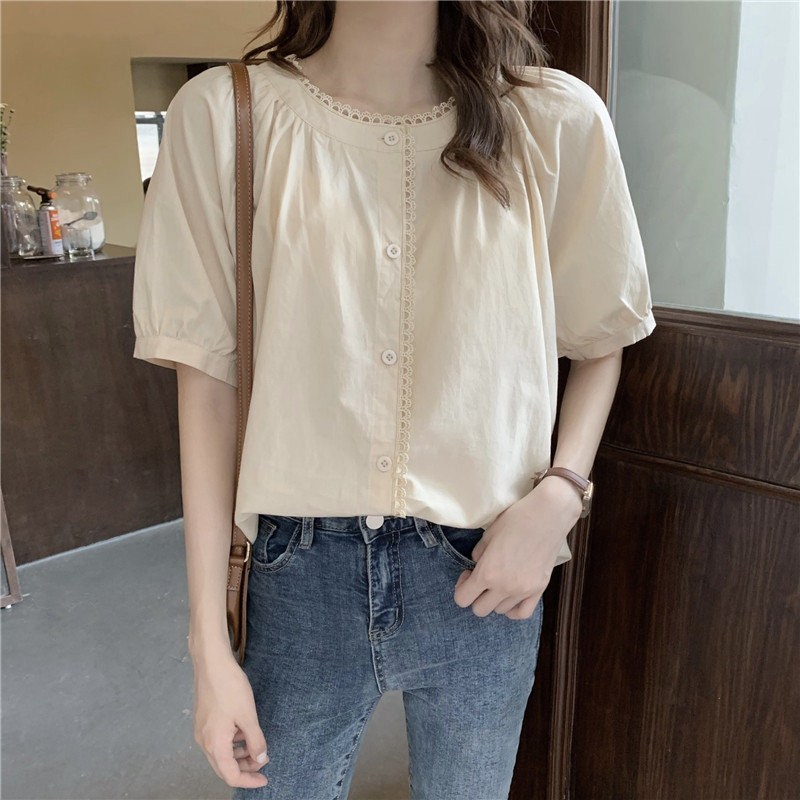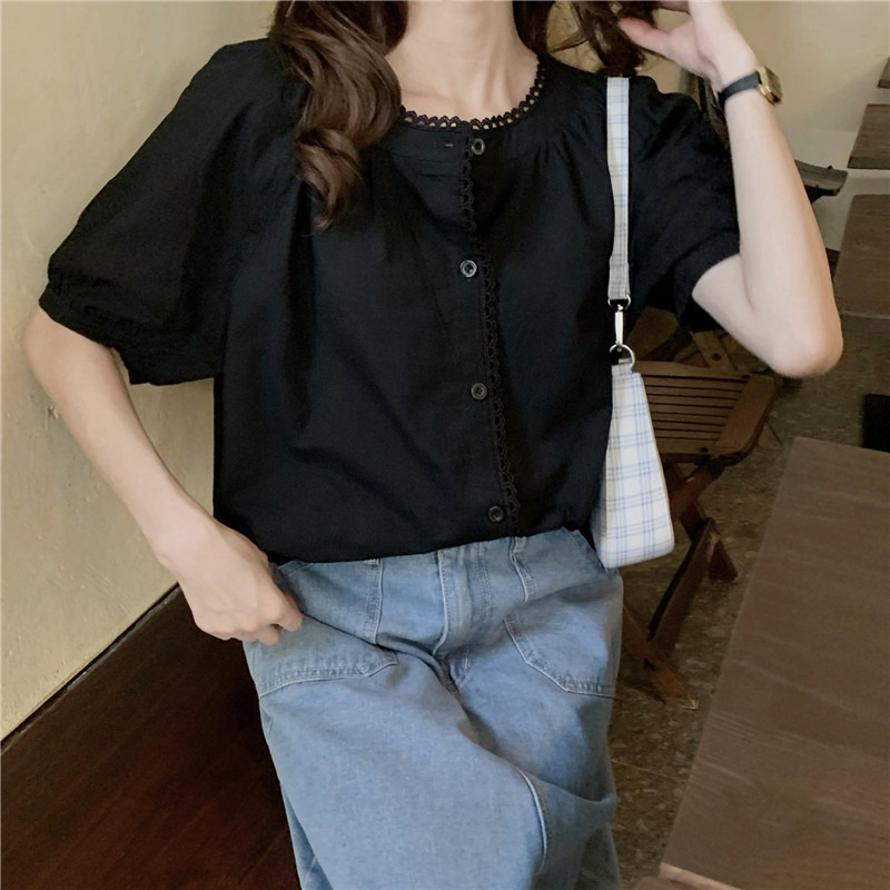 Кружевная ретро летняя однотонная рубашка с круглым воротником, французский стиль, рукава фонарики