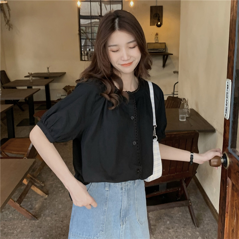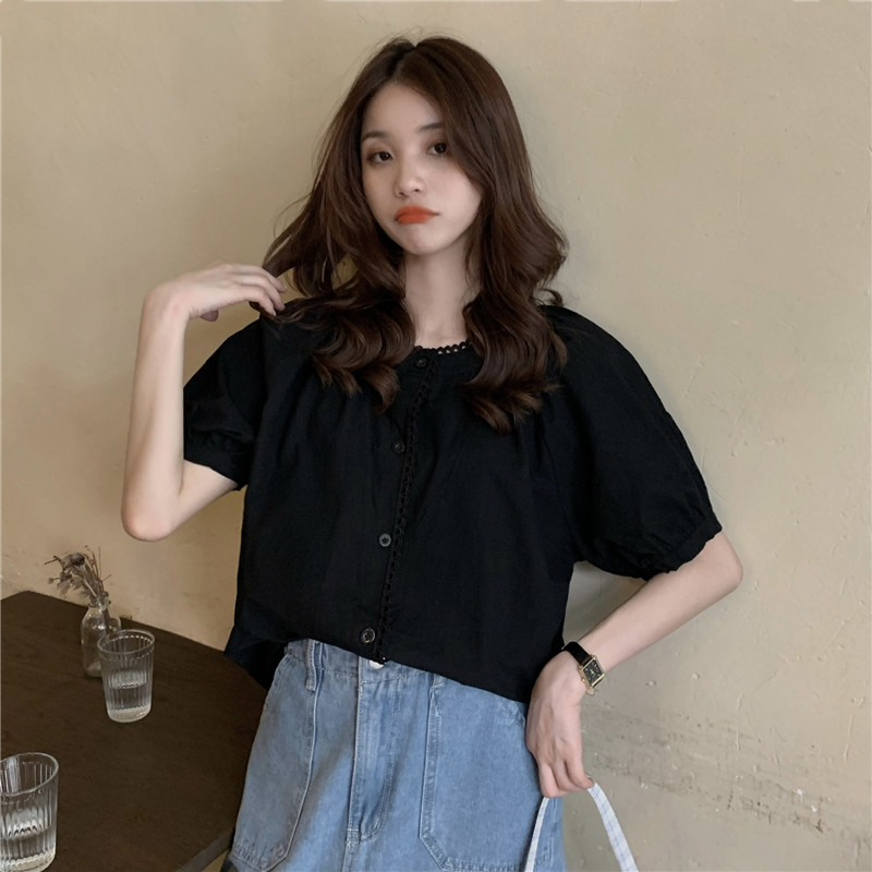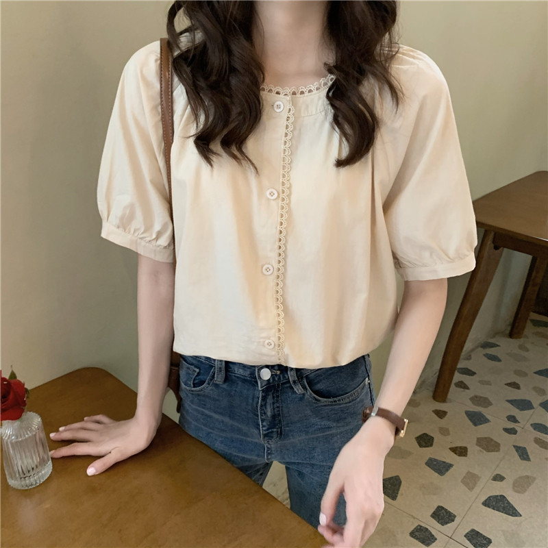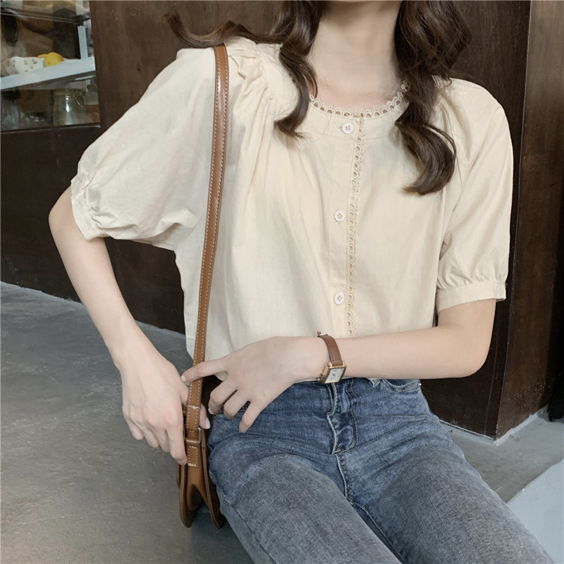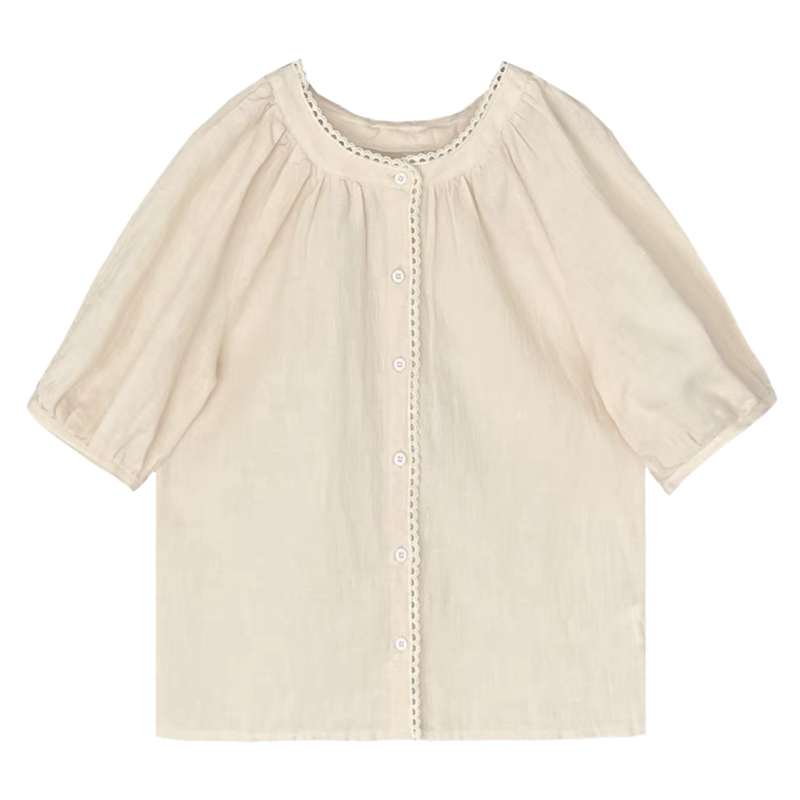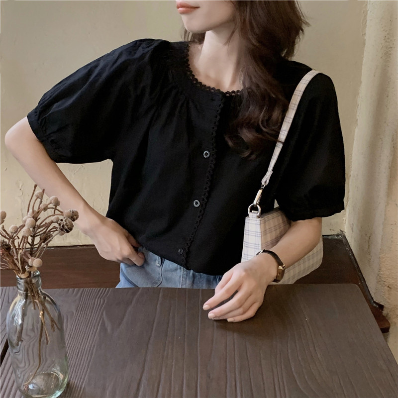 Кружевная ретро летняя однотонная рубашка с круглым воротником, французский стиль, рукава фонарики