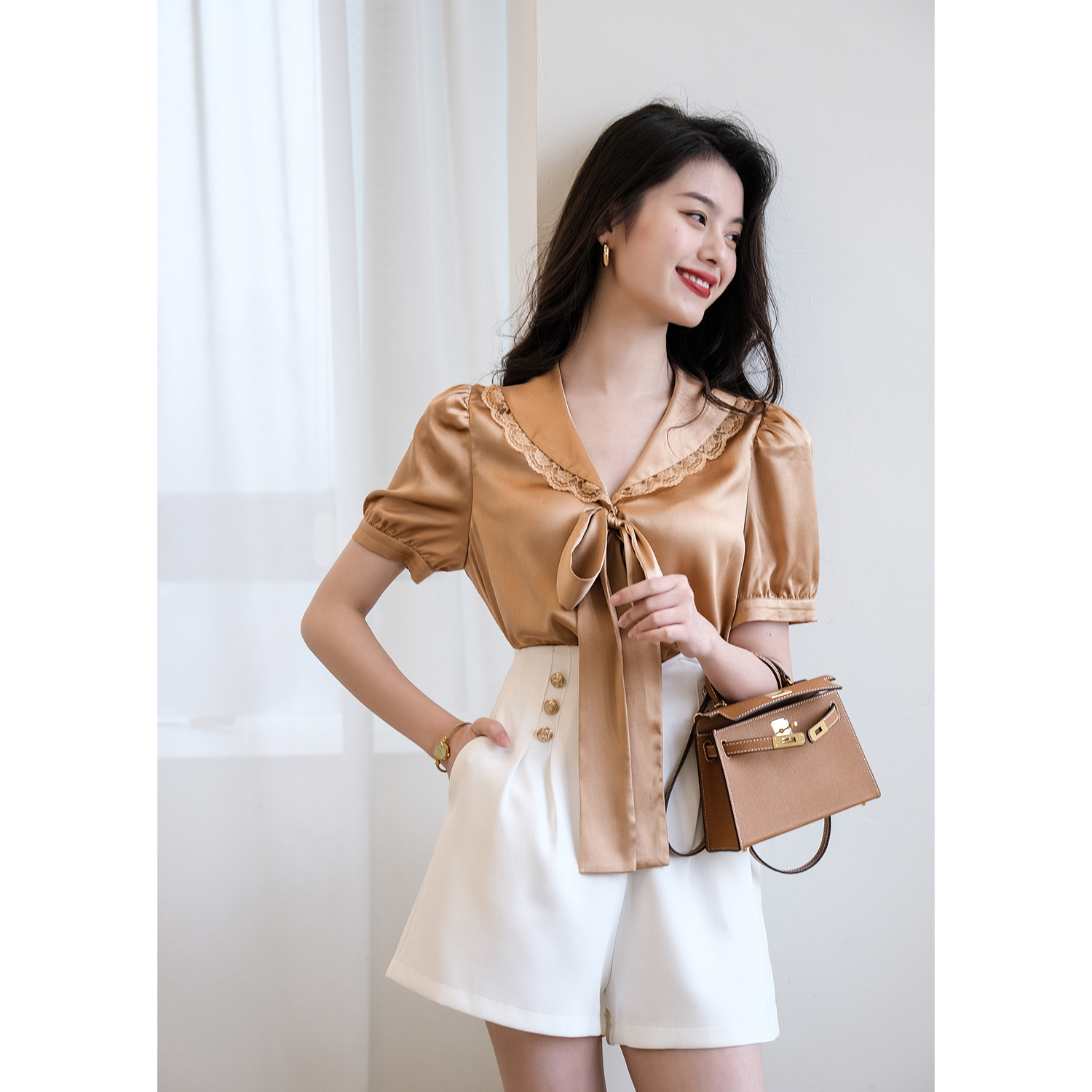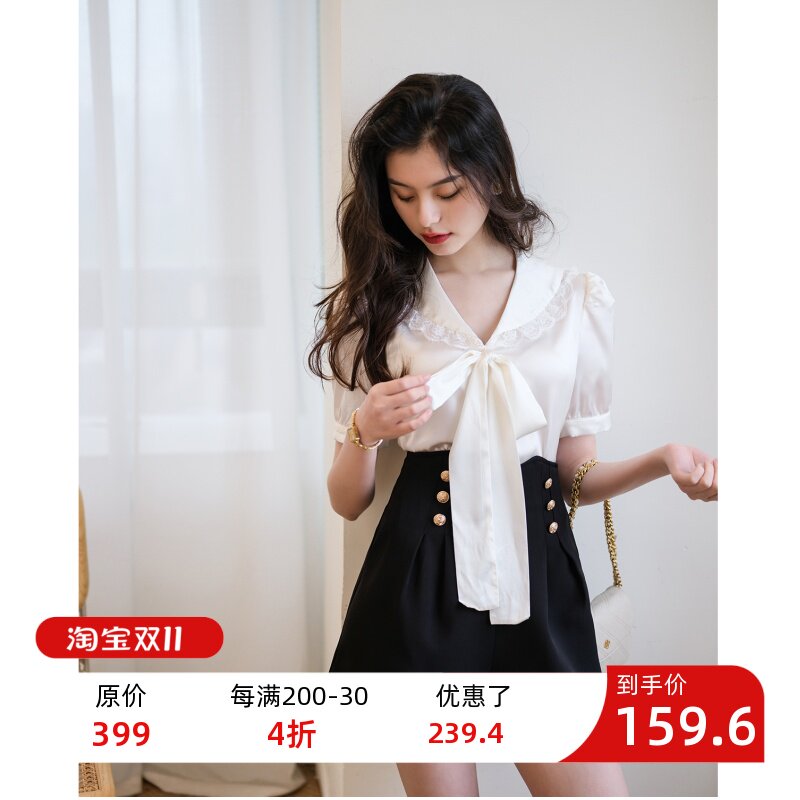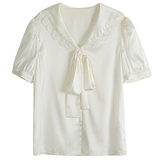 Кружевная кукла, шелковая летняя дизайнерская рубашка с бантиком, кукольный воротник, сезон 2021, новая коллекция, французский стиль