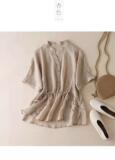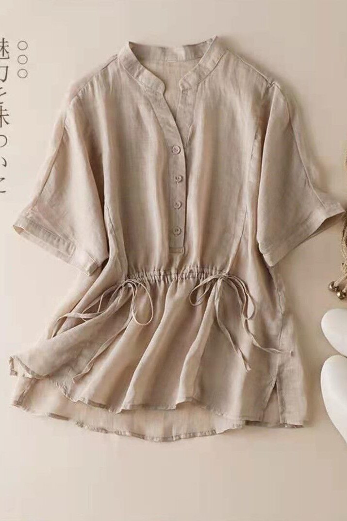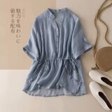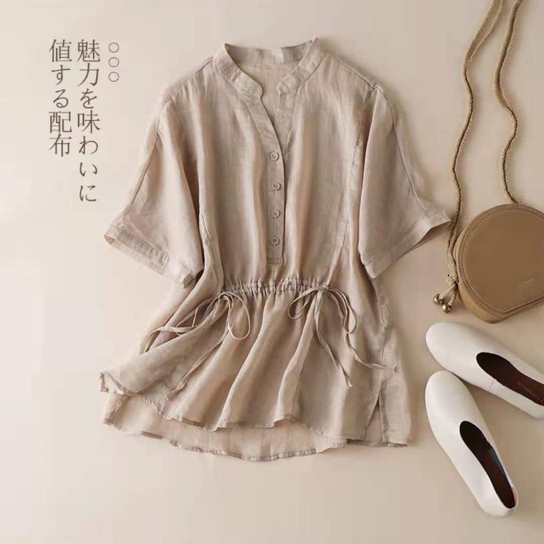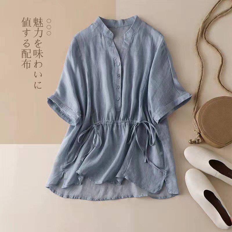 Приталенная тонкая рубашка, в корейском стиле, из хлопка и льна, высокая талия, V-образный вырез