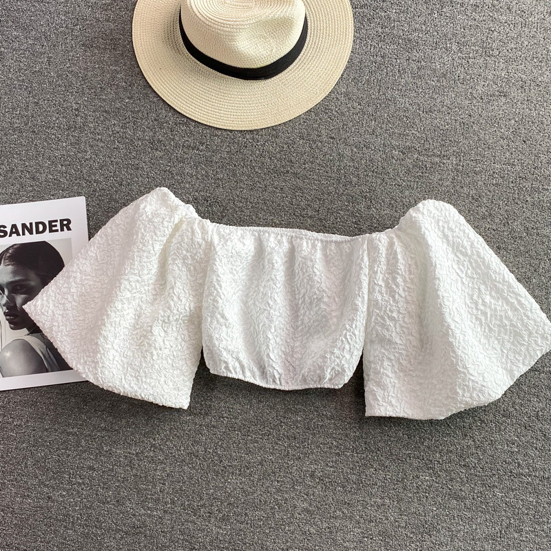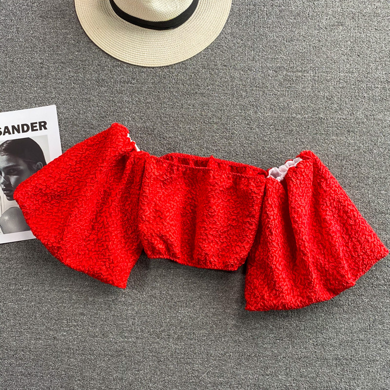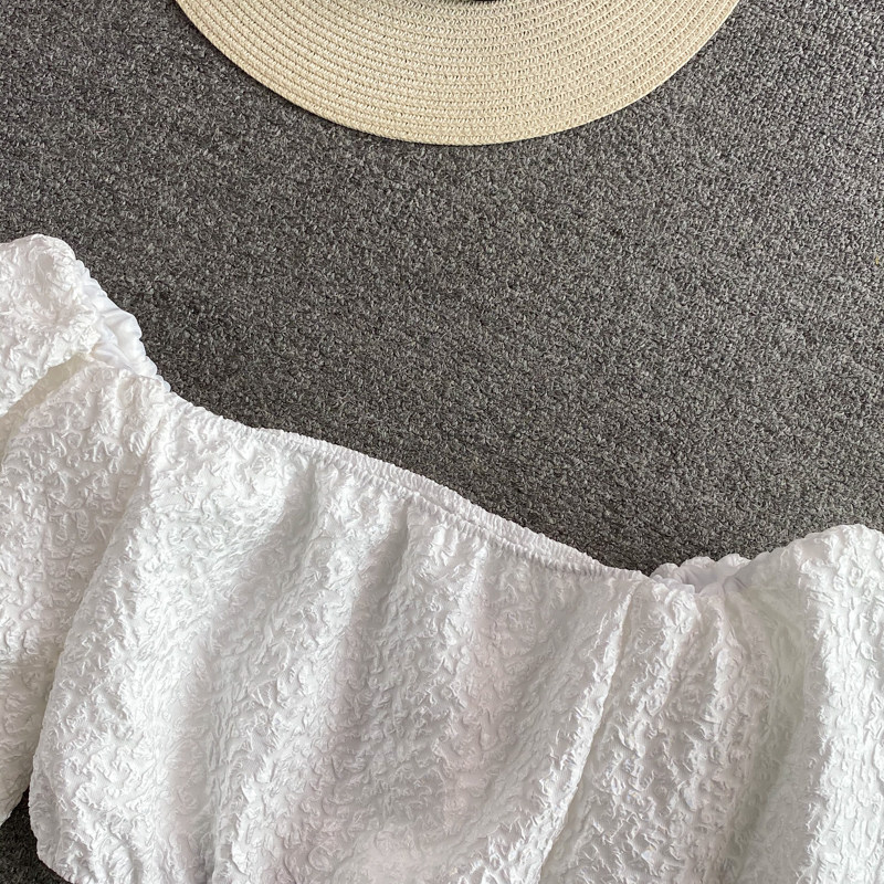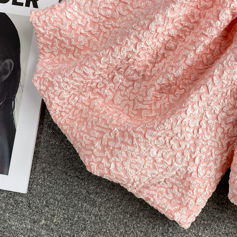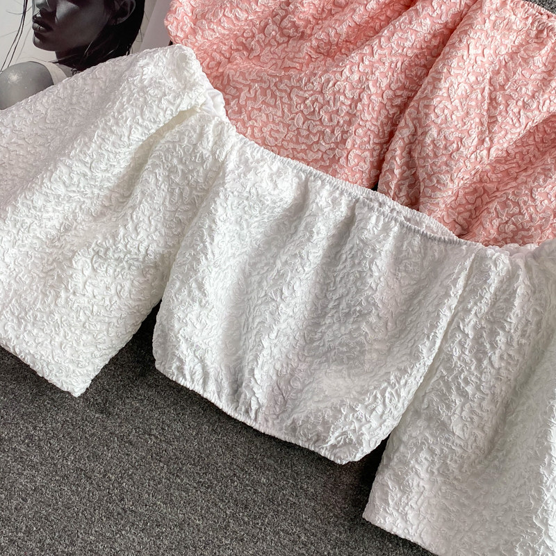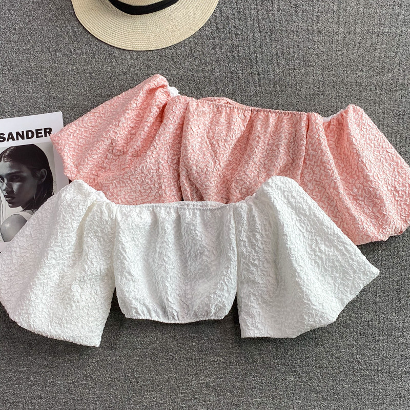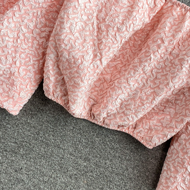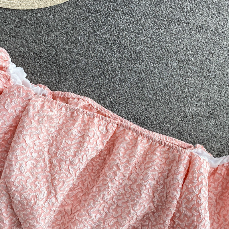 Розовая летняя короткая рубашка, открытые плечи, рукава фонарики, французский стиль