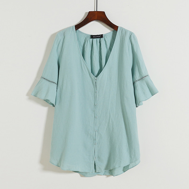 Рубашка, летний мегафон, V-образный вырез, из хлопка и льна, оверсайз