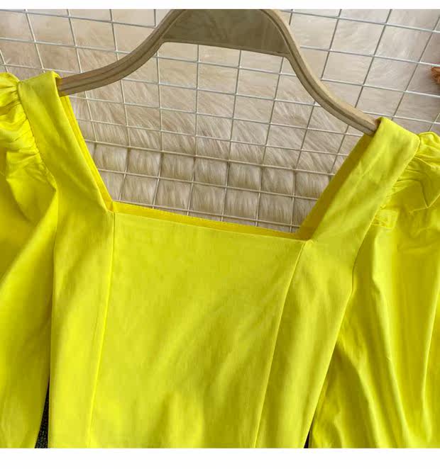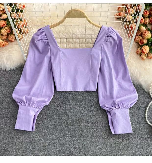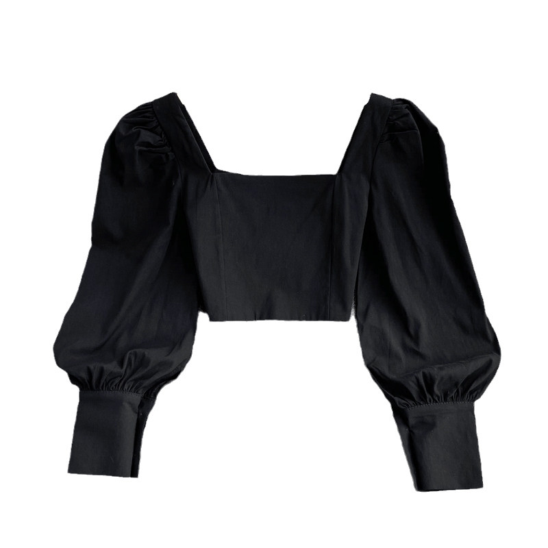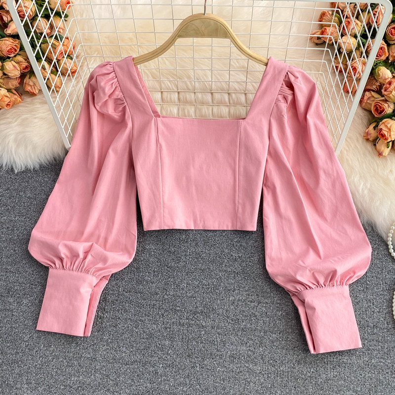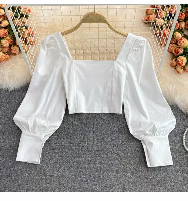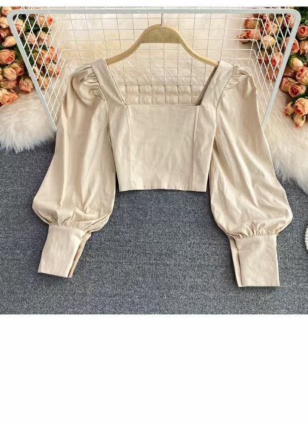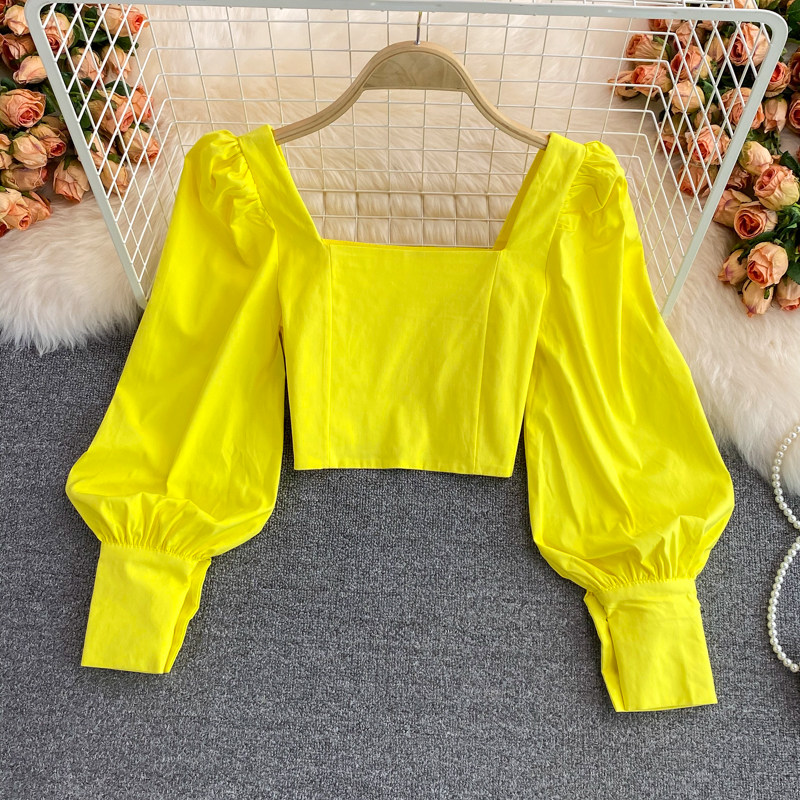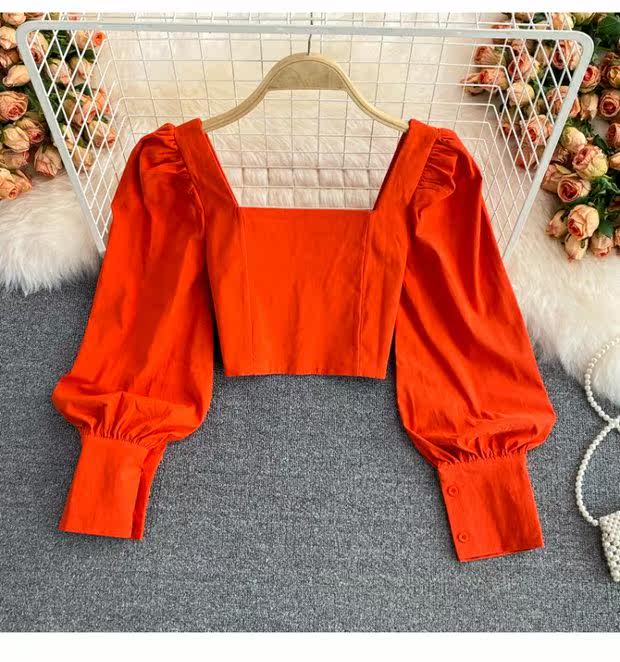 Осенняя короткая приталенная ретро рубашка, коллекция 2021, в корейском стиле, рукава фонарики, яркий броский стиль, квадратный вырез