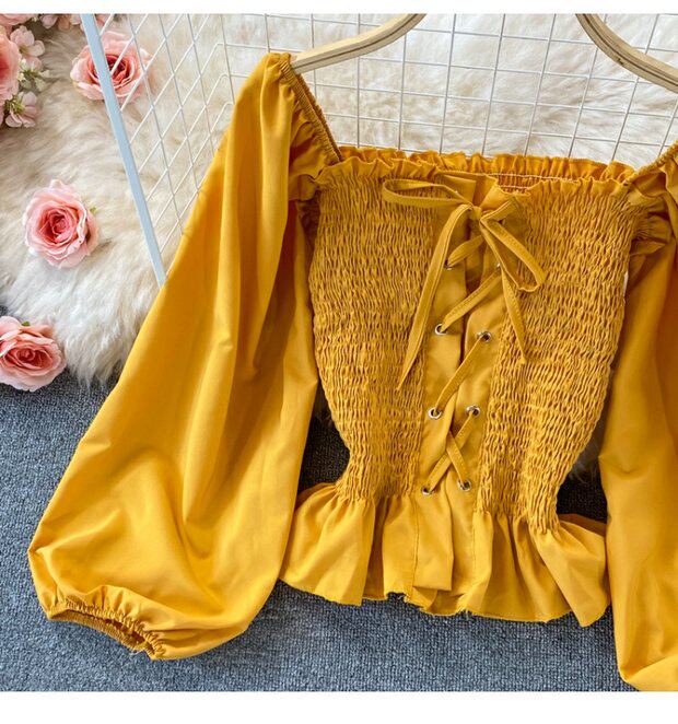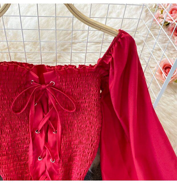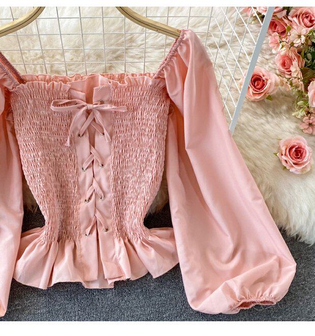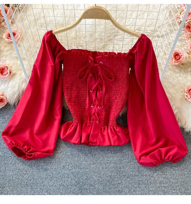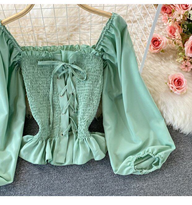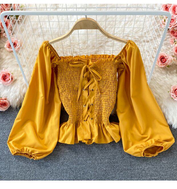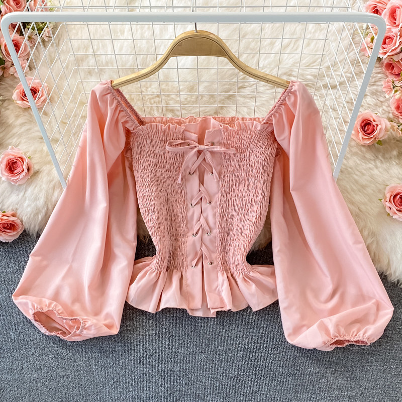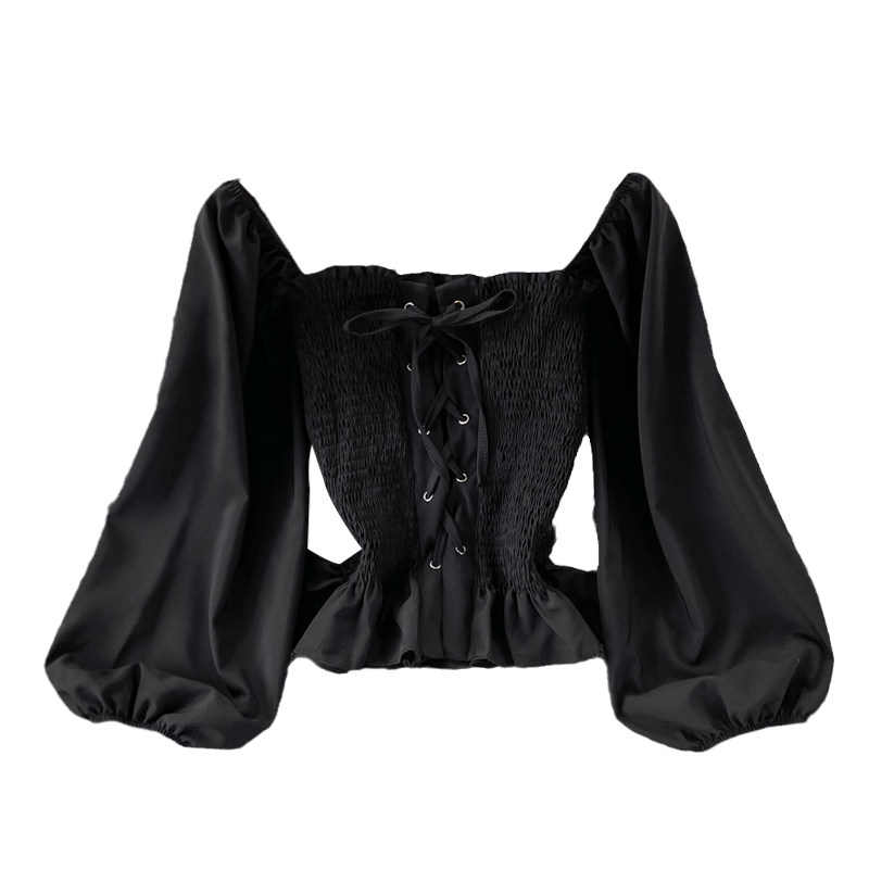 Осенний ретро лонгслив, рубашка, короткий приталенный корсет, французский стиль, квадратный вырез, в западном стиле