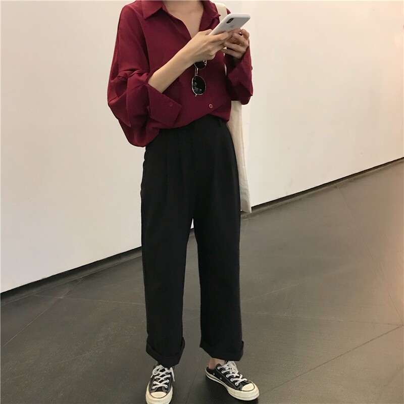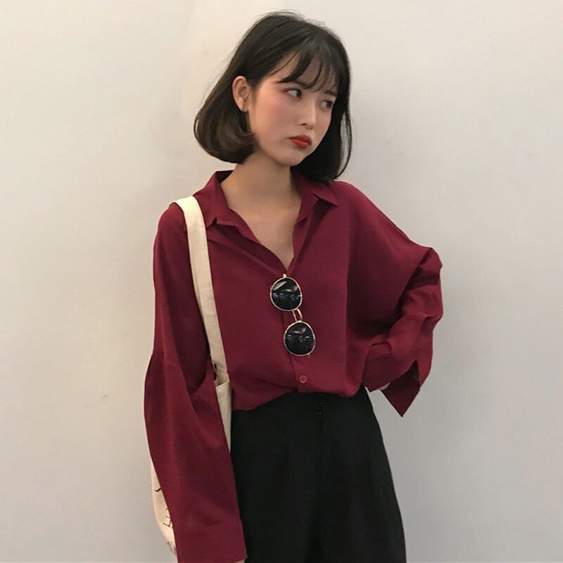 Весенняя осенняя ретро бордовая рубашка, тонкий лонгслив, 2023 года, большой размер