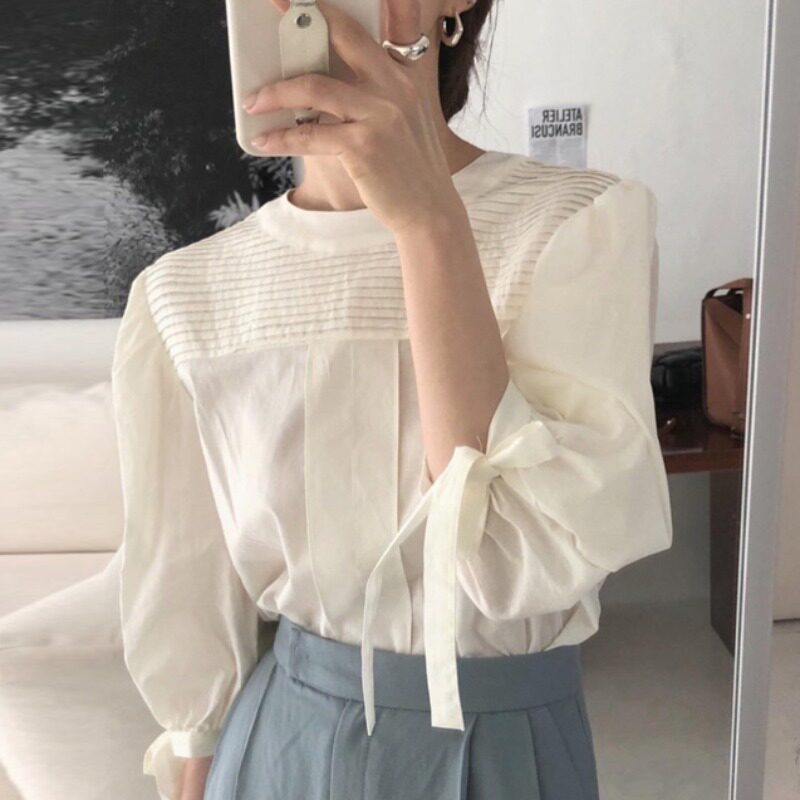 Осенний дизайнерский белый ремень с бантиком, рубашка с круглым воротником, в корейском стиле, французский стиль, тренд сезона