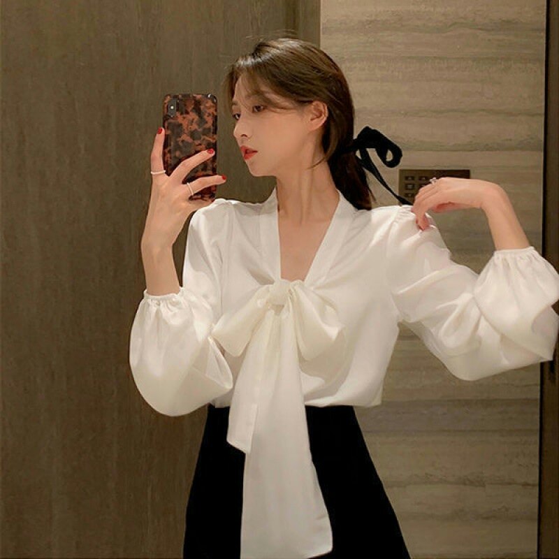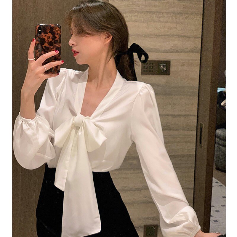 Осенняя рубашка, ретро базовый приятный телу лонгслив с бантиком