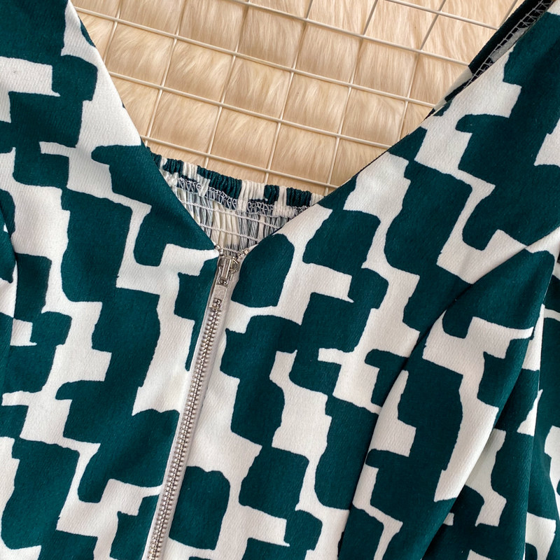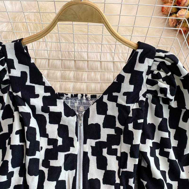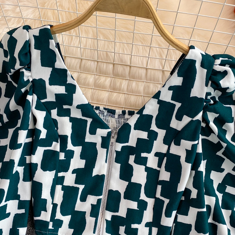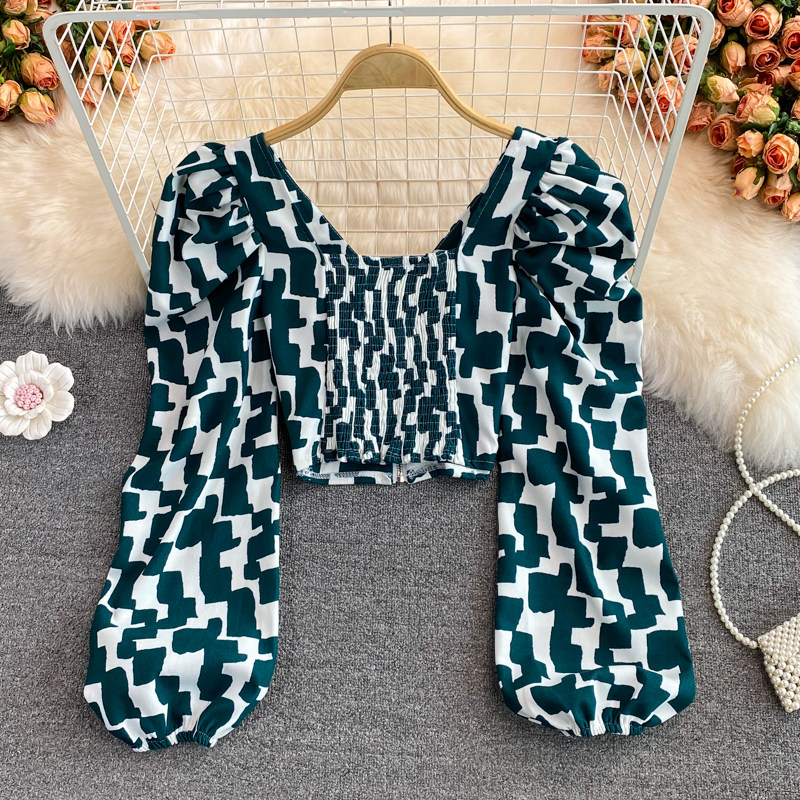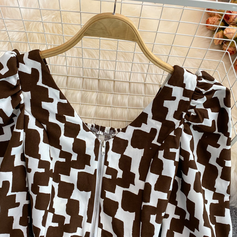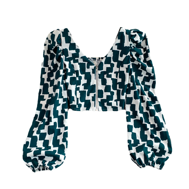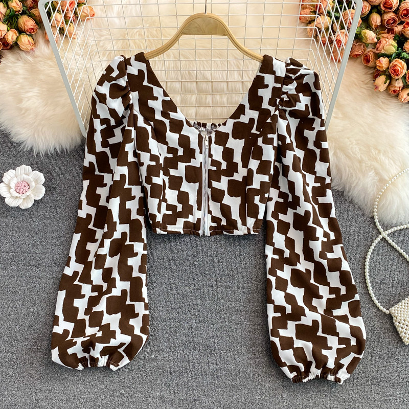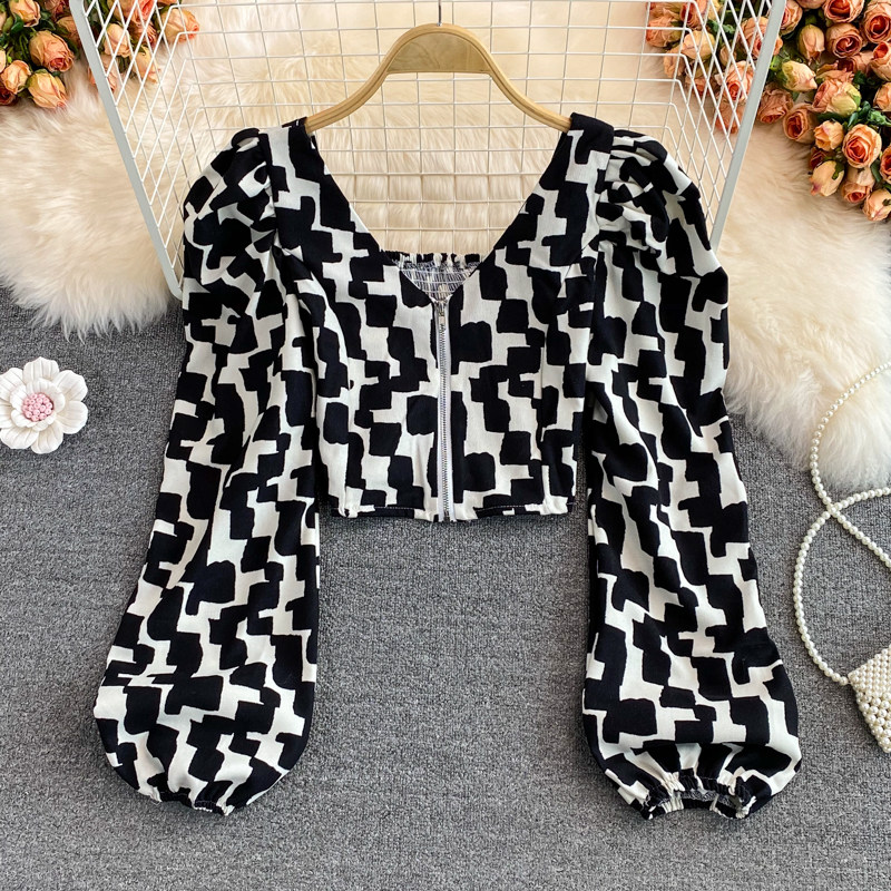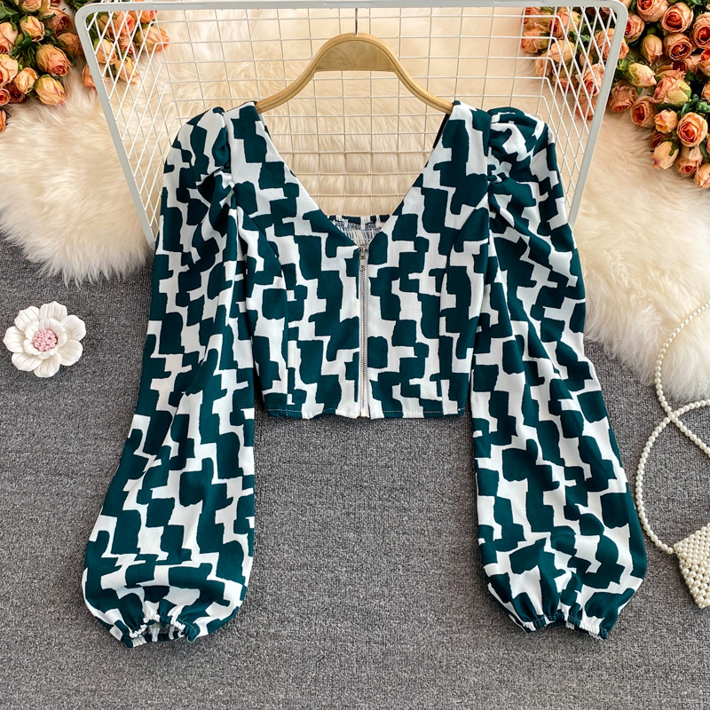 Короткая осенняя рубашка с молнией, европейский стиль, V-образный вырез, в корейском стиле, рукава фонарики