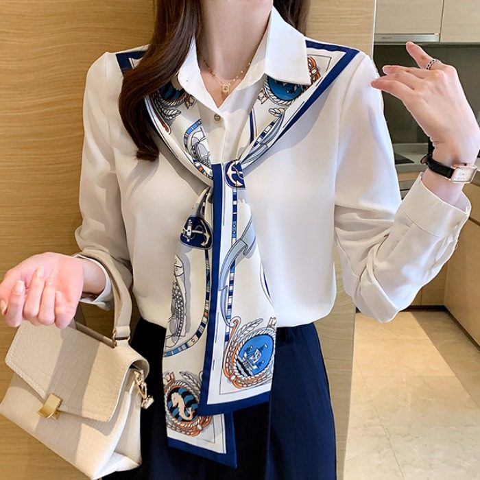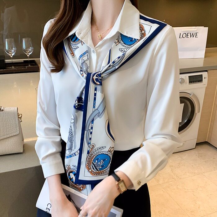 Шифоновая белая рубашка, дизайнерский лонгслив, изысканный стиль, тренд сезона, городской стиль, коллекция 2023