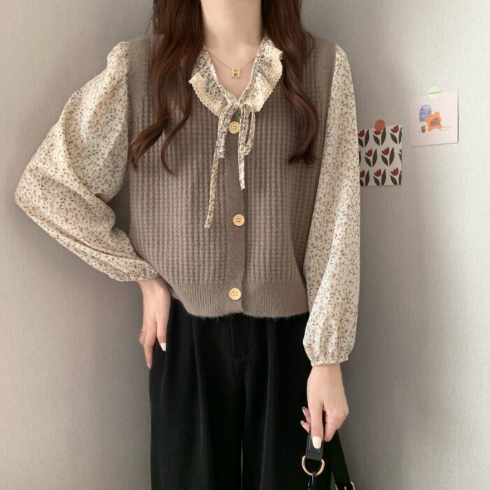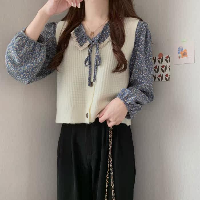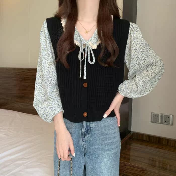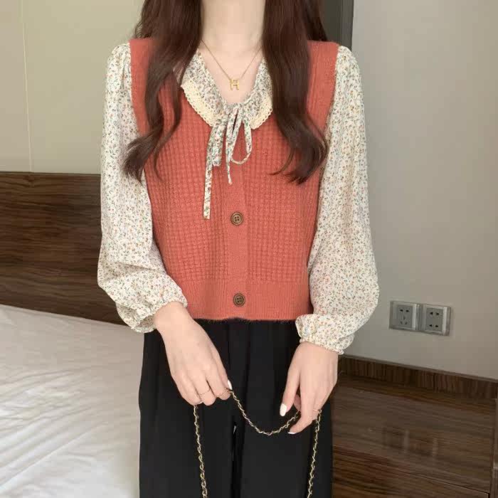 Демисезонная рубашка, лонгслив, французский стиль, цветочный принт, коллекция 2021, в корейском стиле, свободный прямой крой, по фигуре