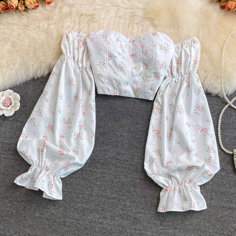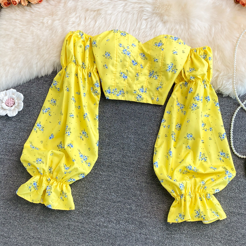 Сексуальный топ без лямок, осенняя рубашка, короткий лонгслив, открытые плечи, рукава фонарики, цветочный принт, в корейском стиле