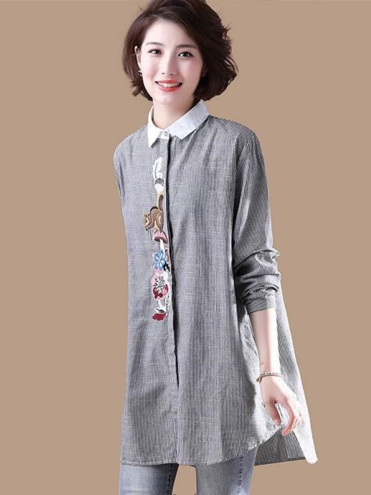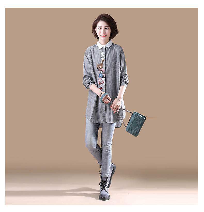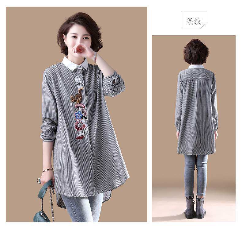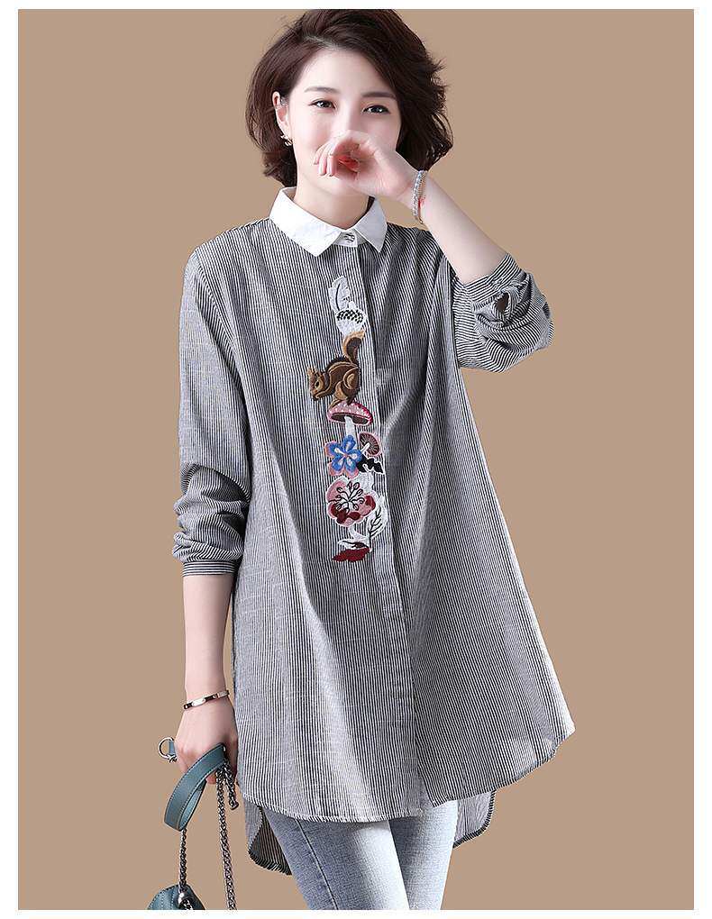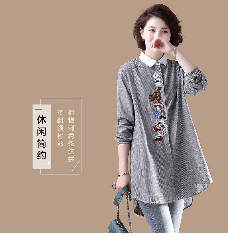 (Трансграничная торговля), брендовый южнокорейский осенний товар, длинная рубашка, из хлопка и льна, средней длины, большой размер, с вышивкой