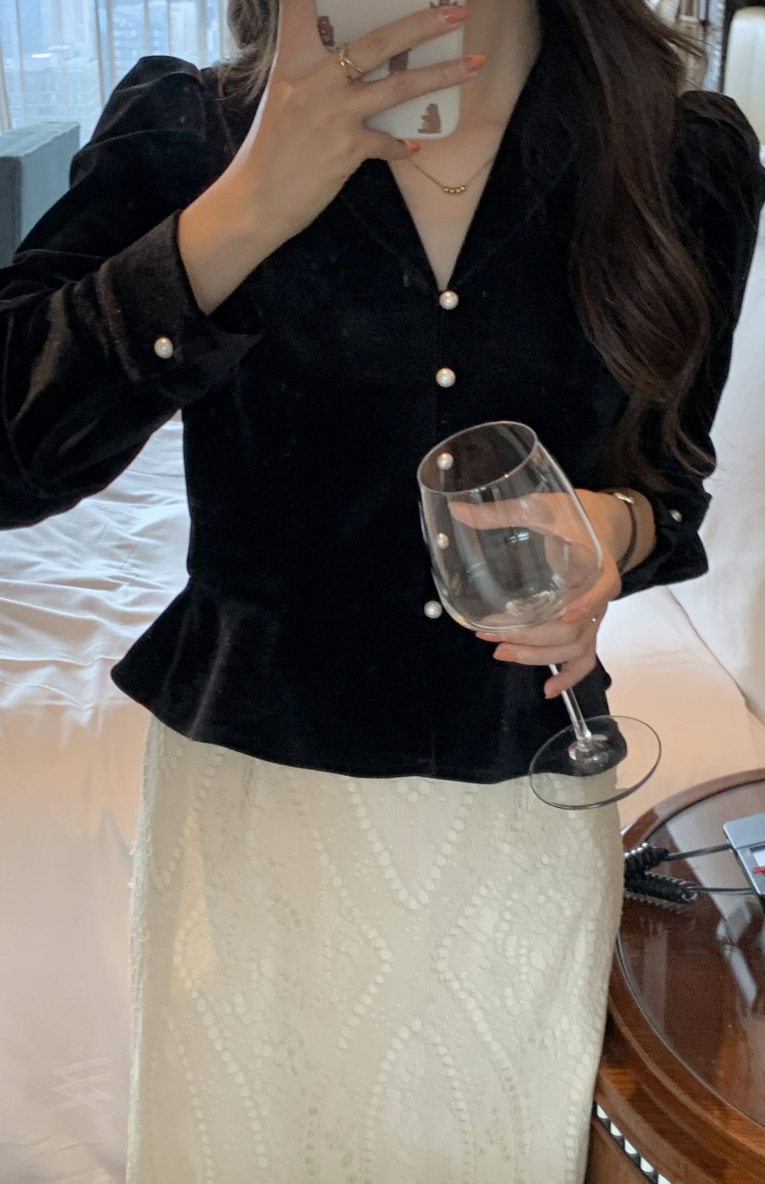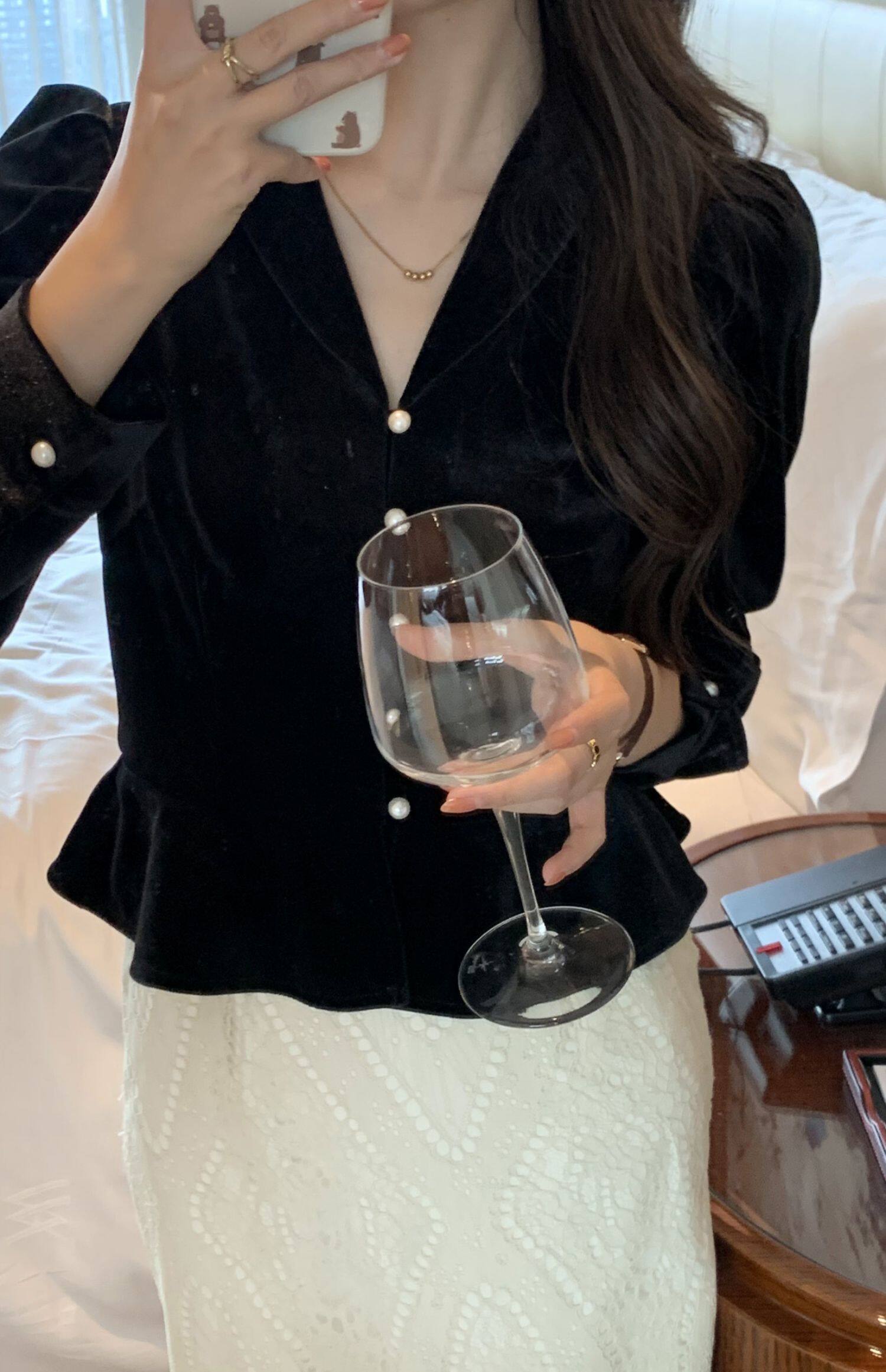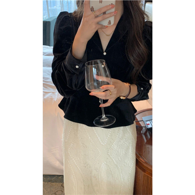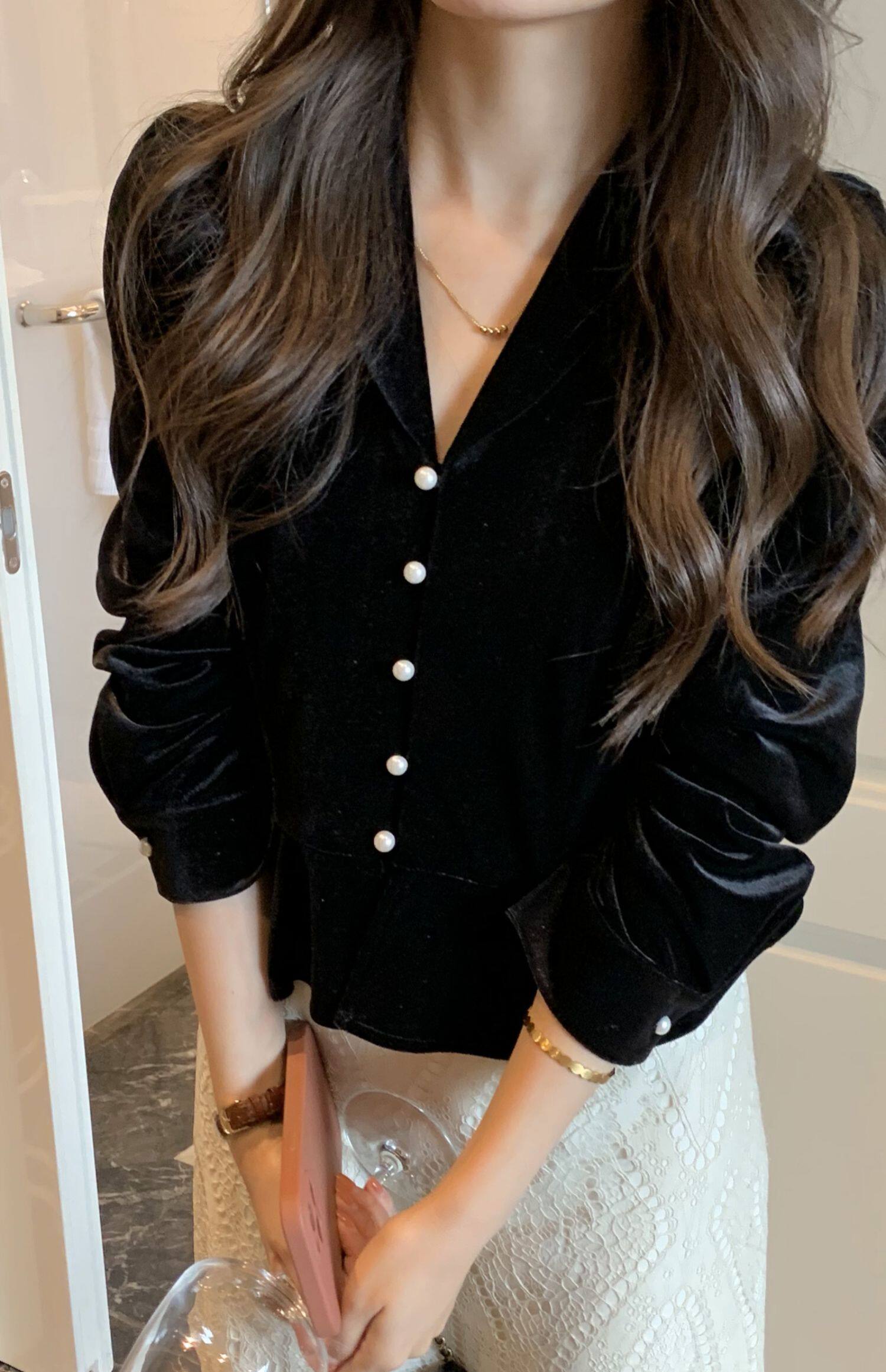 Элитная модная дизайнерская черная бархатная короткая демисезонная рубашка, в западном стиле, тренд сезона, французский стиль