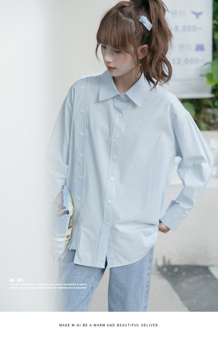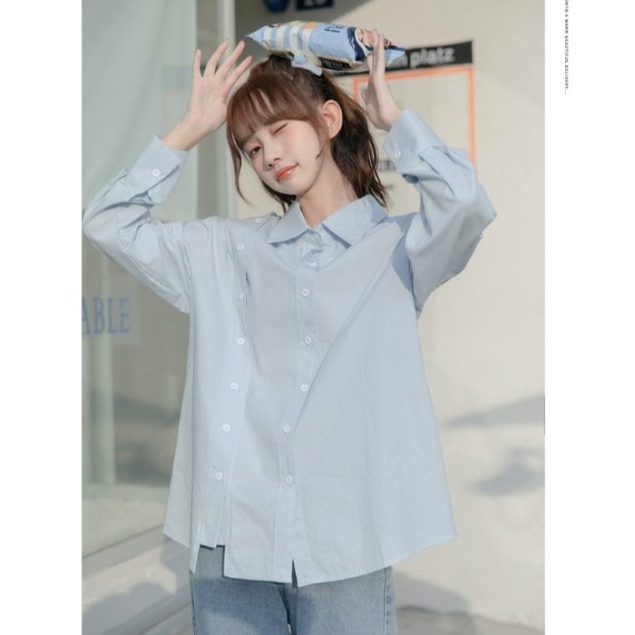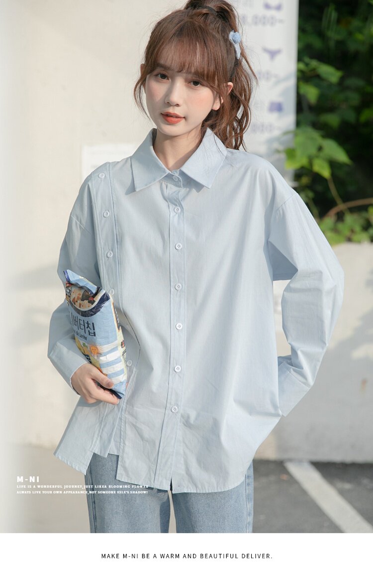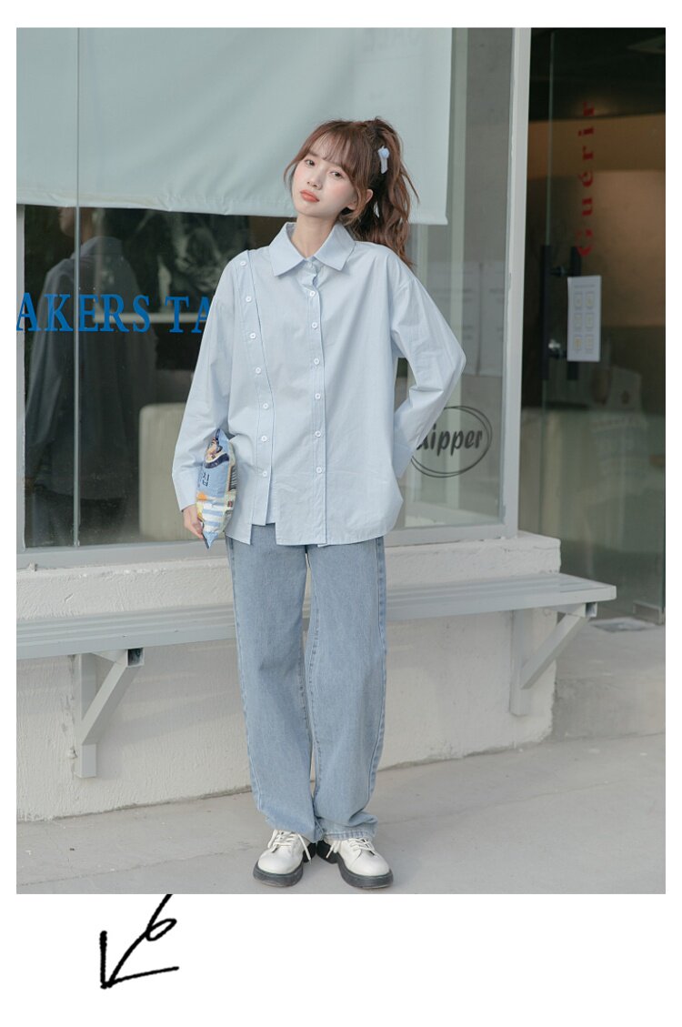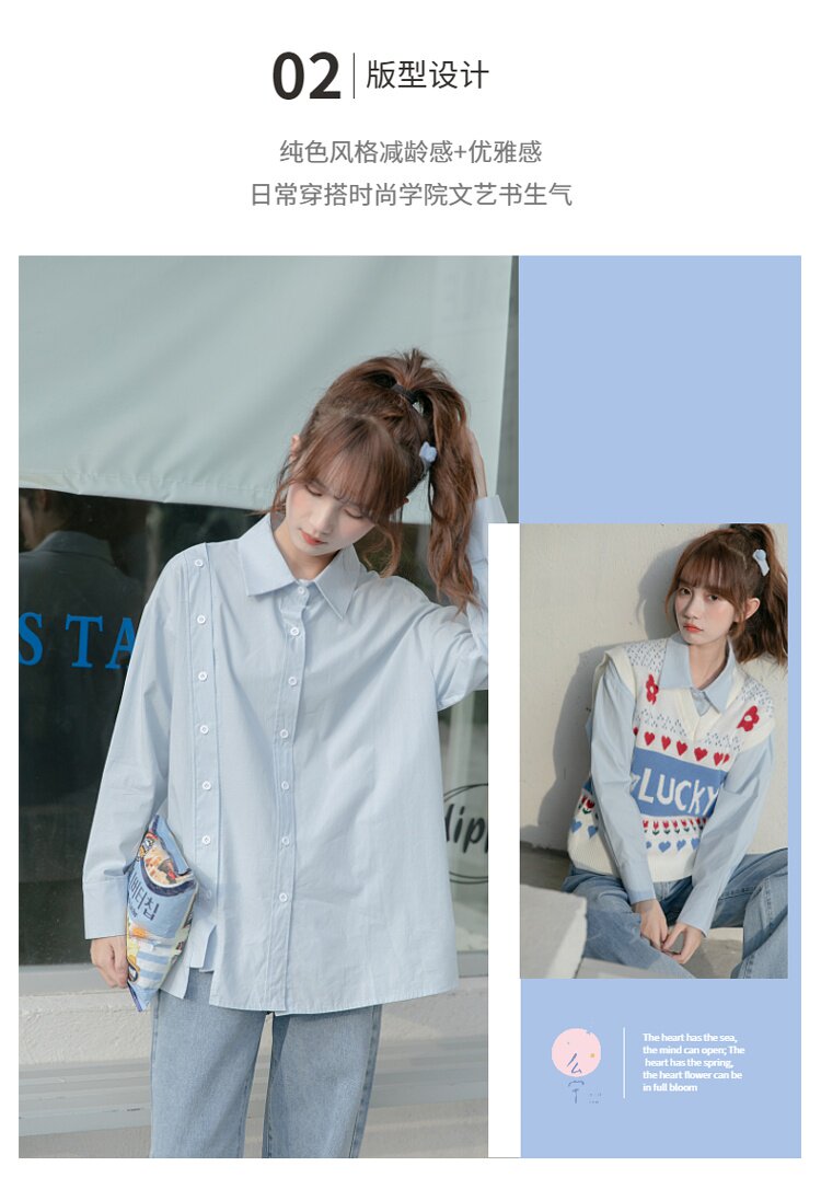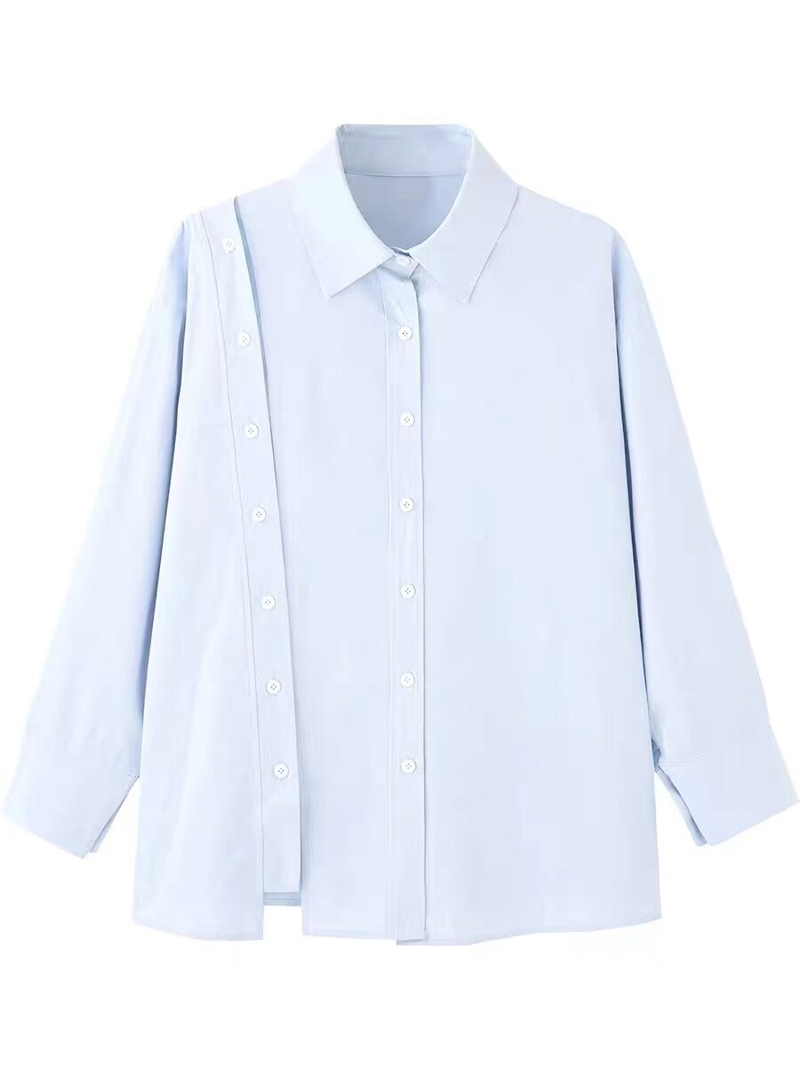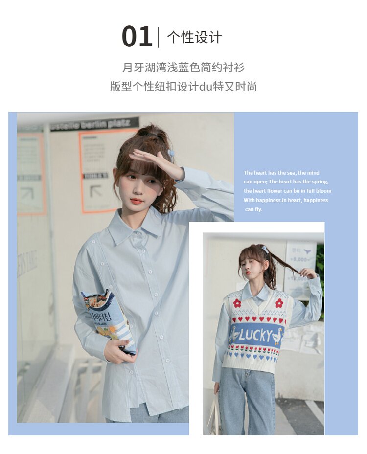 Синяя весенняя ретро рубашка, дизайнерский свежий комплект, свободный крой, воротник поло, тренд сезона
