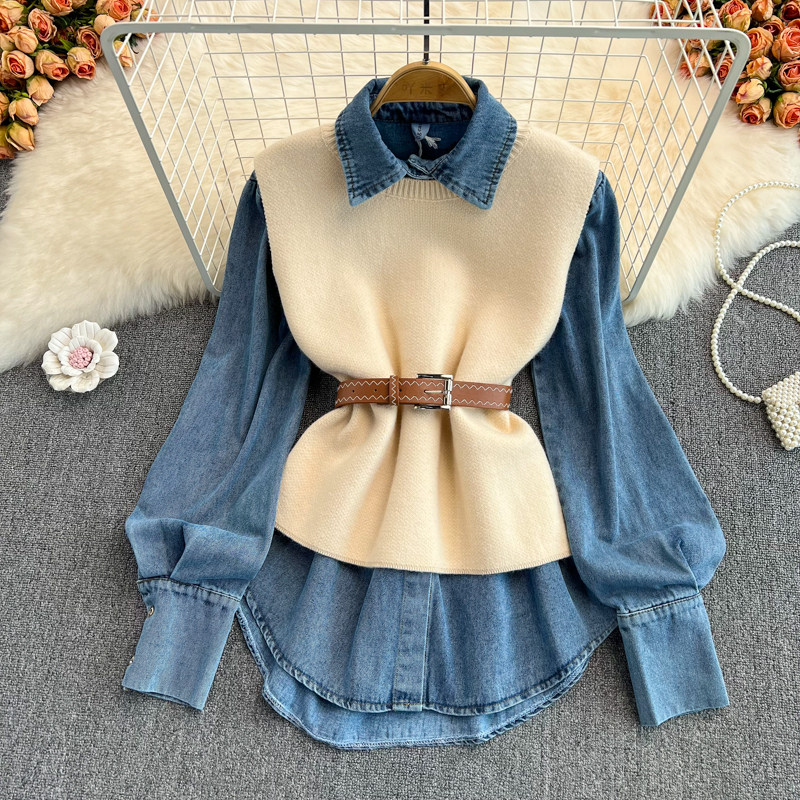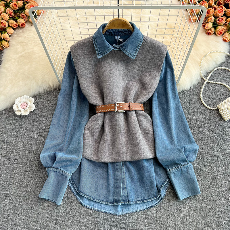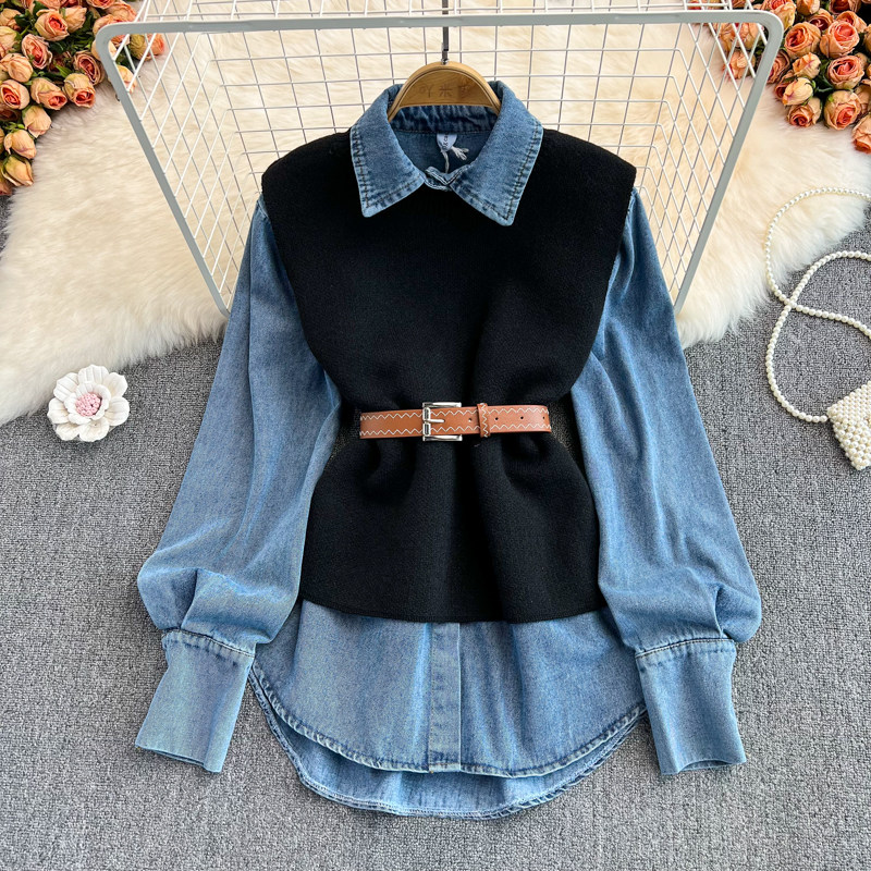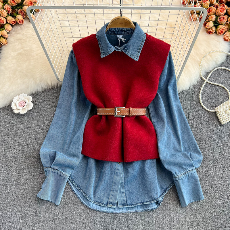 Осенний приталенный корсет, трикотажный жилет, комплект, длинная рубашка, в корейском стиле, средней длины