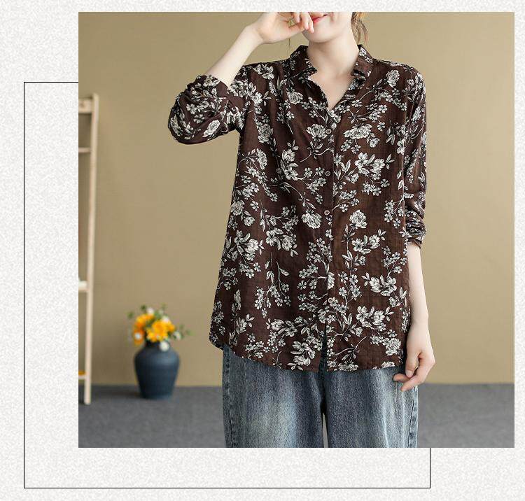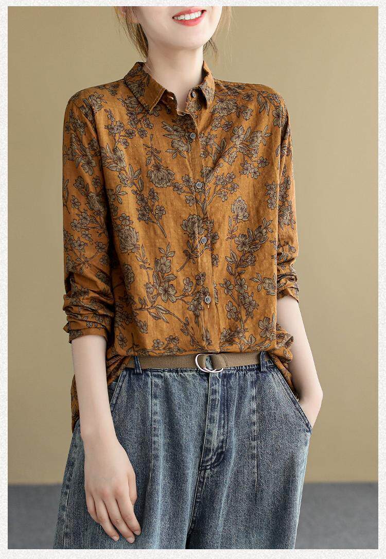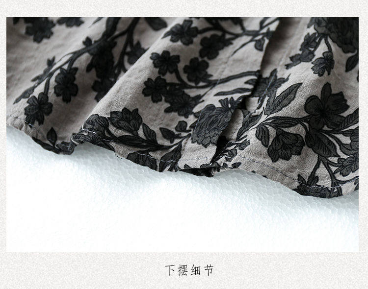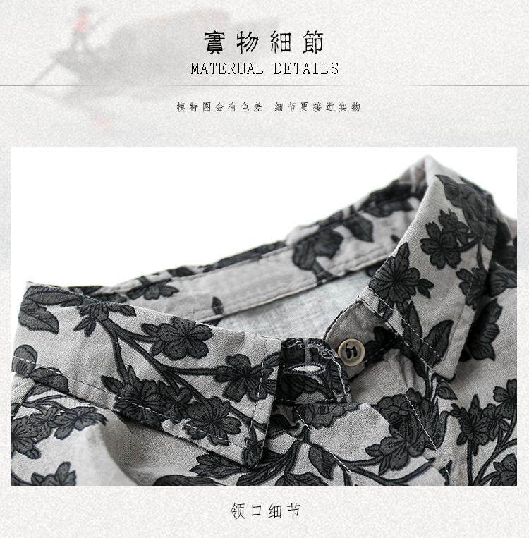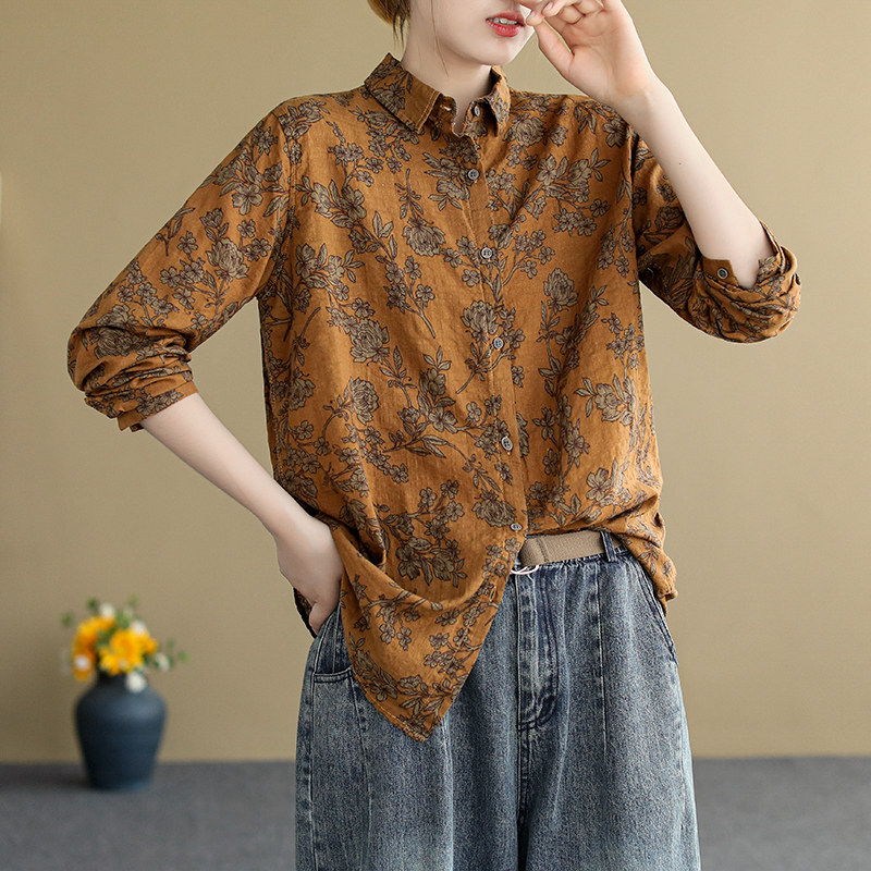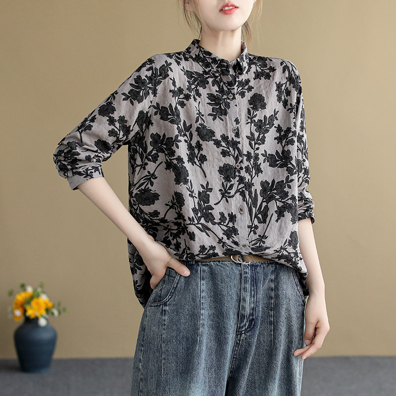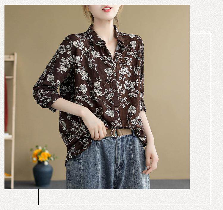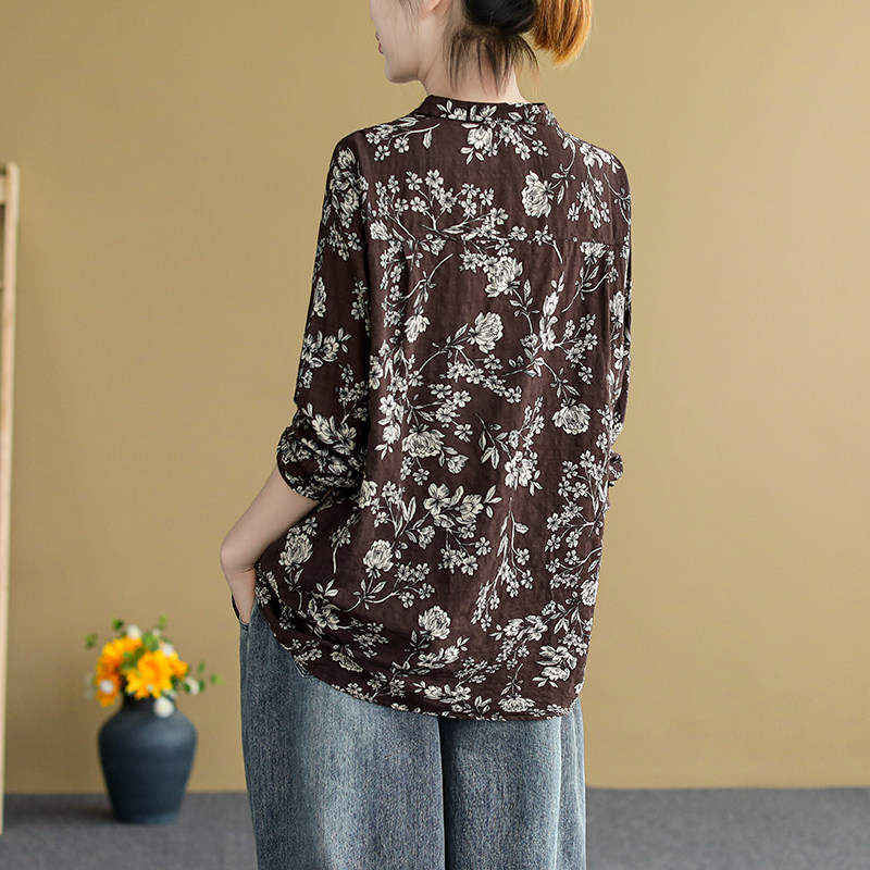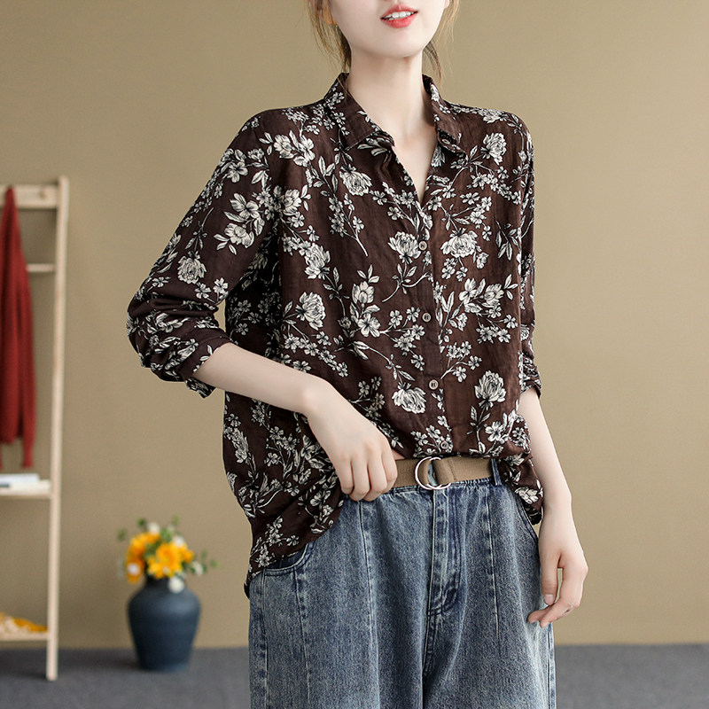 (Трансграничная торговля), ретро рубашка, цветочный принт, из хлопка и льна