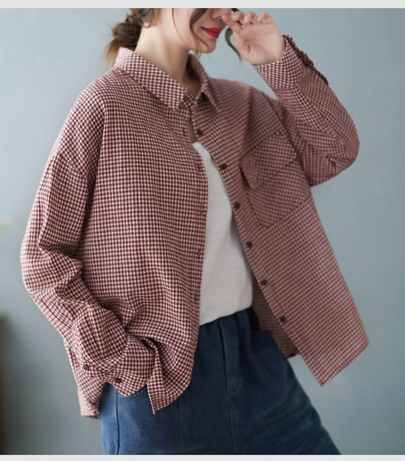 Весенний ретро клетчатый лонгслив, рубашка, большой размер, свободный крой, из хлопка и льна