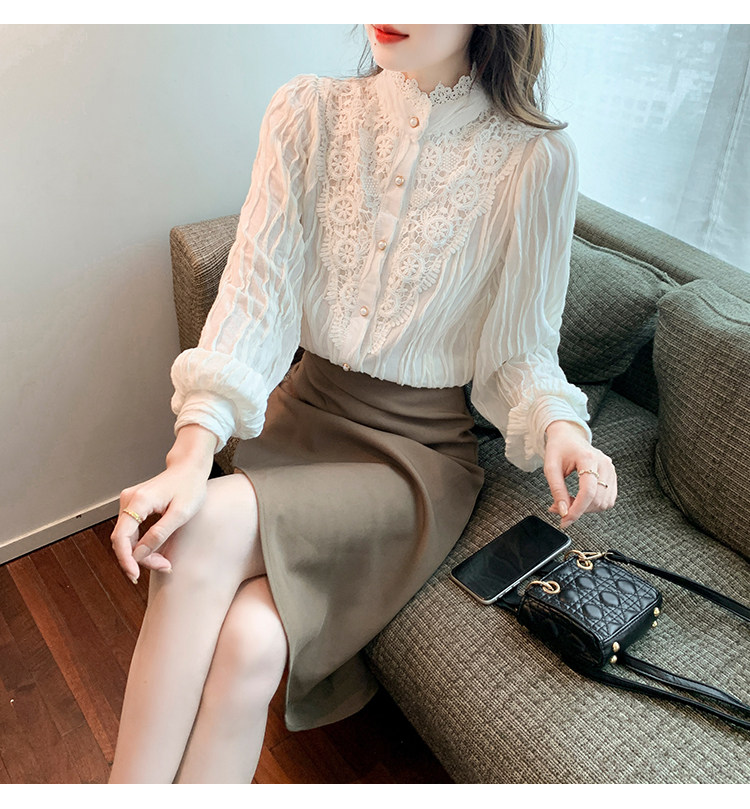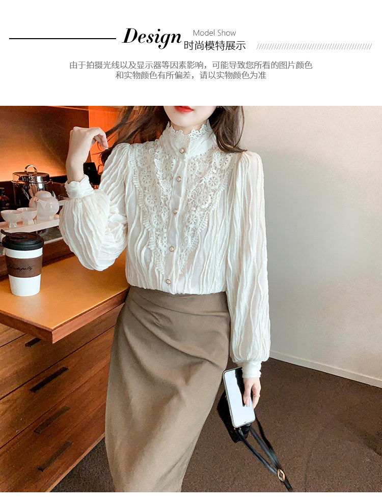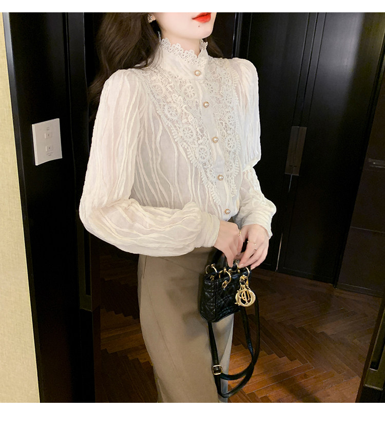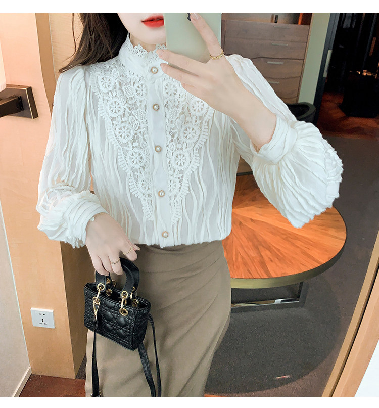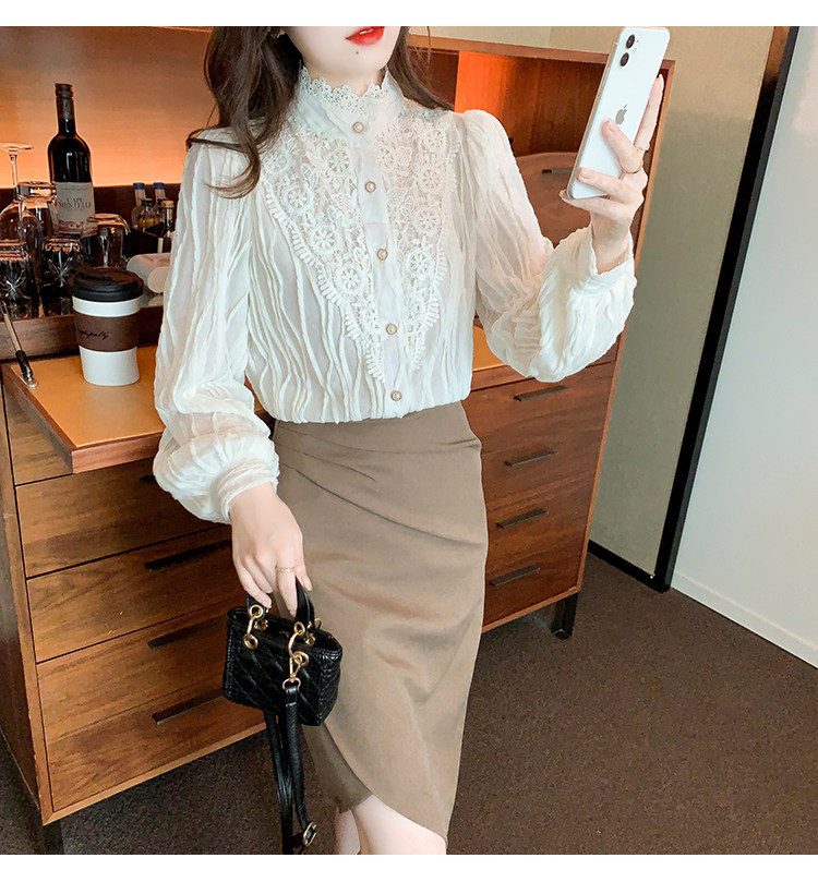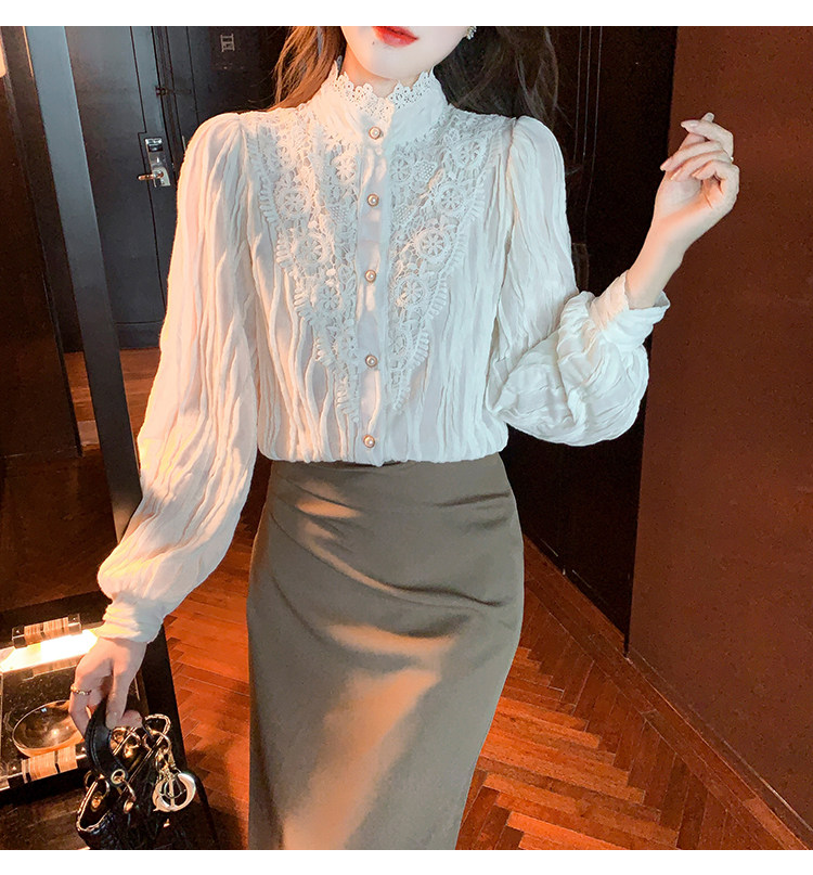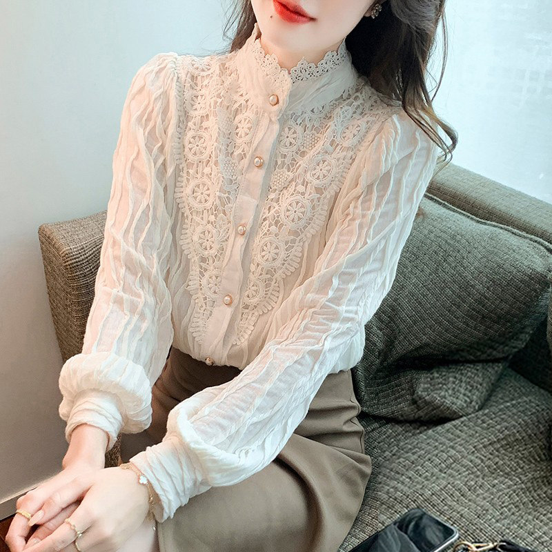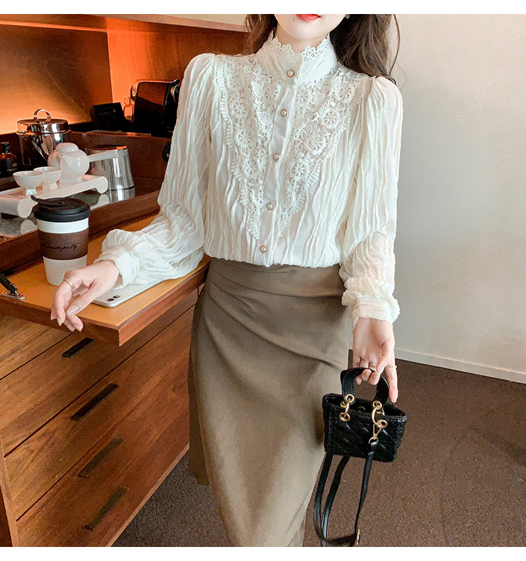 Осенняя рубашка, шифоновый кружевной шелковый приятный телу лонгслив, в западном стиле, коллекция 2023, высокий воротник