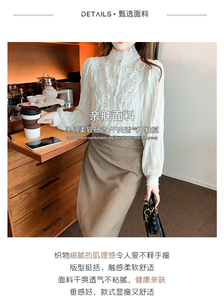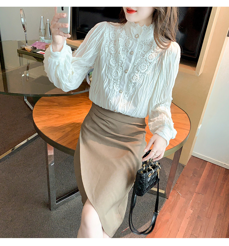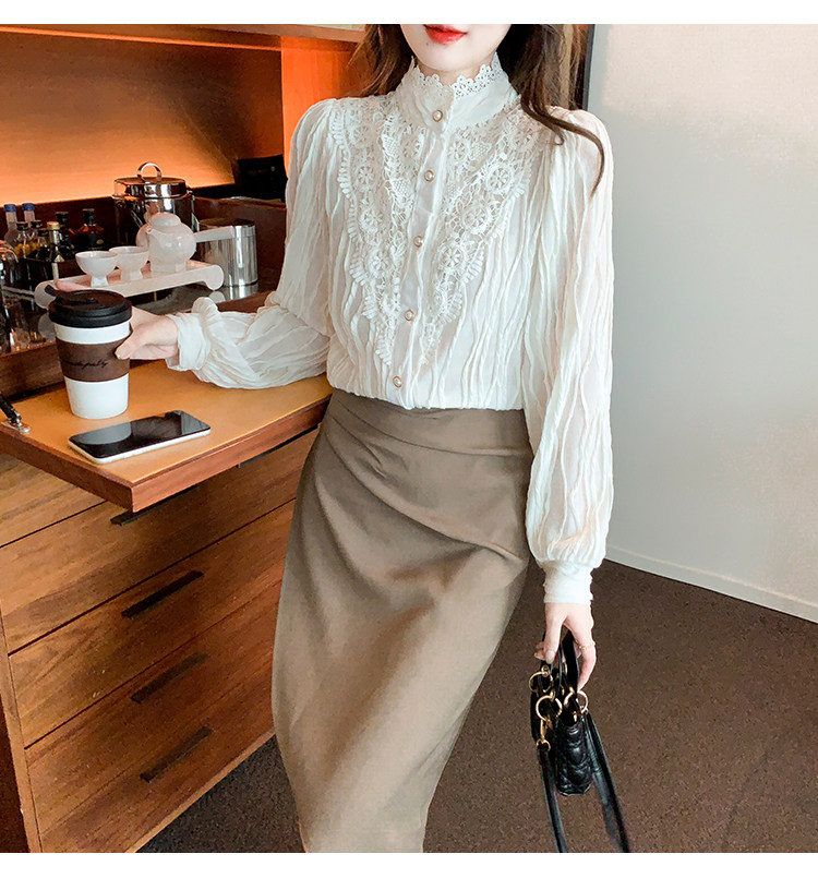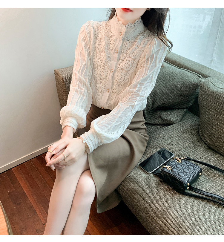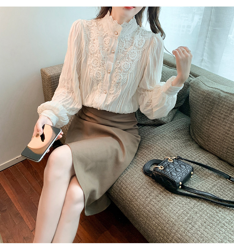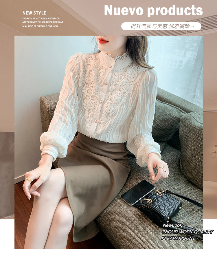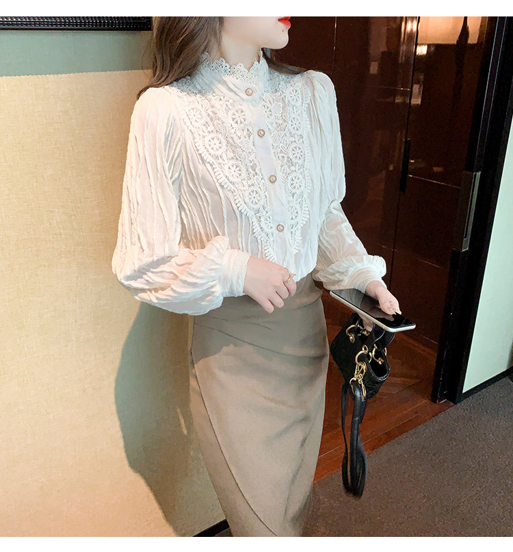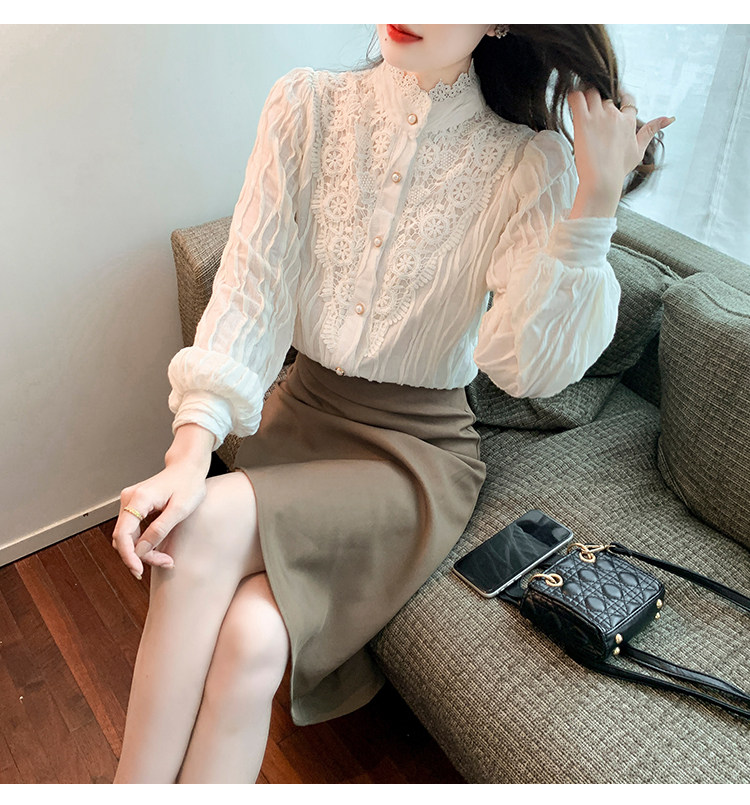 Осенняя рубашка, шифоновый кружевной шелковый приятный телу лонгслив, в западном стиле, коллекция 2023, высокий воротник