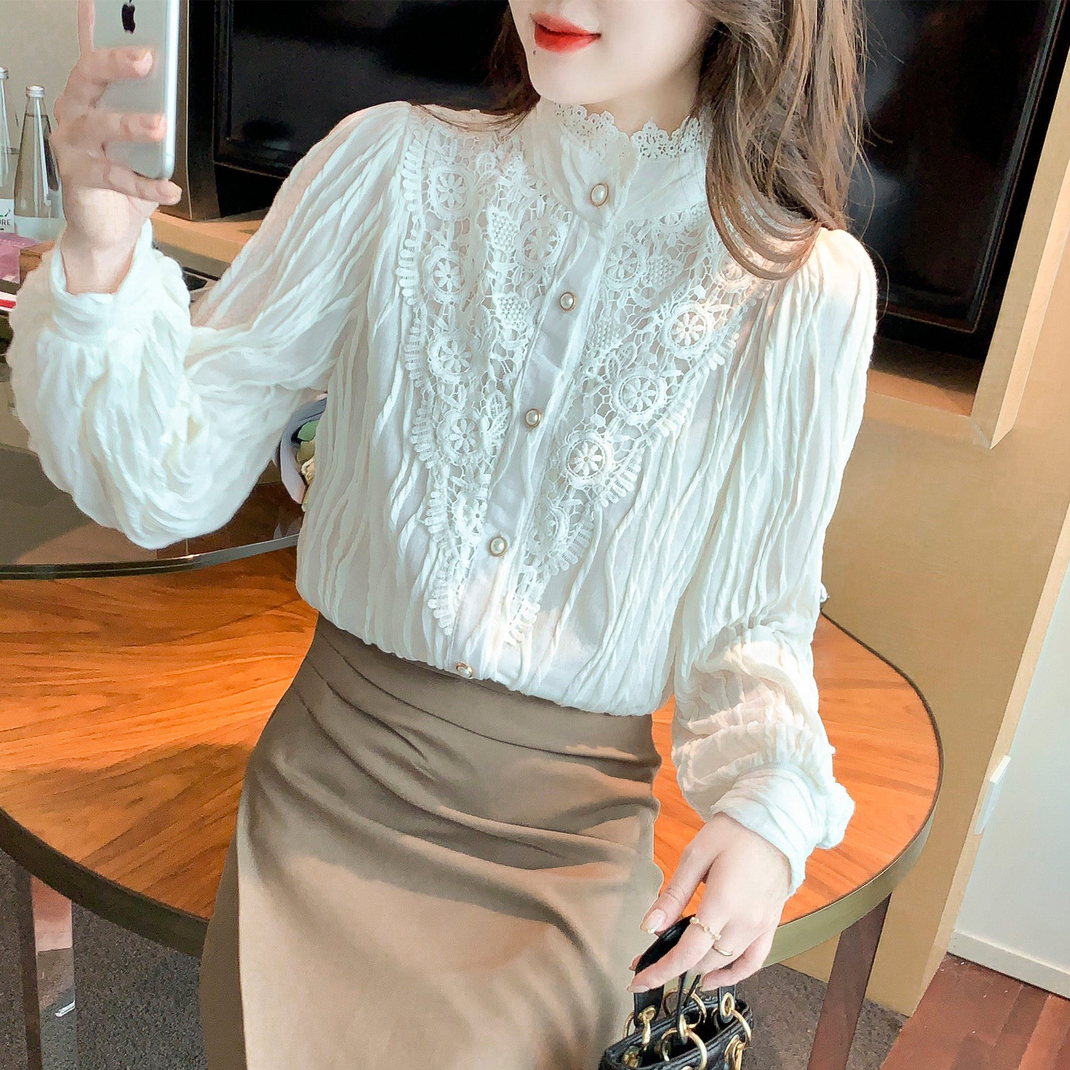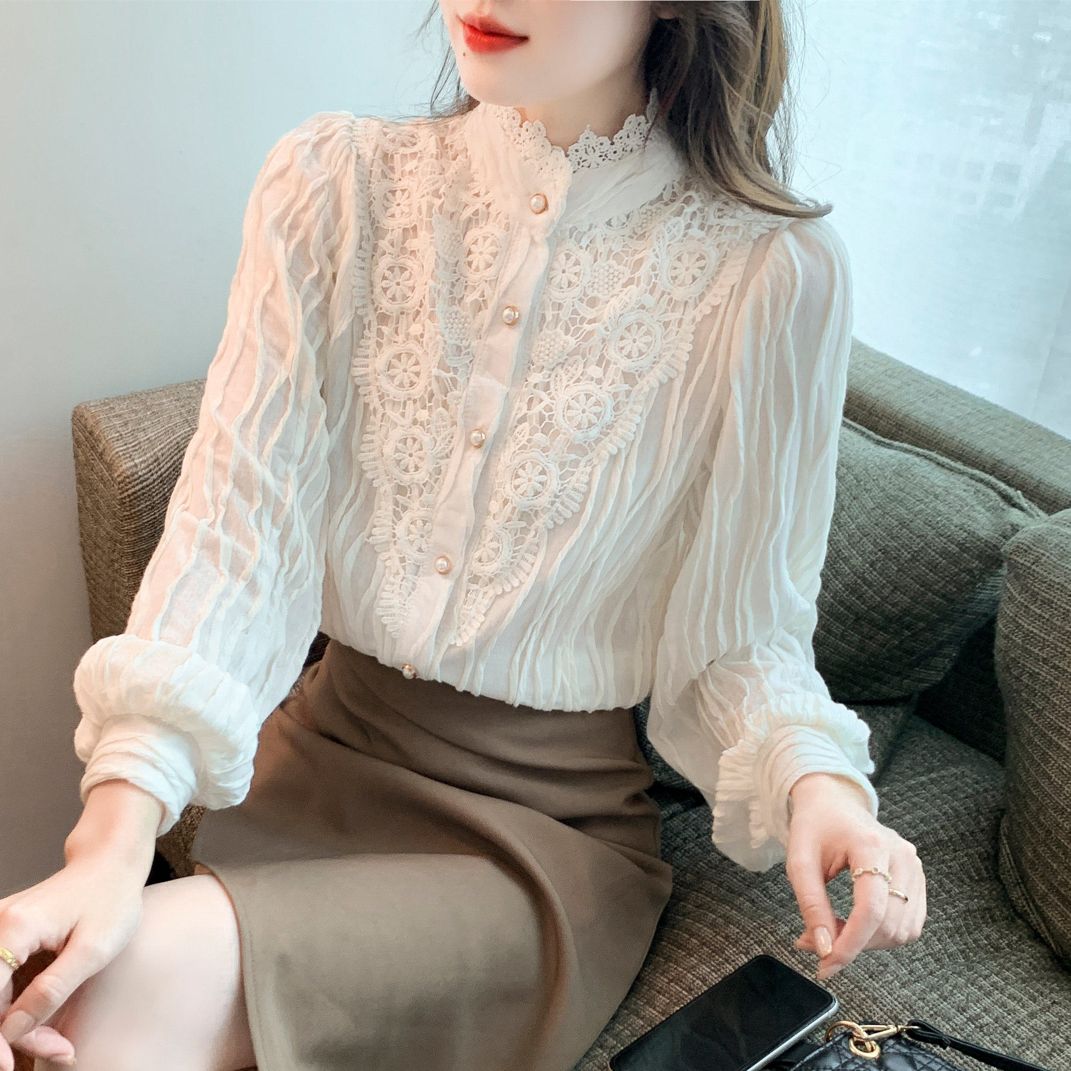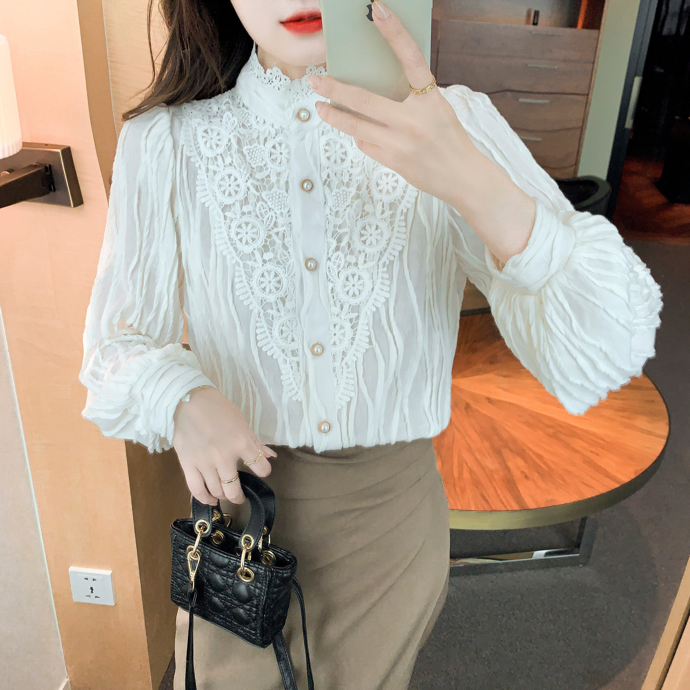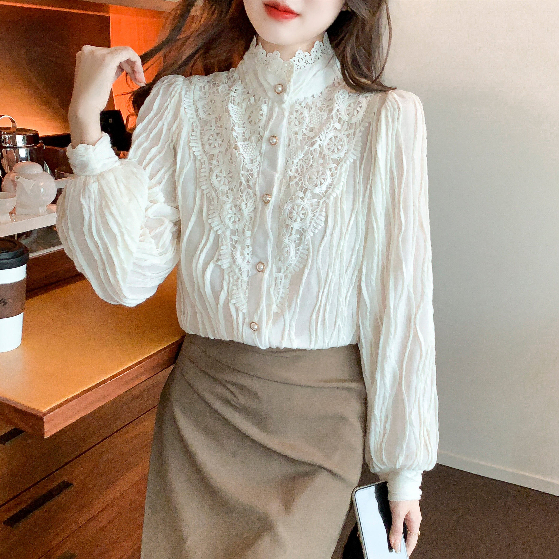Осенняя рубашка, шифоновый кружевной шелковый приятный телу лонгслив, в западном стиле, коллекция 2023, высокий воротник