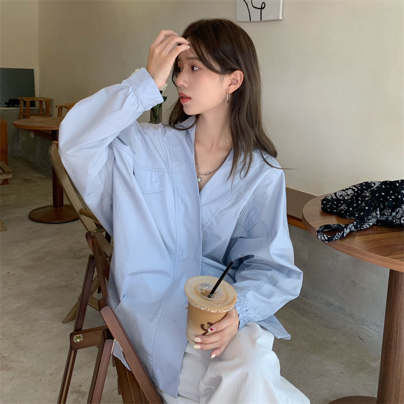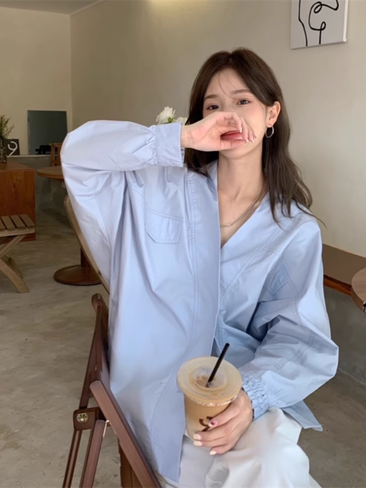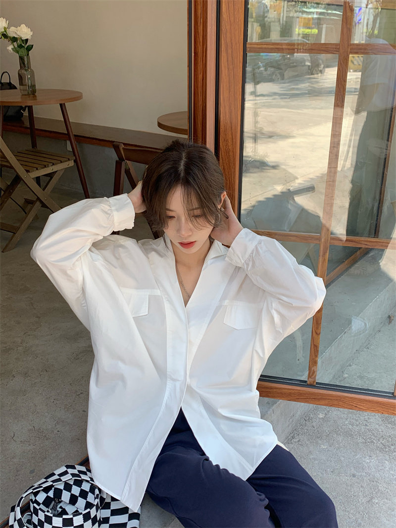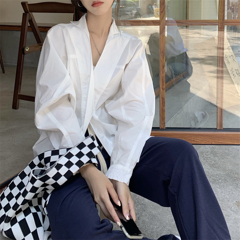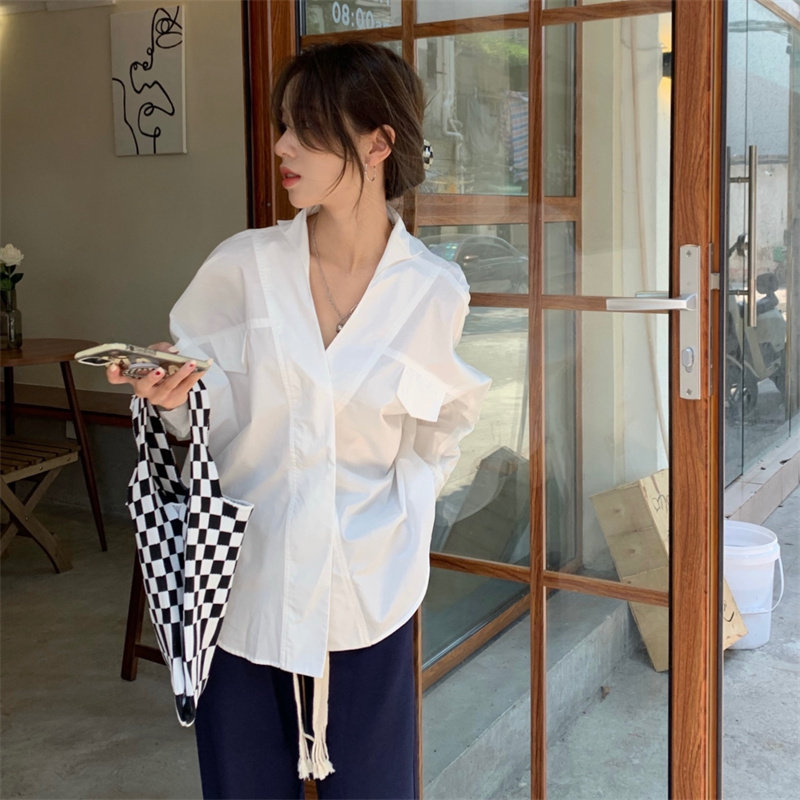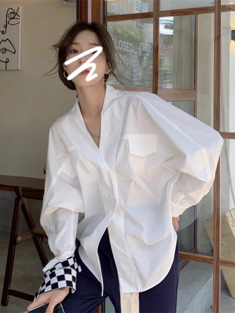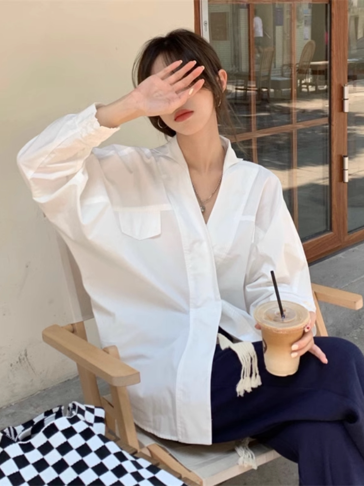Белая дизайнерская осенняя рубашка для отдыха, V-образный вырез, свободный крой, стиль