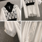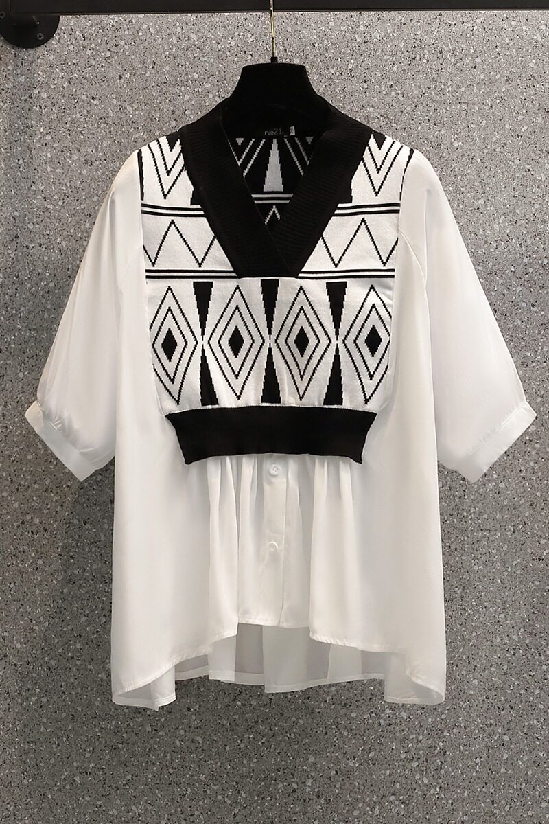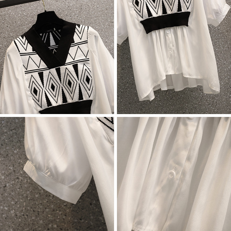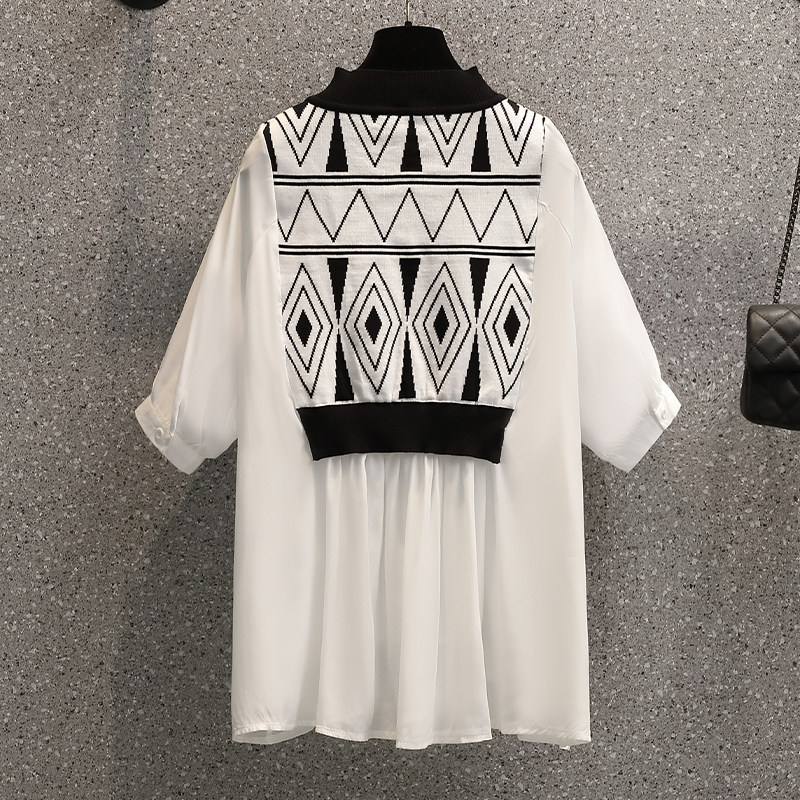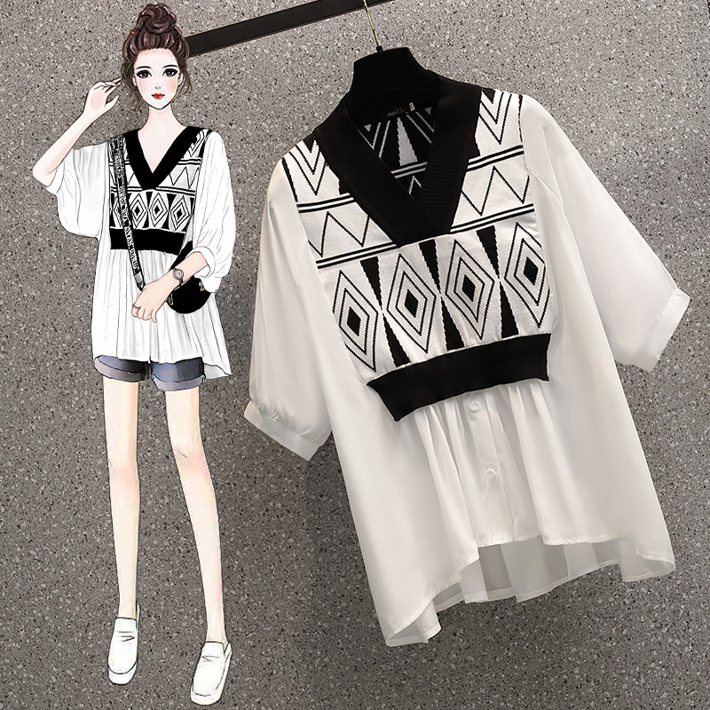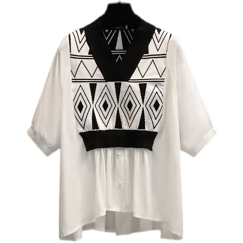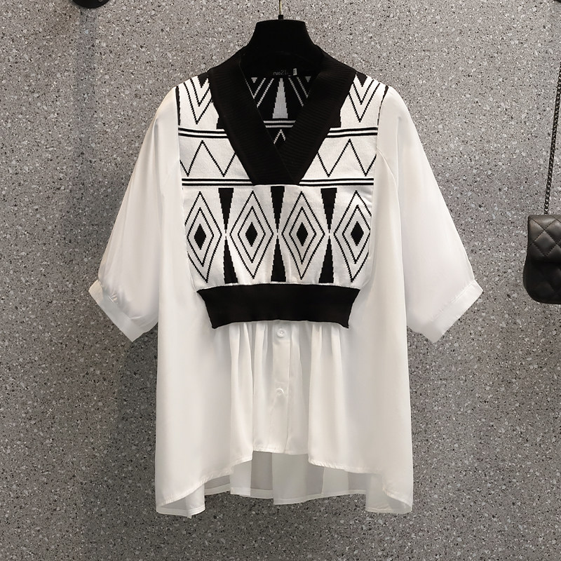 Летний комплект, рубашка, универсальная футболка, большой размер, имитация рубашки, подходит для полных девушек, V-образный вырез, короткий рукав