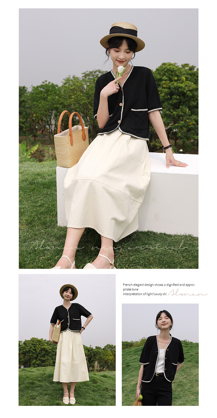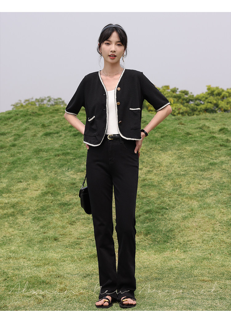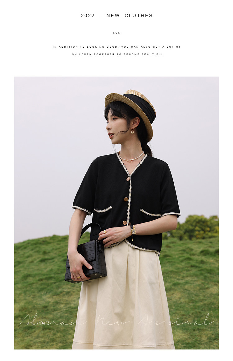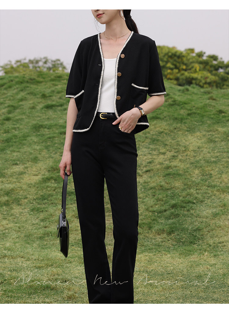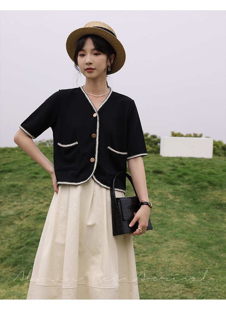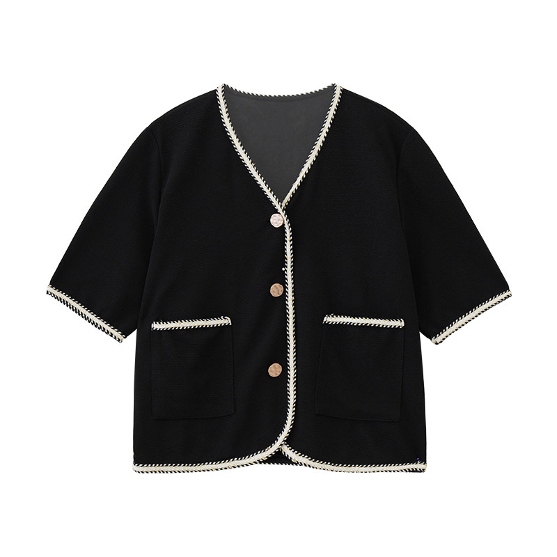Черный летний модный кардиган, V-образный вырез, коллекция 2022, французский стиль, в стиле Шанель, короткий рукав