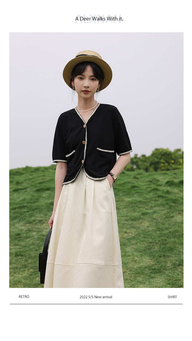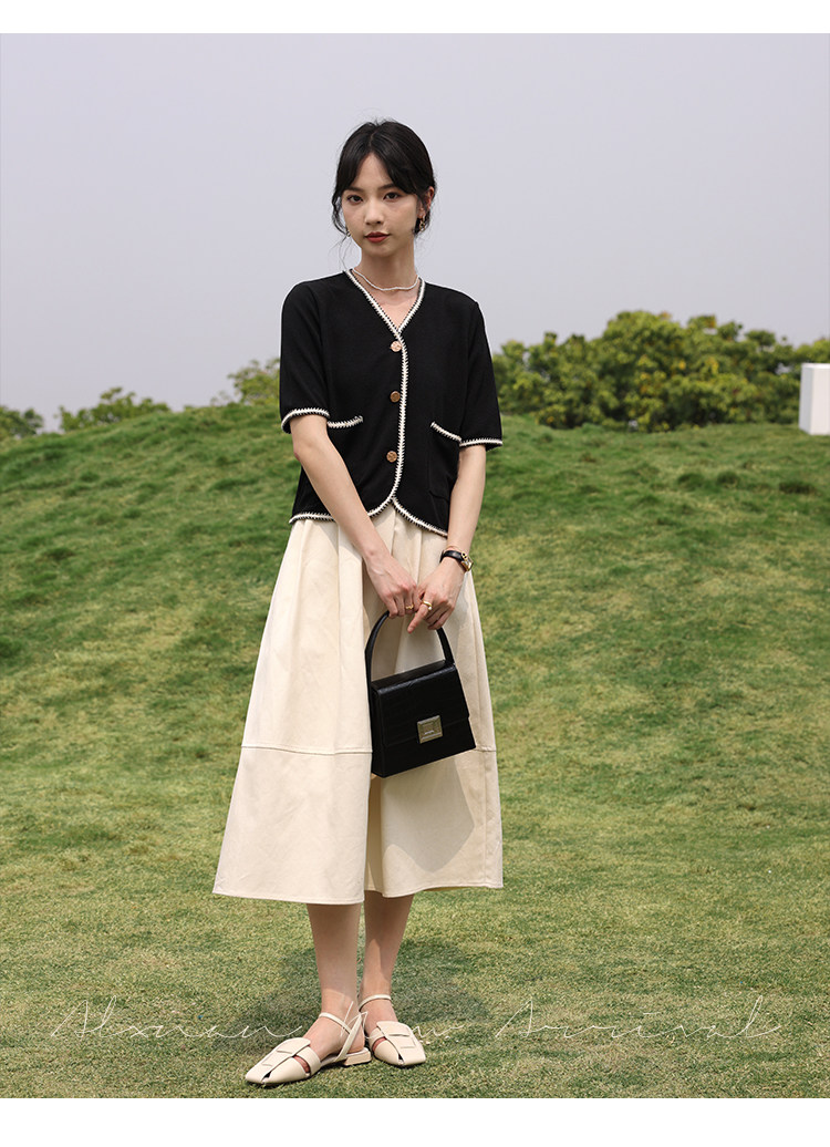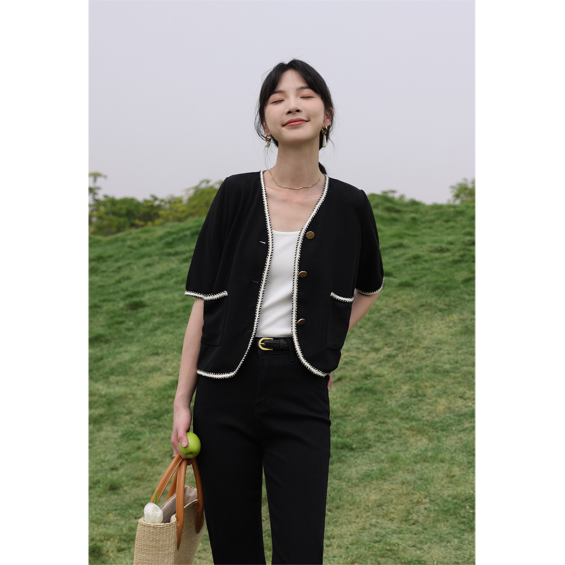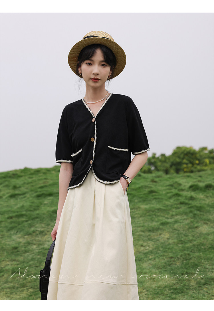 Черный летний модный кардиган, V-образный вырез, коллекция 2022, французский стиль, в стиле Шанель, короткий рукав