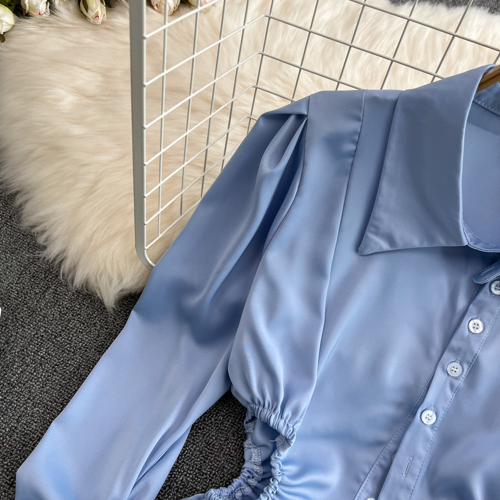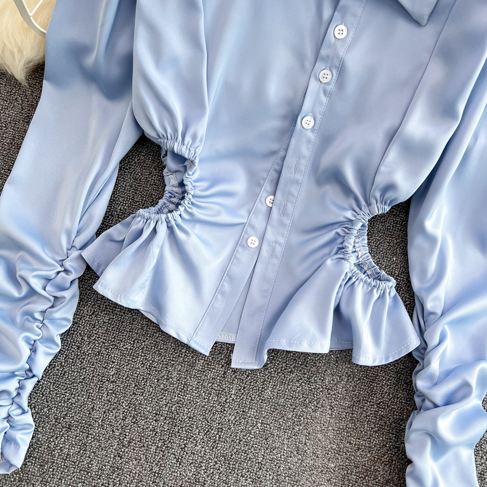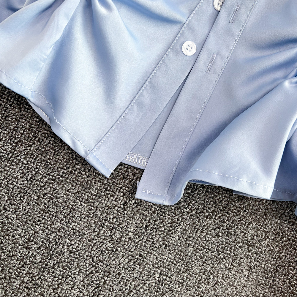 Весенняя дизайнерская синяя рубашка, короткий лонгслив, тренд сезона, яркий броский стиль, в западном стиле