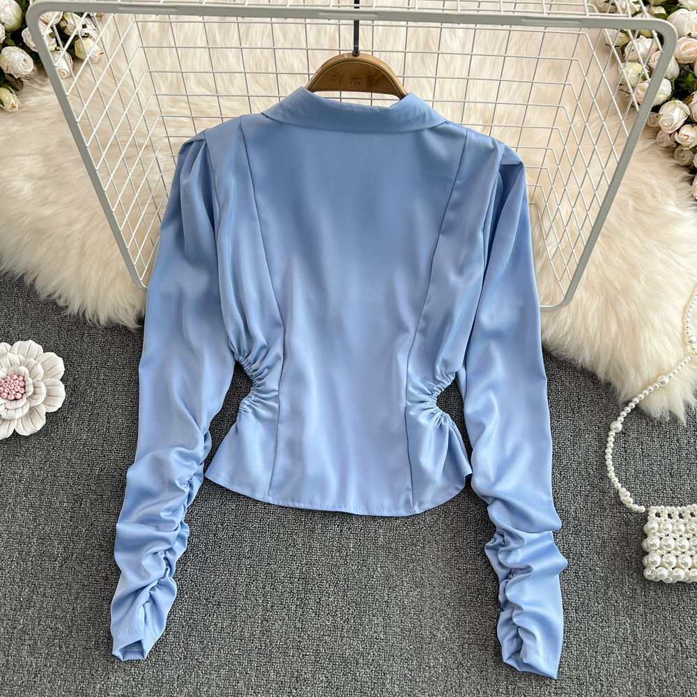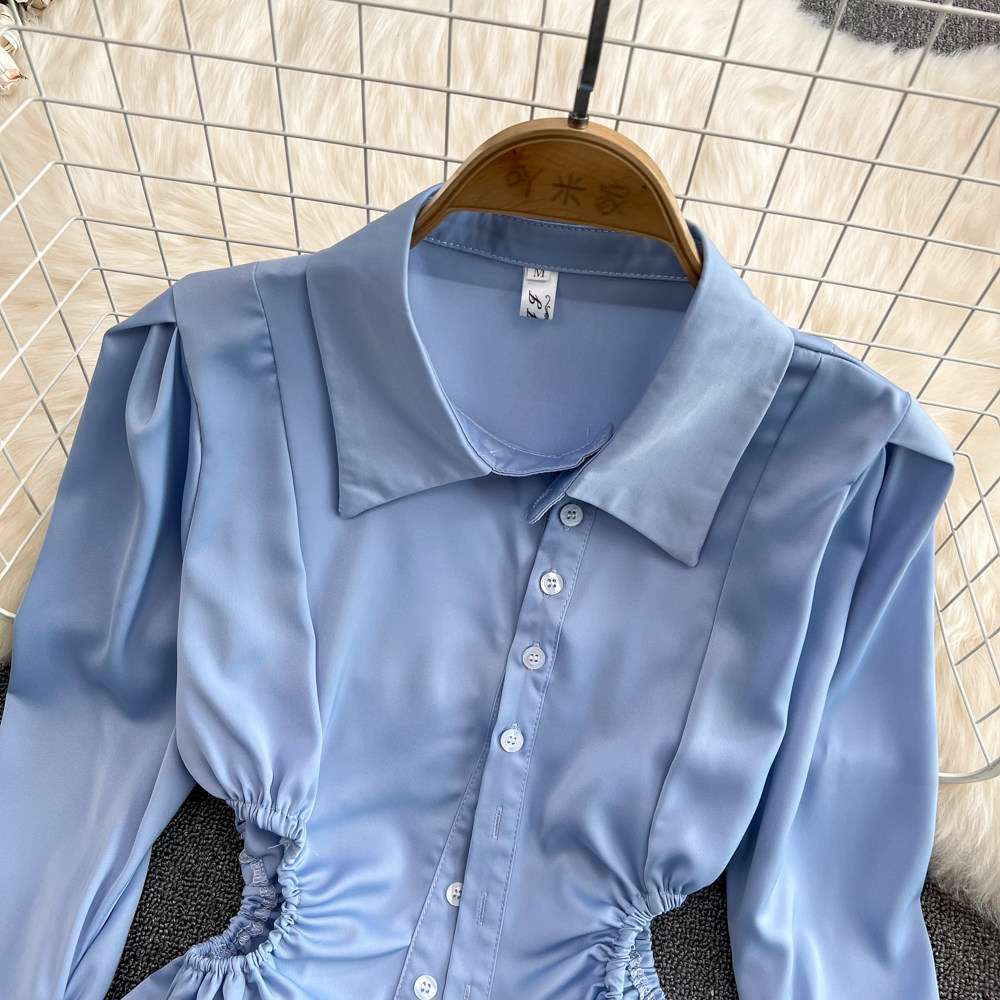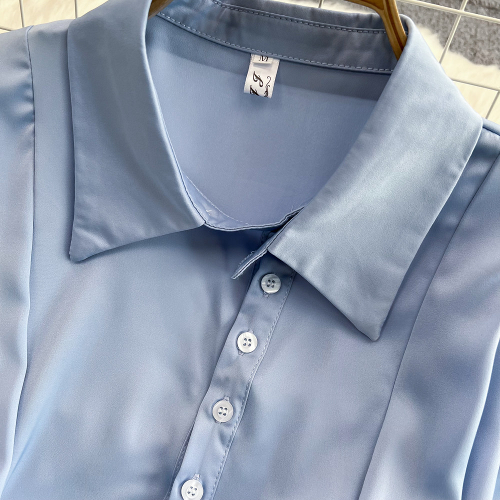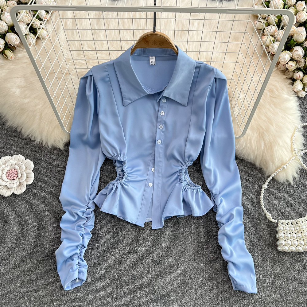 Весенняя дизайнерская синяя рубашка, короткий лонгслив, тренд сезона, яркий броский стиль, в западном стиле