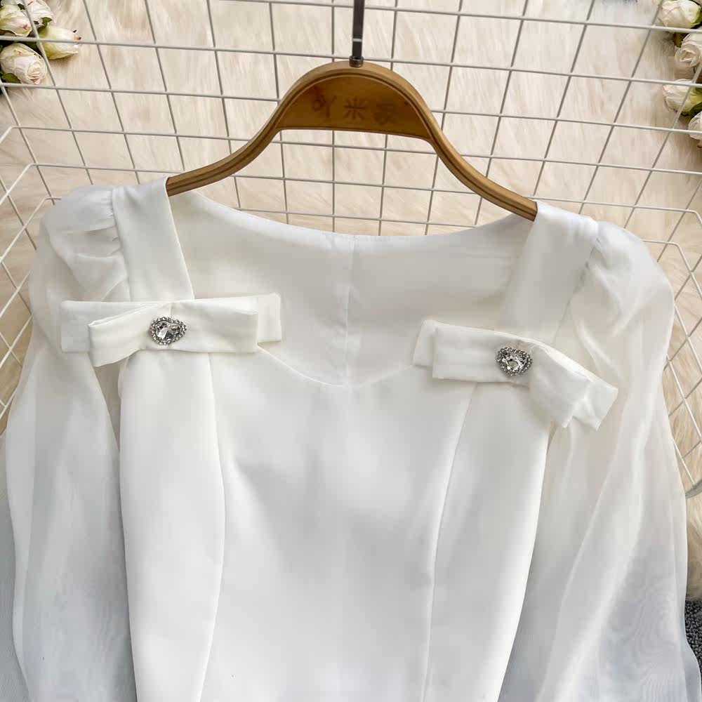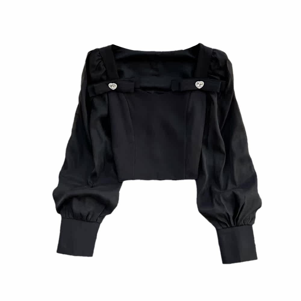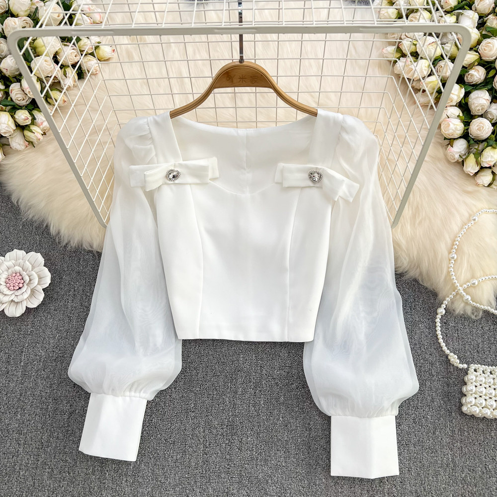 Весенние модные нарукавники с бантиком, короткая рубашка, тренд сезона, облегающий крой, квадратный вырез, рукава фонарики, в западном стиле