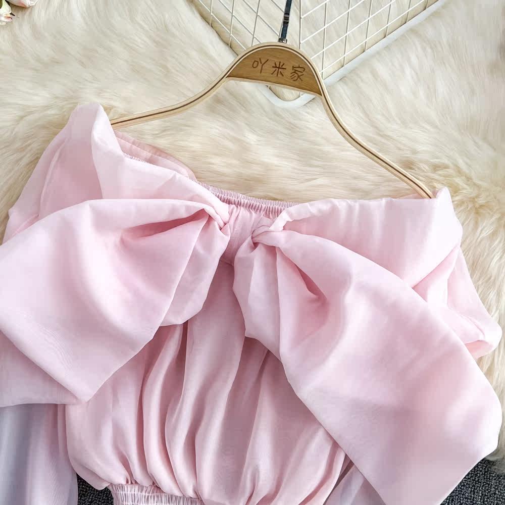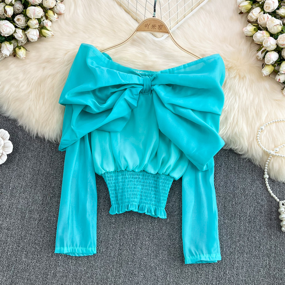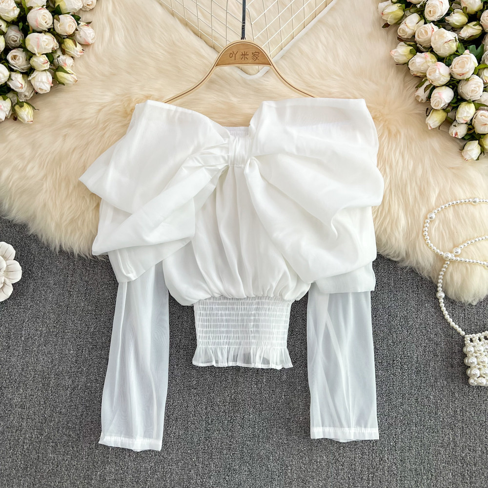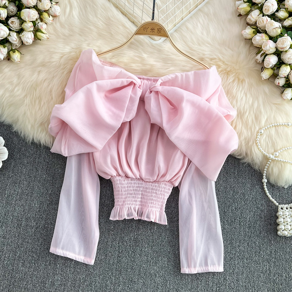 Весенняя рубашка с бантиком, лонгслив, в корейском стиле, рукава фонарики, открытые плечи, в западном стиле