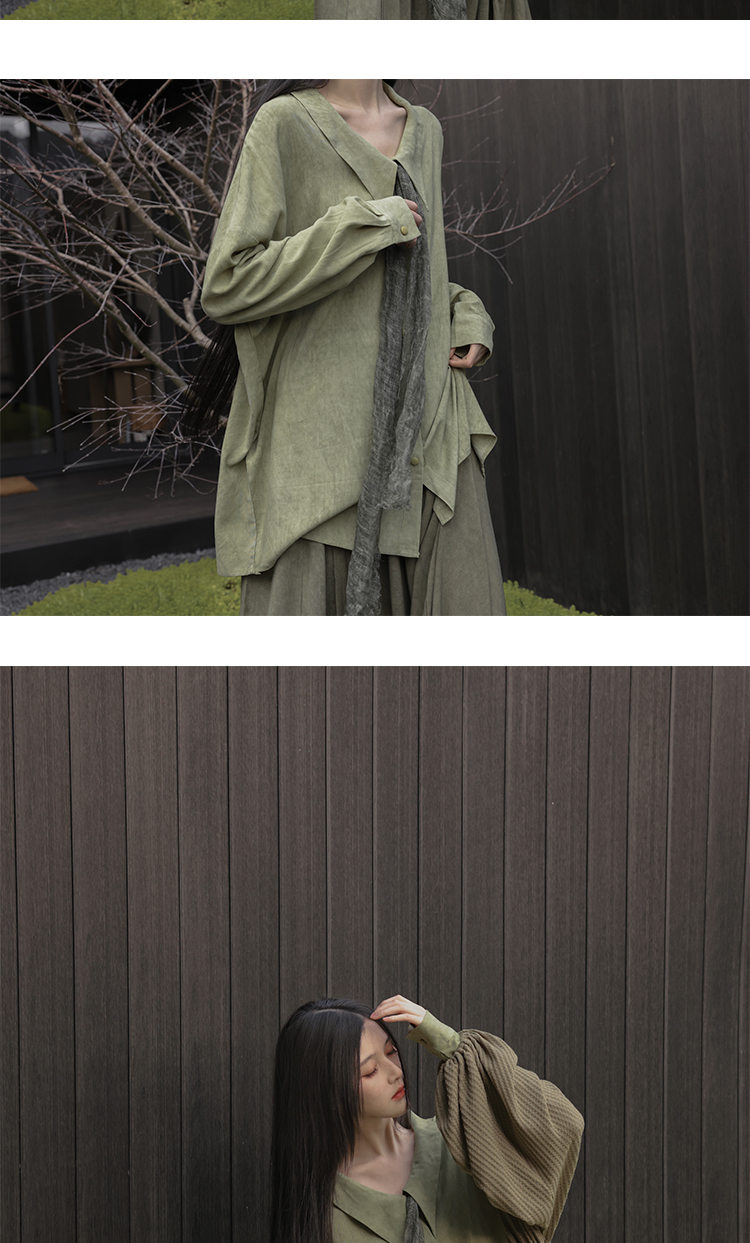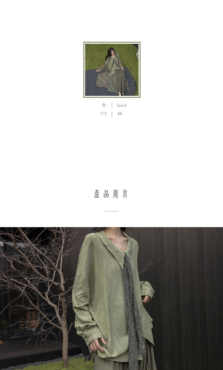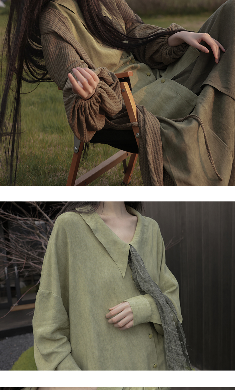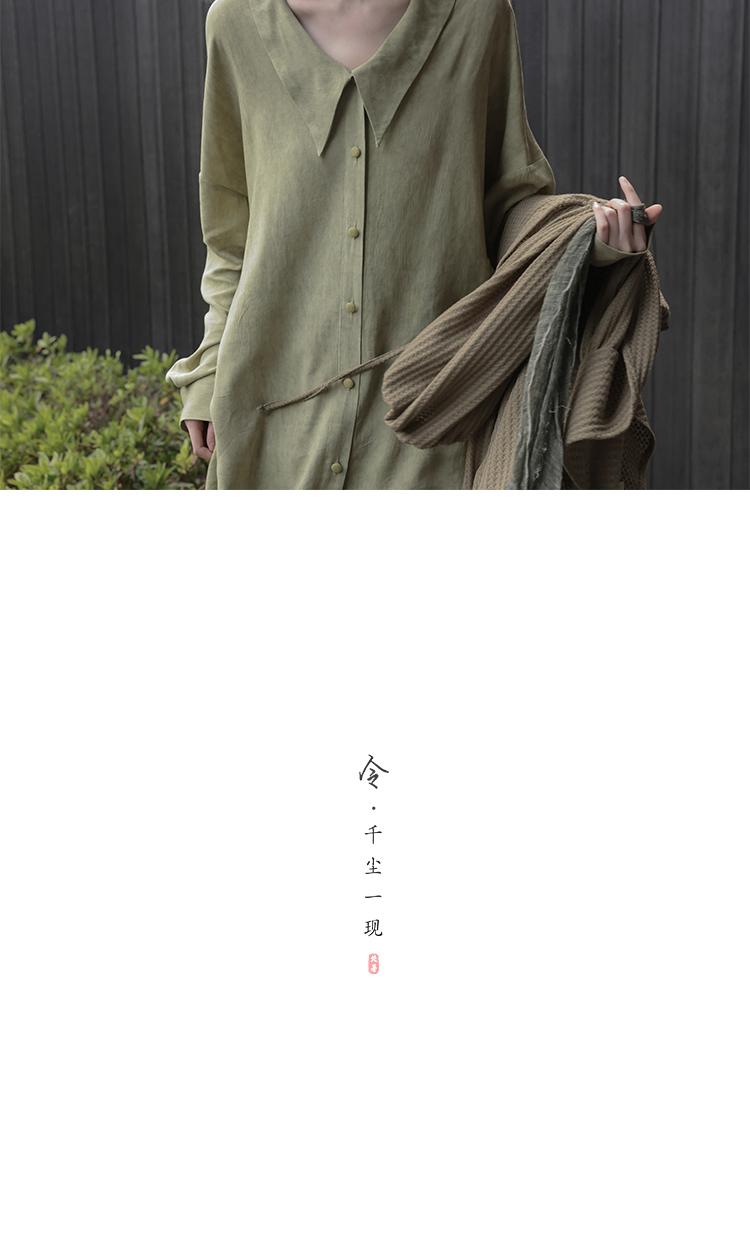 [Lingyi] Чай был зеленым, самостоятельно свободным, цветом с перемешиванием, белой, удобной, длинной повседневной рубашкой