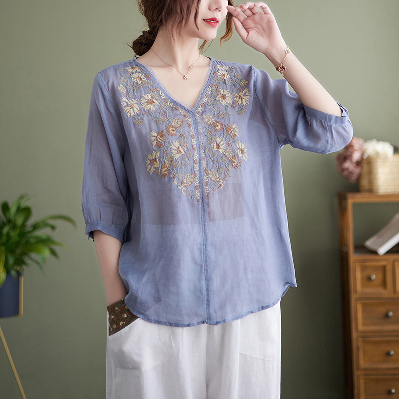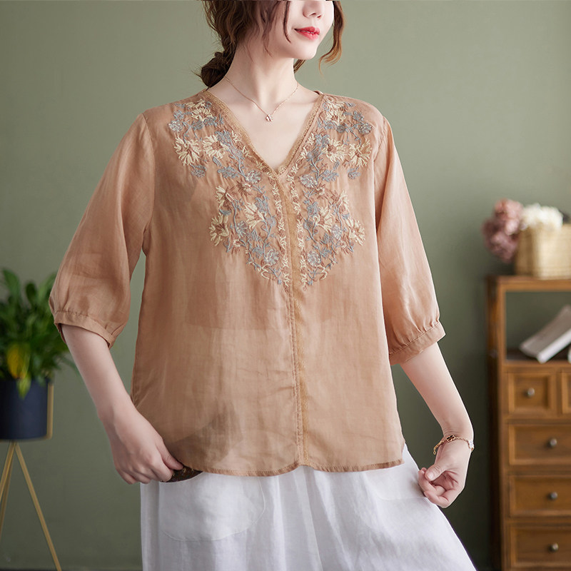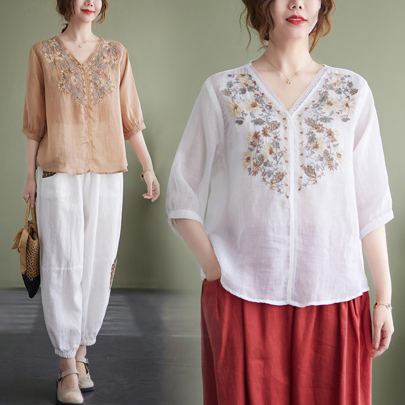 (Трансграничная торговля), брендовая рубашка, из хлопка и льна, V-образный вырез, с вышивкой
